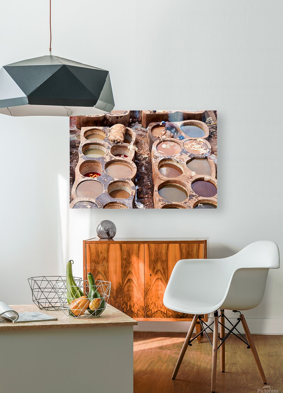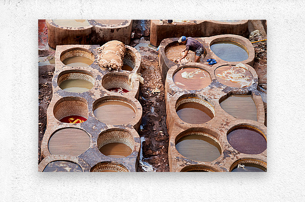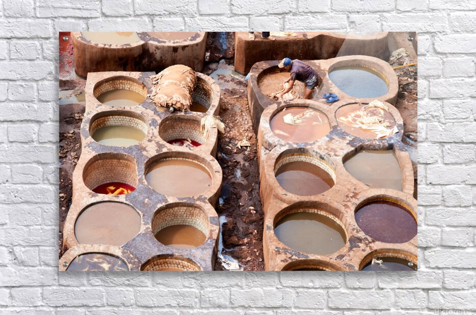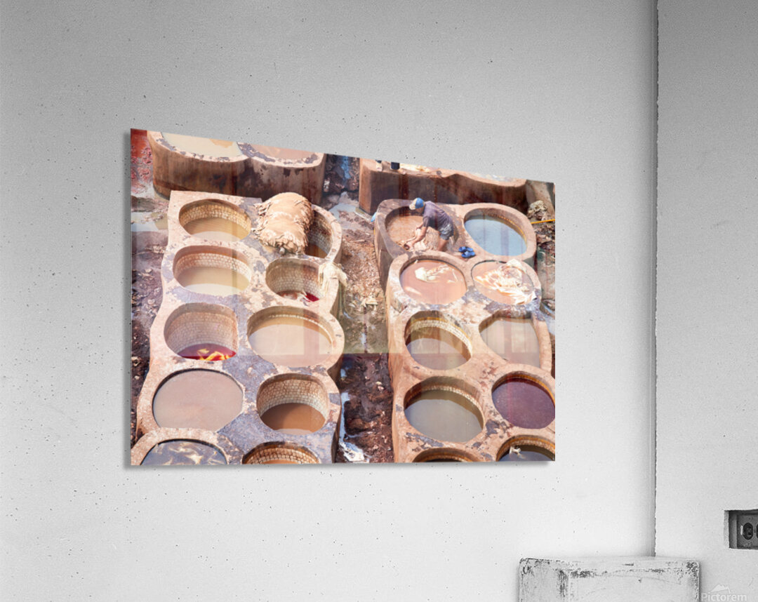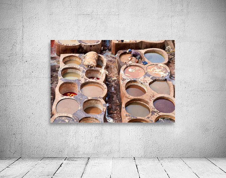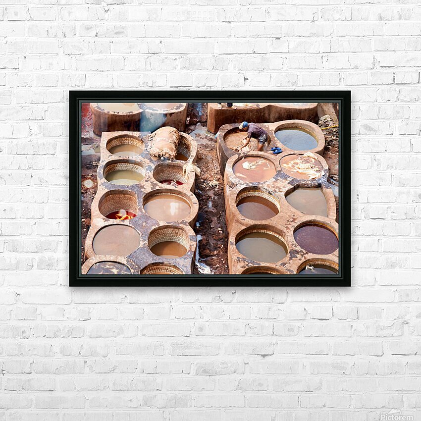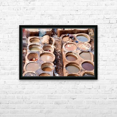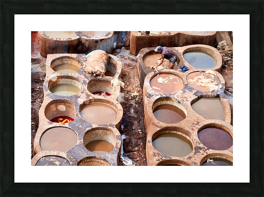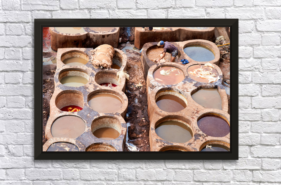 "Workers processing leather at Chouara Tannery in Fez Morocco" in a framed print.