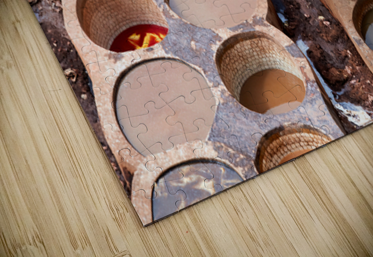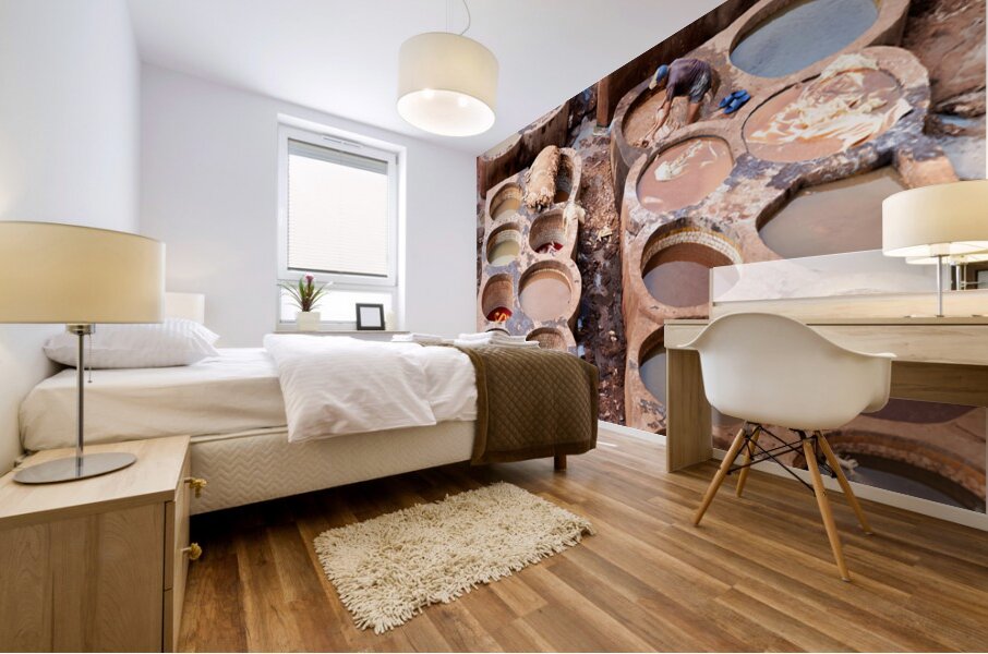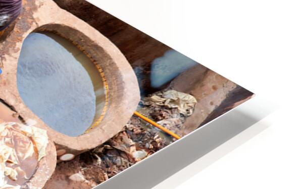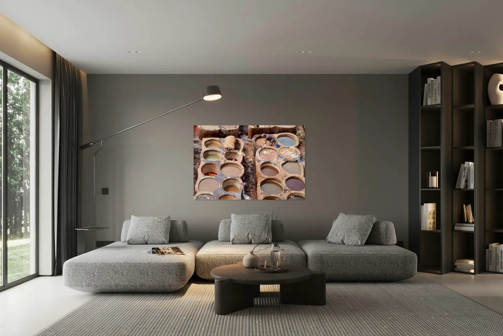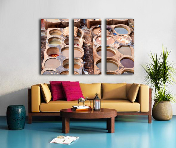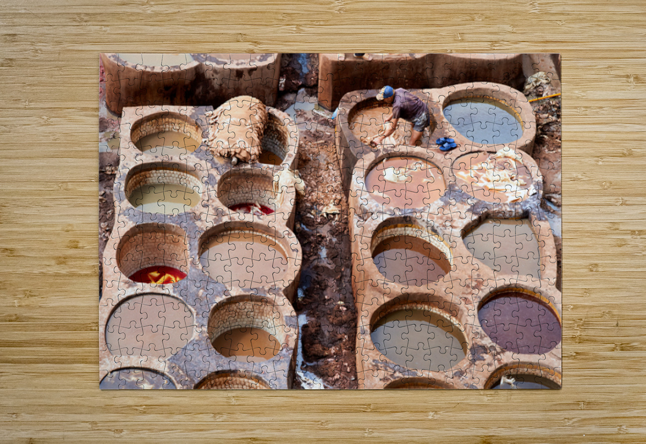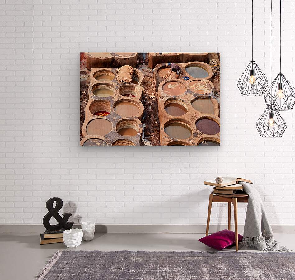 "Workers processing leather at Chouara Tannery in Fez Morocco" in a framed print.