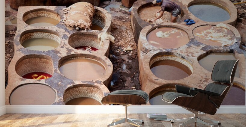 Workers are processing animal hides in large vats at the Chouara Tannery in Fez Morocco. This activity is part of traditional leather making.