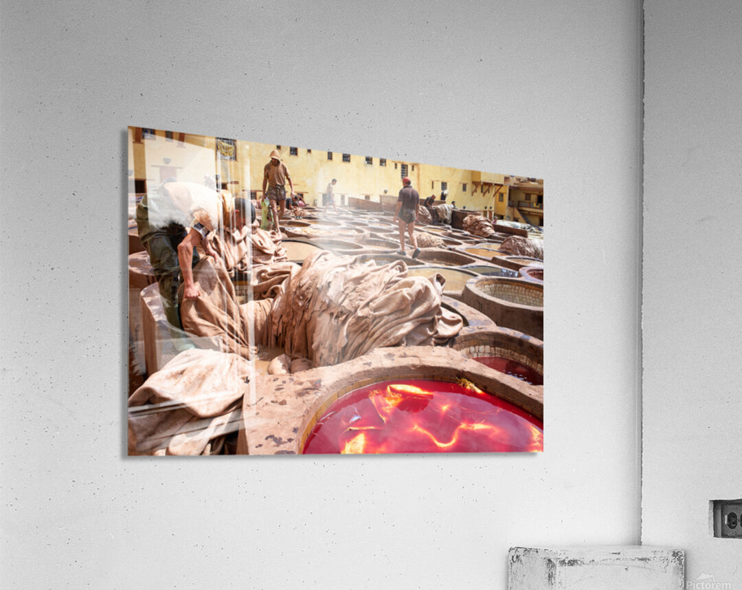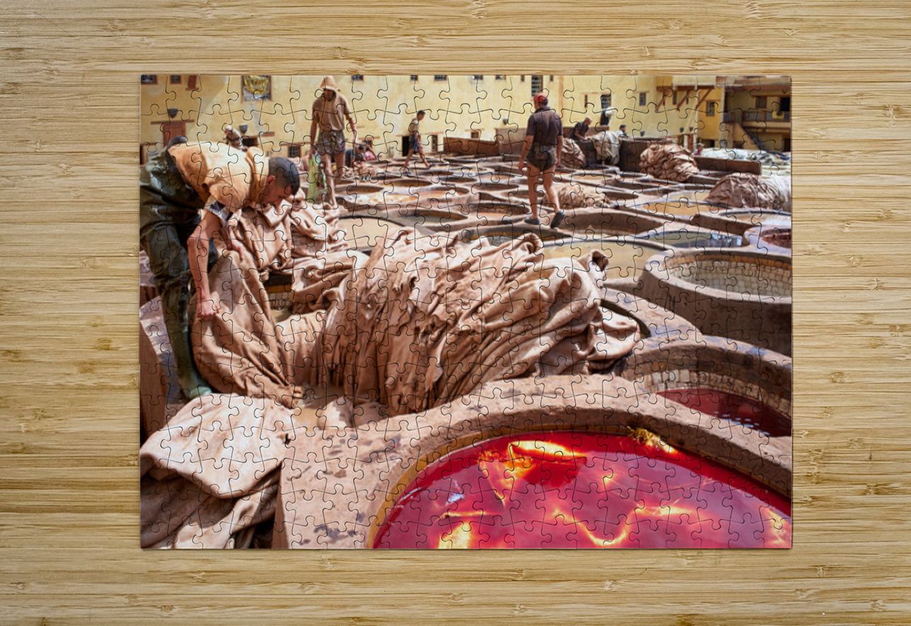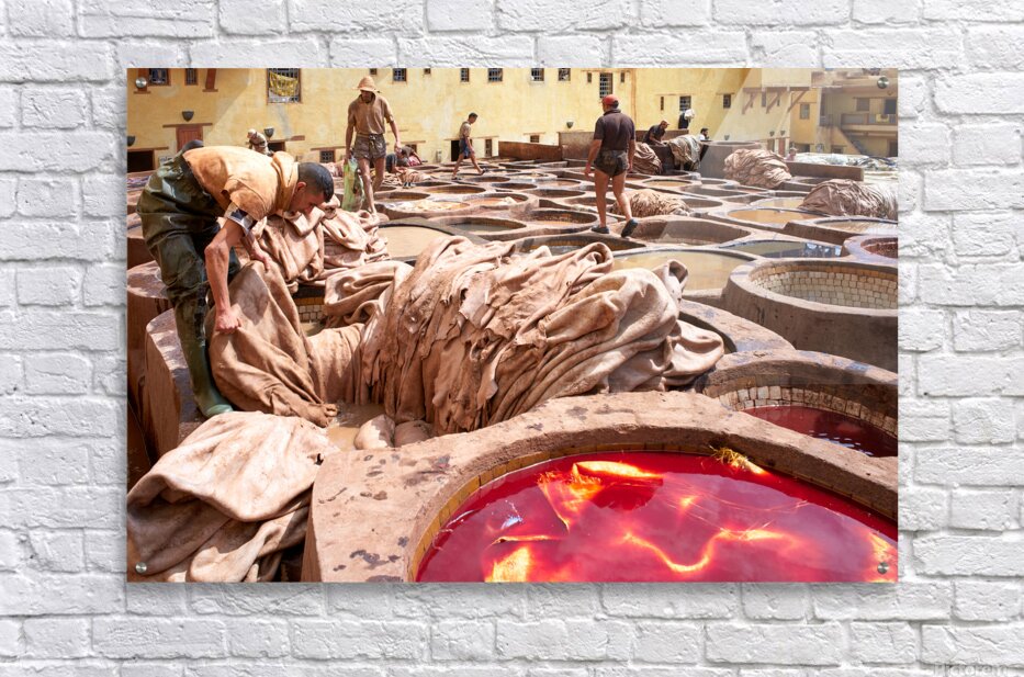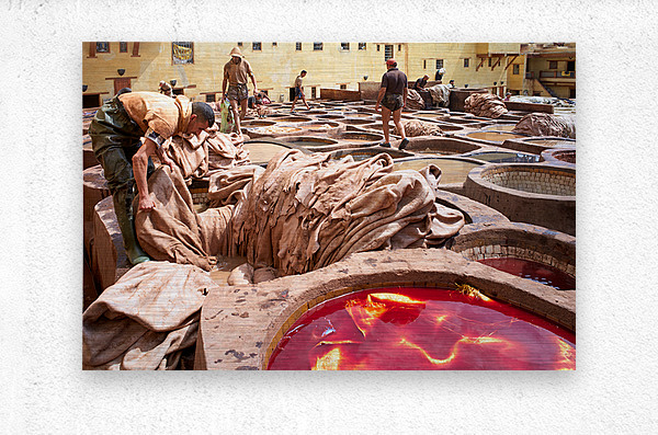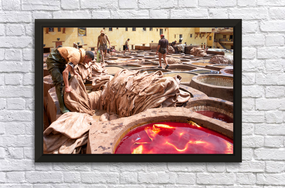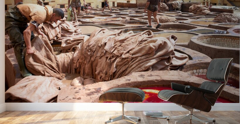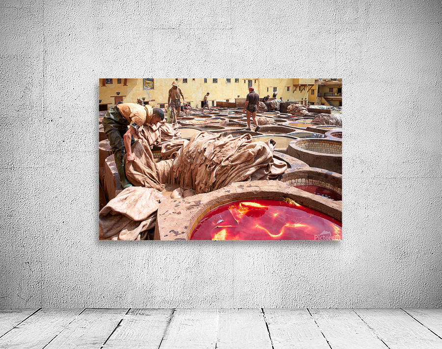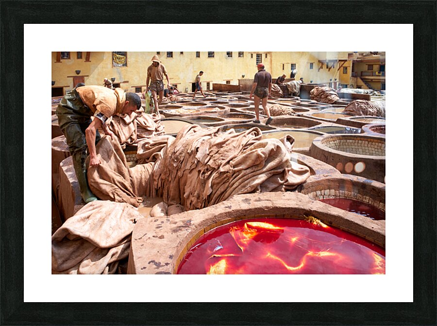 People are busy dyeing leather in large vats filled with colorful liquids at Chouara Tannery in Fez Morocco showcasing traditional methods.
