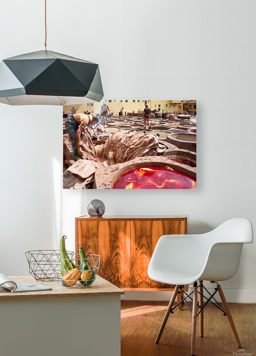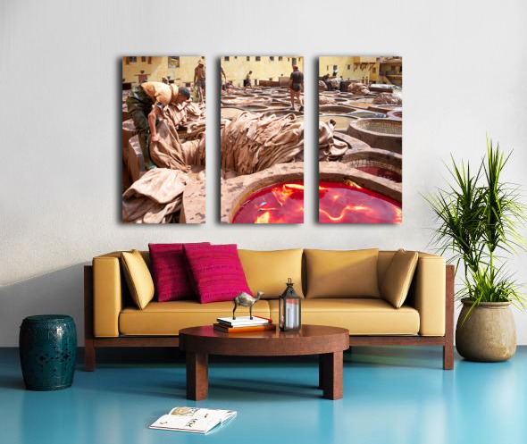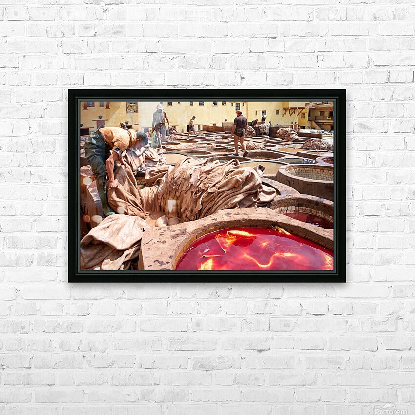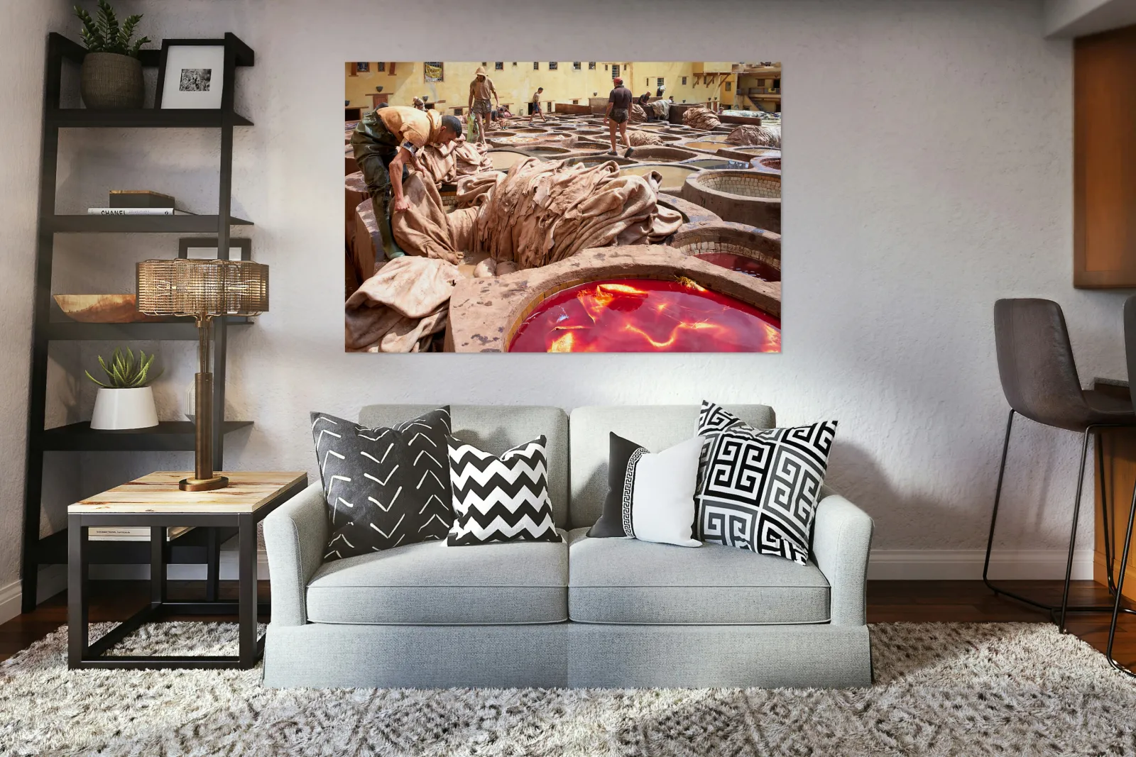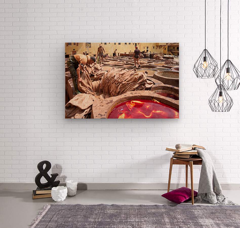 People are busy dyeing leather in large vats filled with colorful liquids at Chouara Tannery in Fez Morocco showcasing traditional methods.
