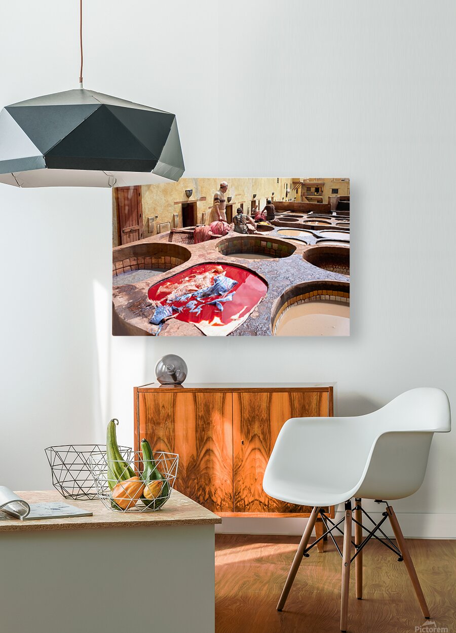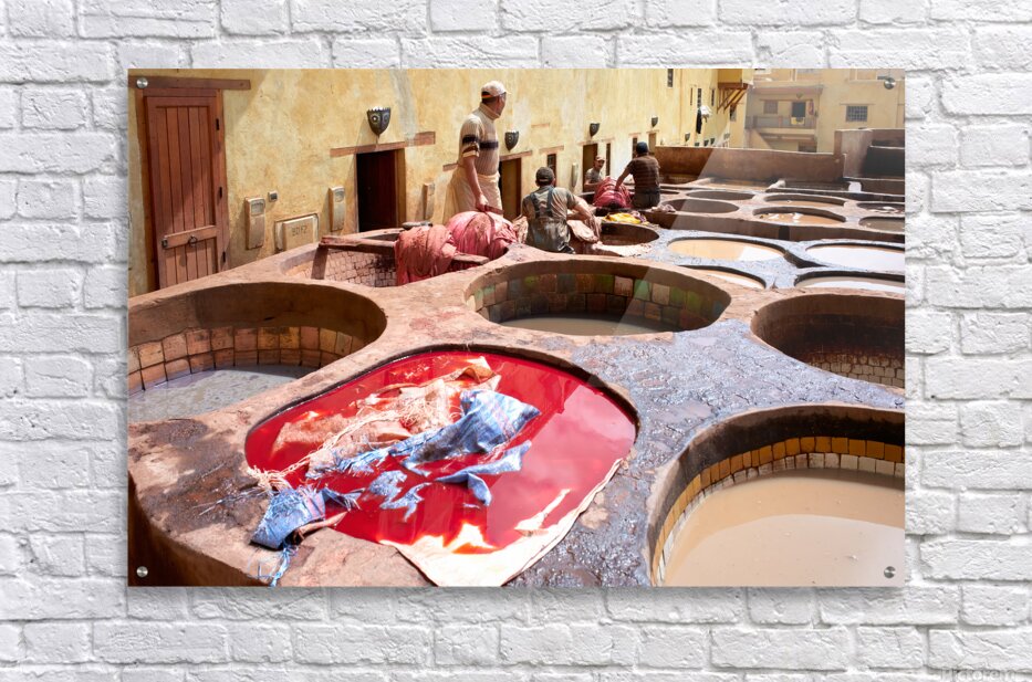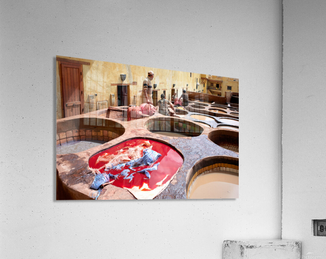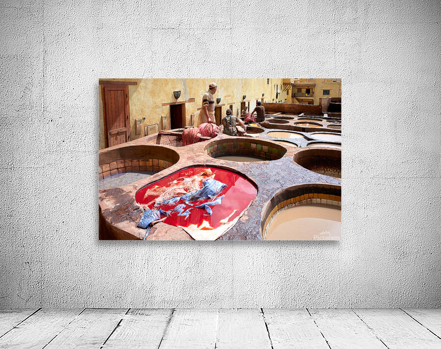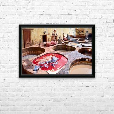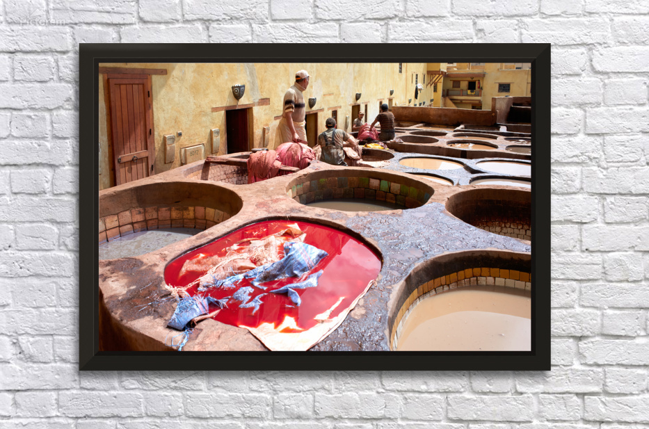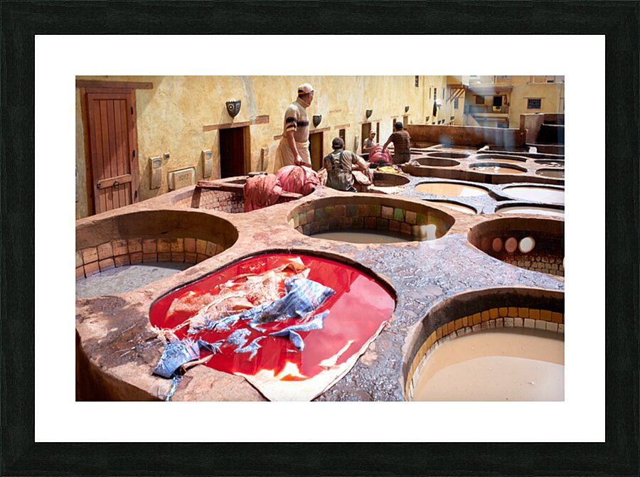 "Workers dyeing leather at Chouara Tannery in Fez Morocco" in a framed print.