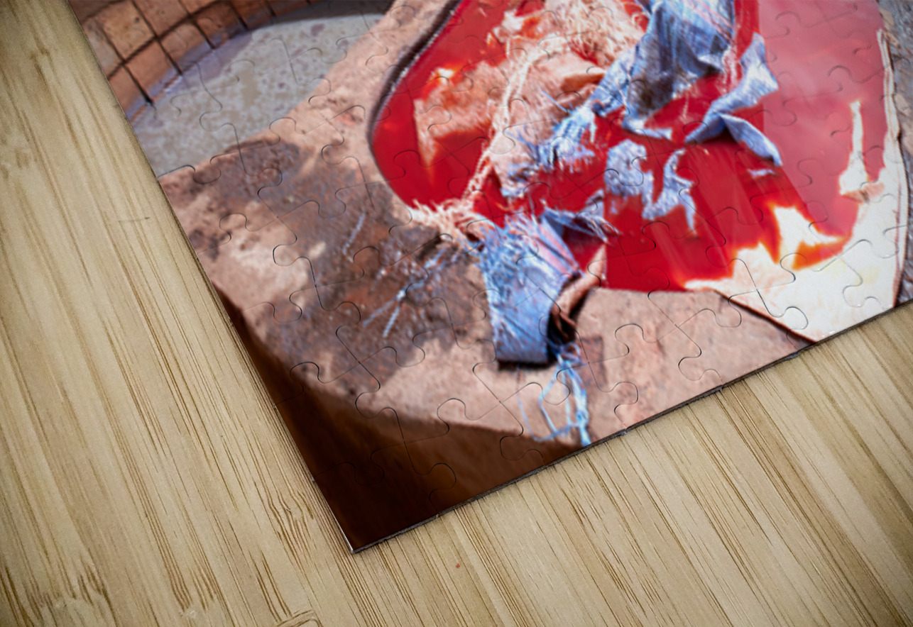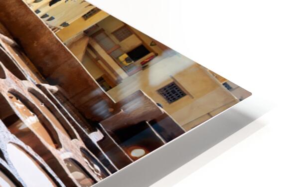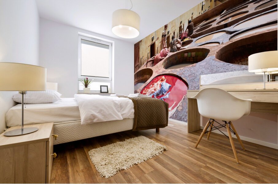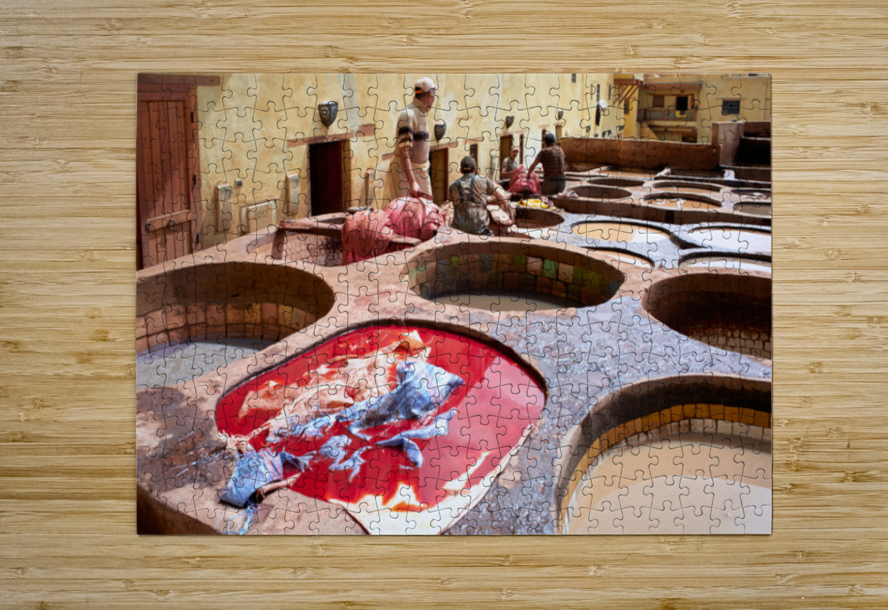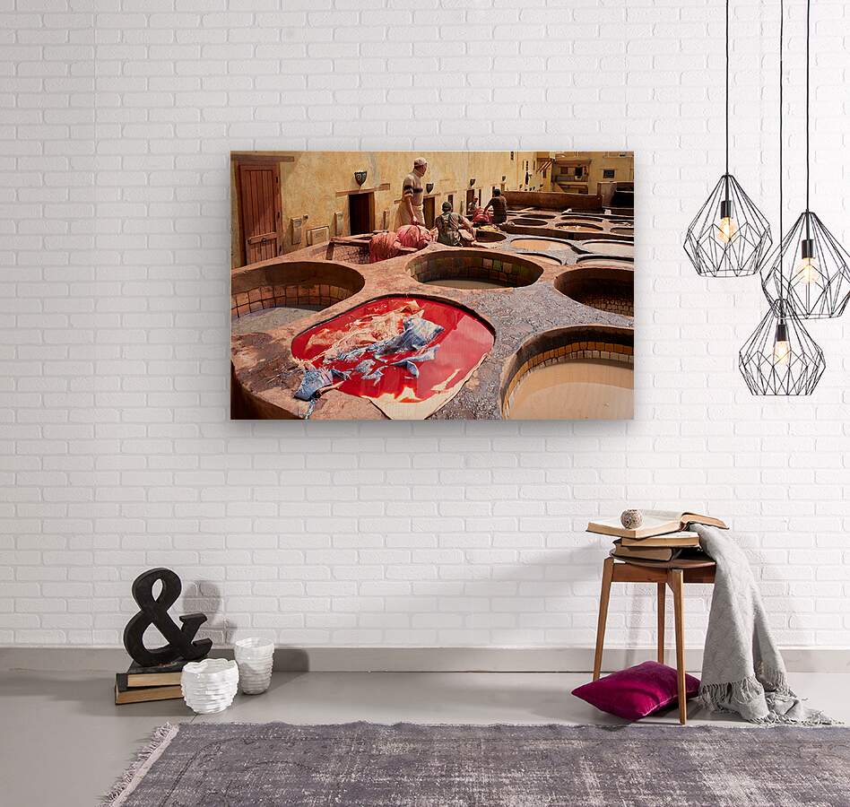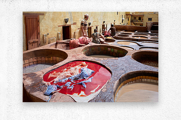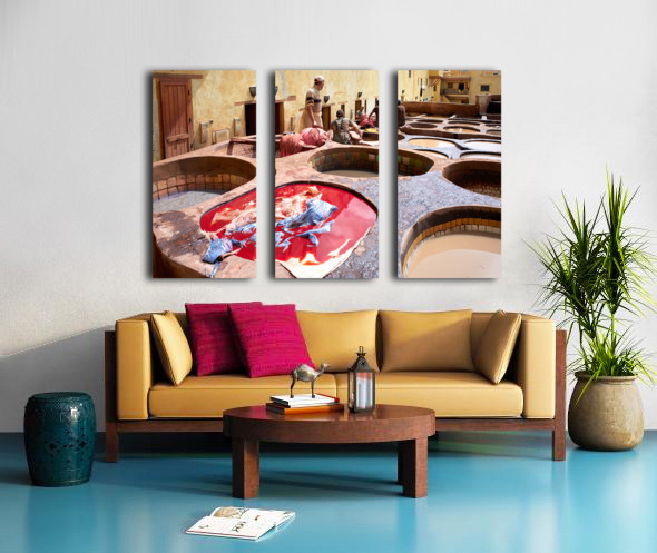 "Workers dyeing leather at Chouara Tannery in Fez Morocco" in a framed print.