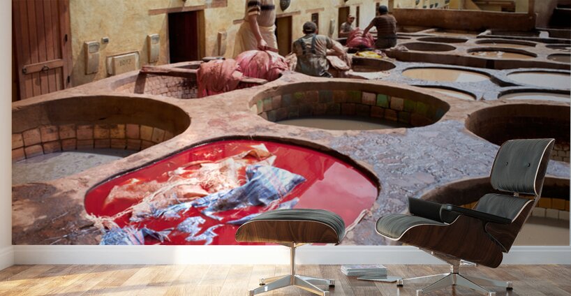 Workers are busy dyeing leather in large vats at Chouara Tannery in Fez Morocco. The vibrant colors fill the space.