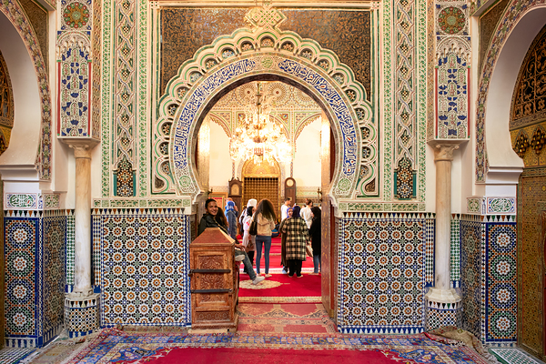 Visitors walk through the archway of Almawla Zaouia Moulay Idriss II mosque in Fez Morocco. The mosque features intricate designs and colorful tiles.
