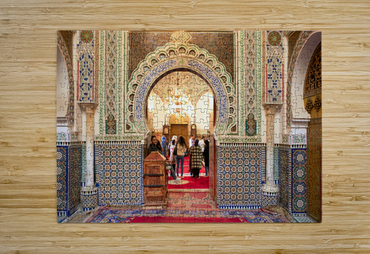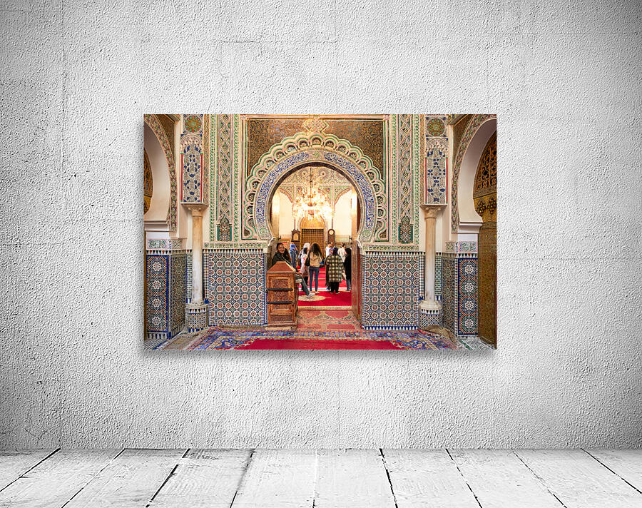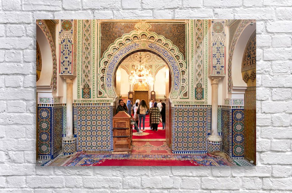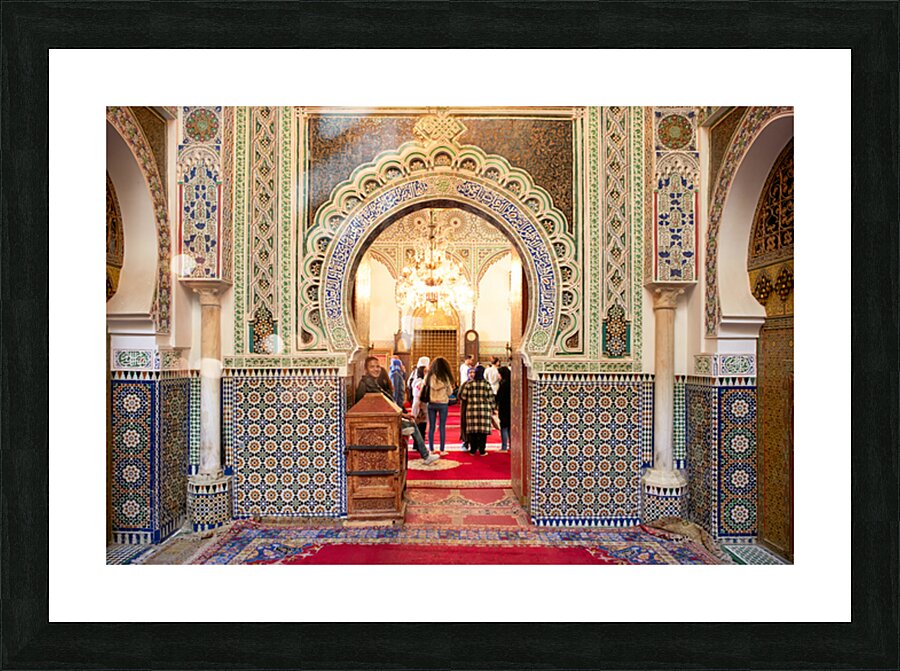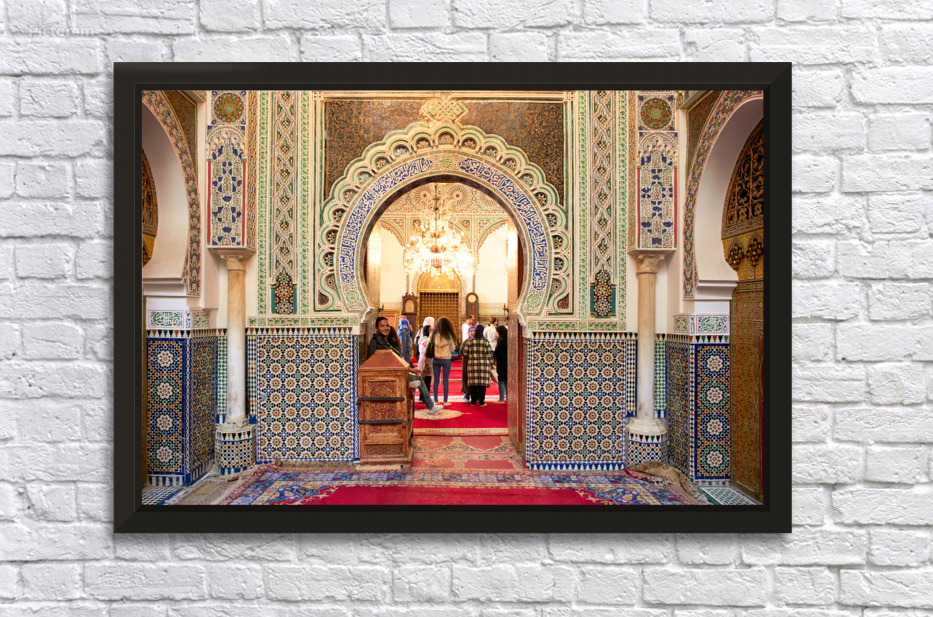 "Exploring Almawla Zaouia Moulay Idriss II mosque in Fez Morocco" in a framed print.
