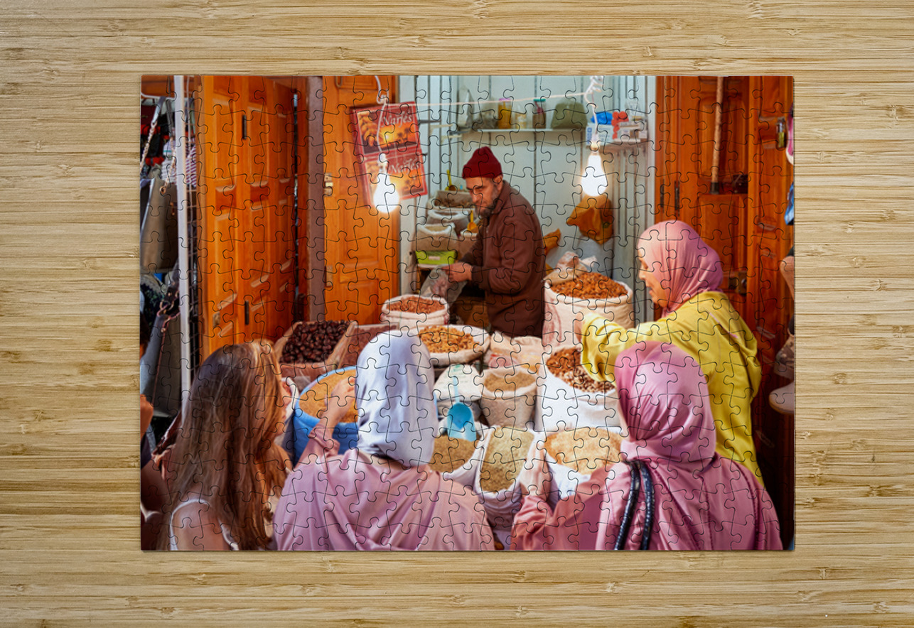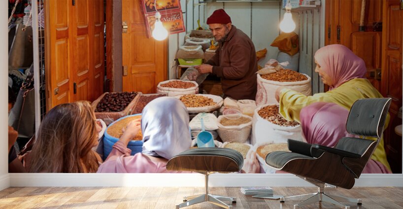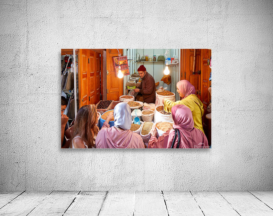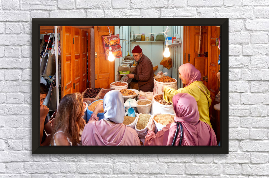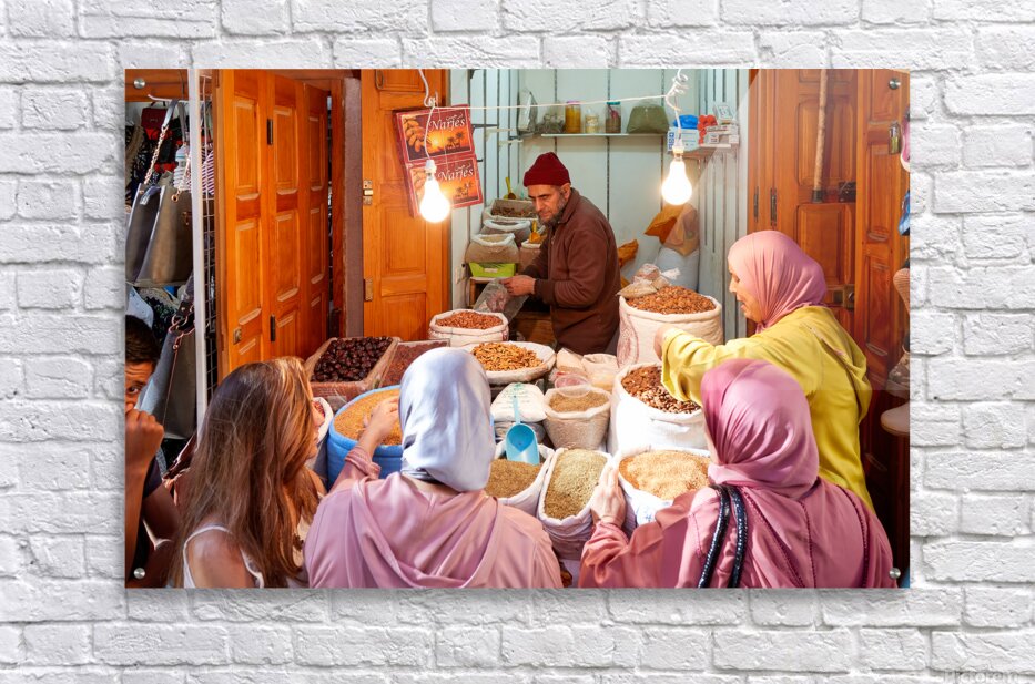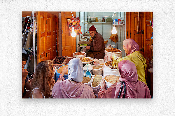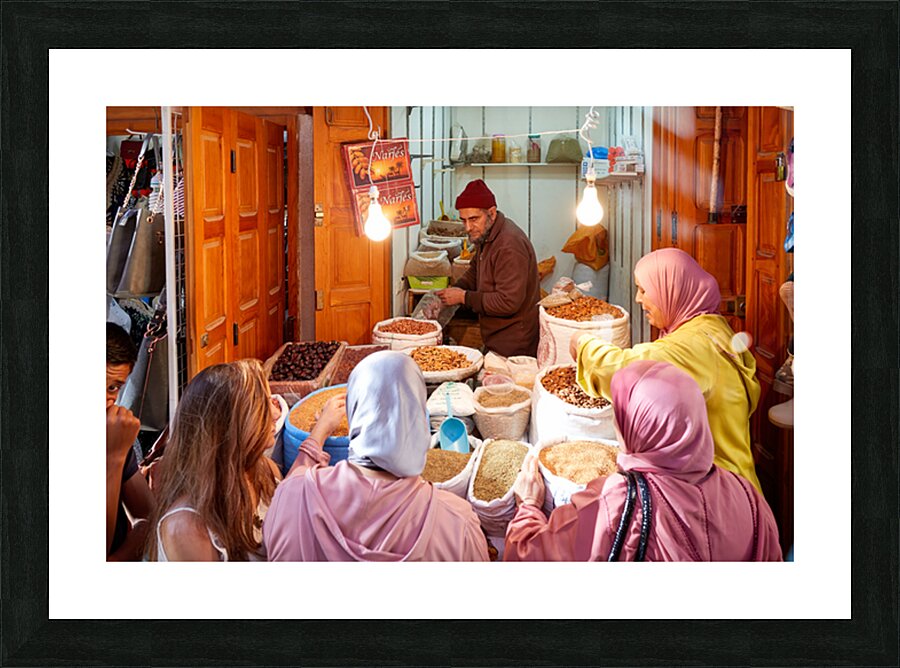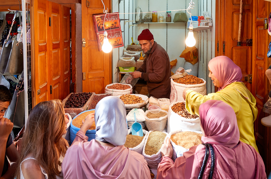 People gather around a vendor selling dried fruits in the Medina of Fez Morocco. Customers choose from various fruits in sacks.