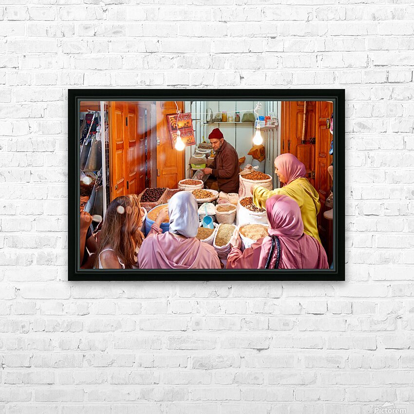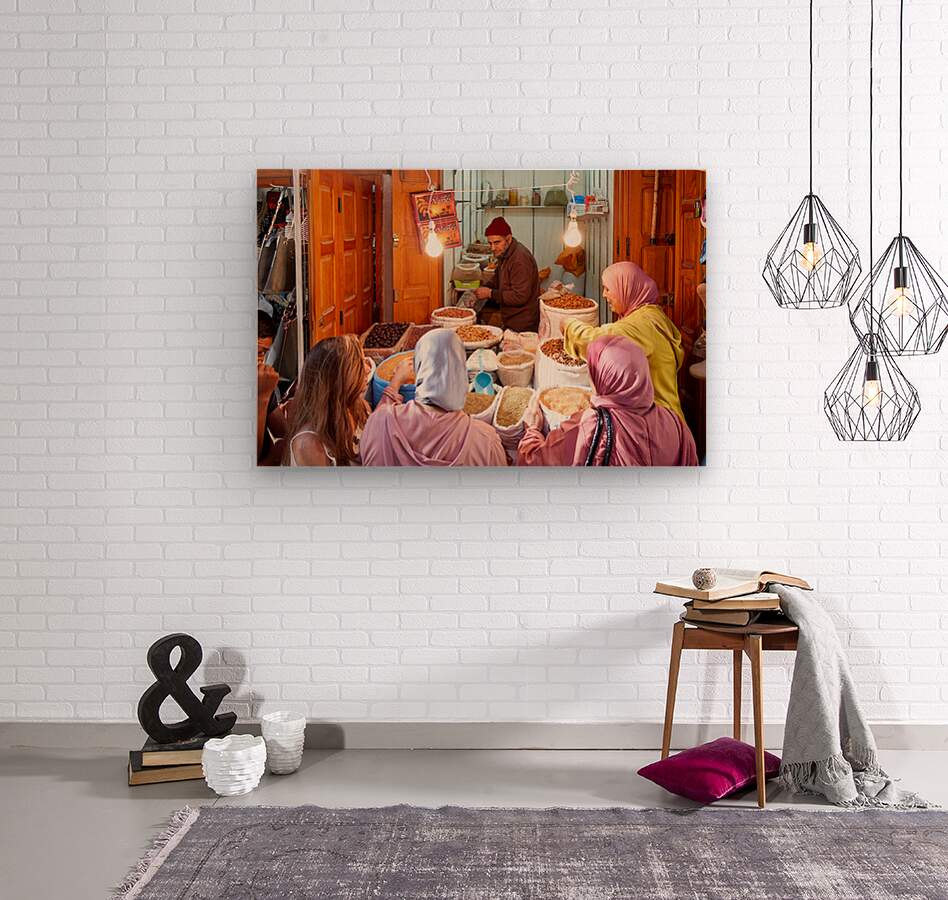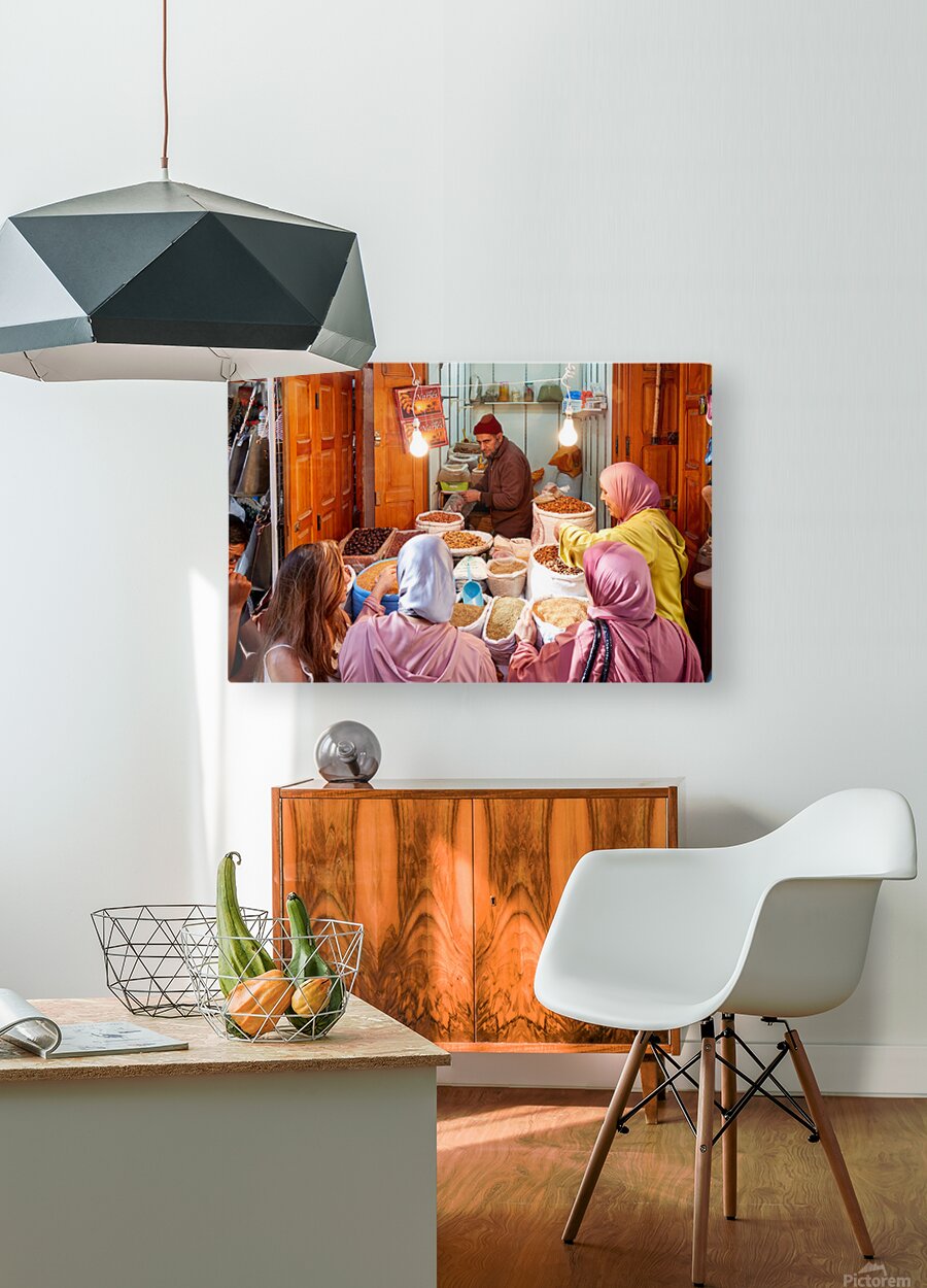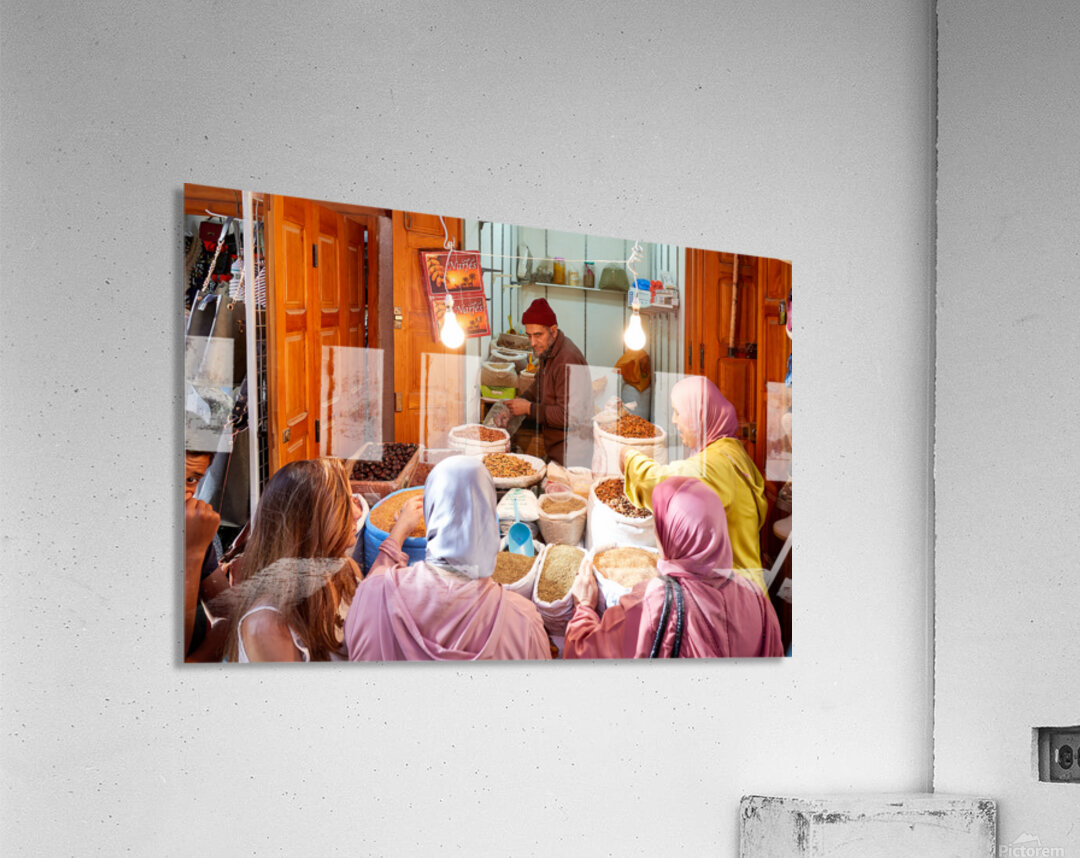 People gather around a vendor selling dried fruits in the Medina of Fez Morocco. Customers choose from various fruits in sacks.