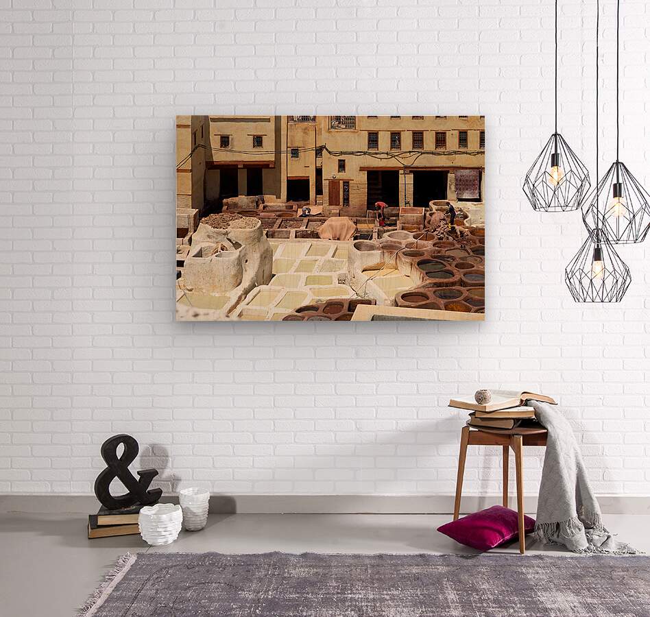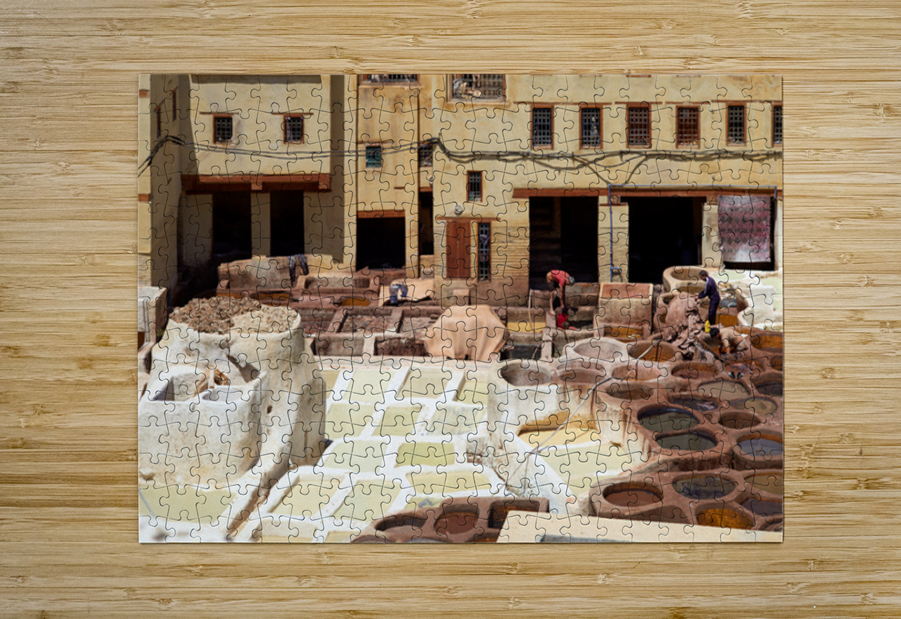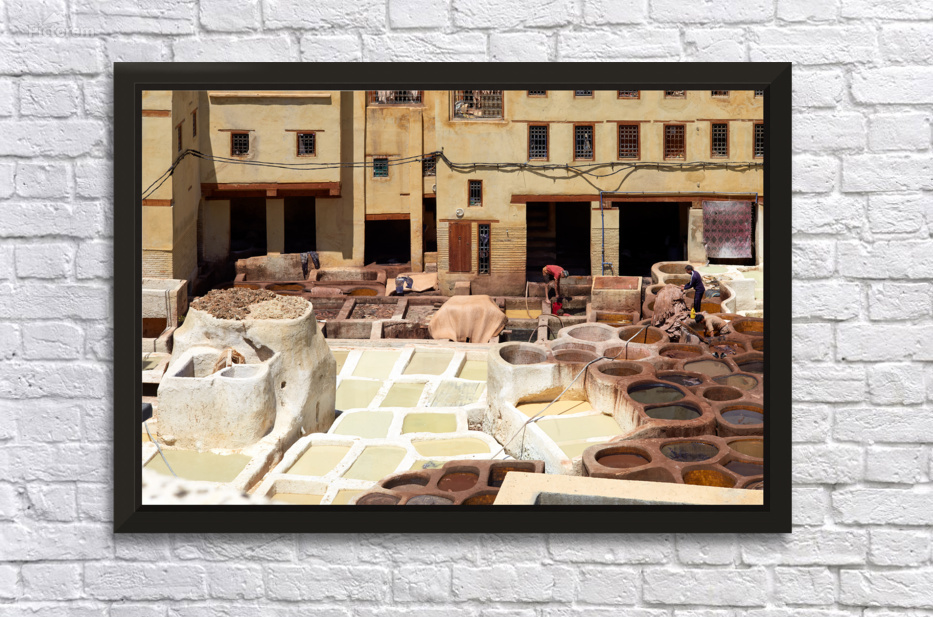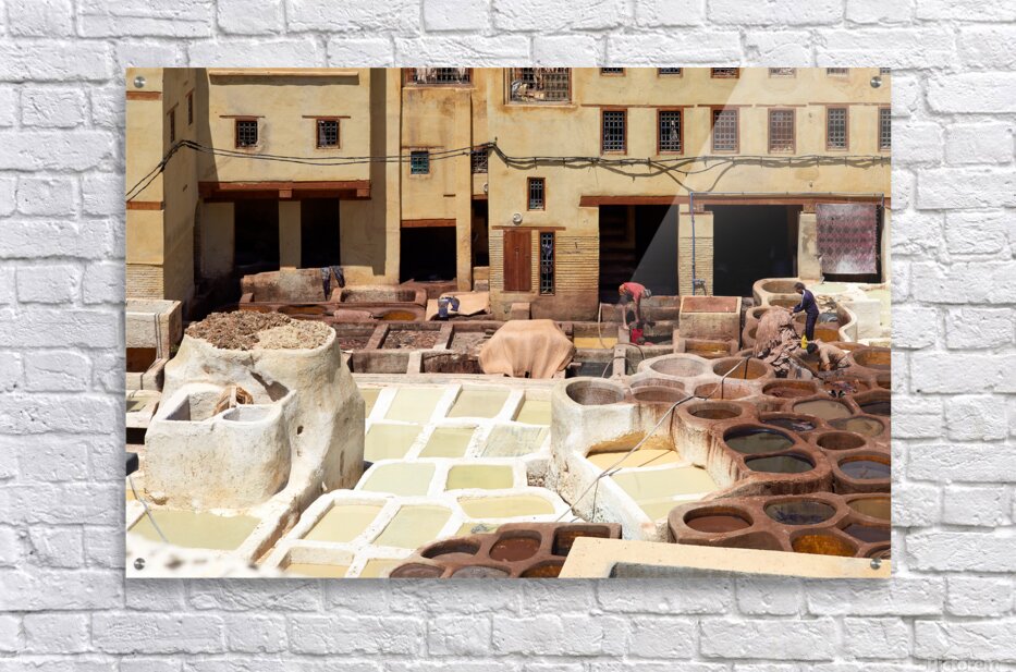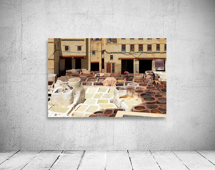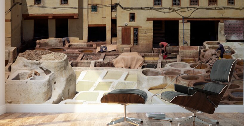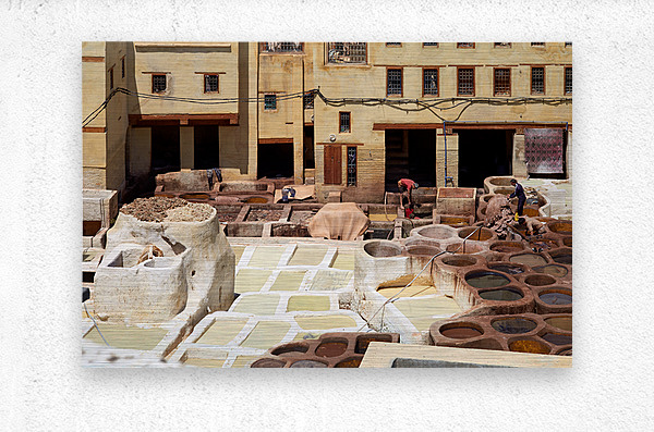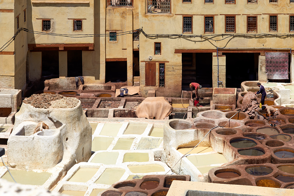 Workers process leather at Tannery Sidi Moussa in the Medina of Fez Morocco. The scene shows various tanning pits and drying hides.