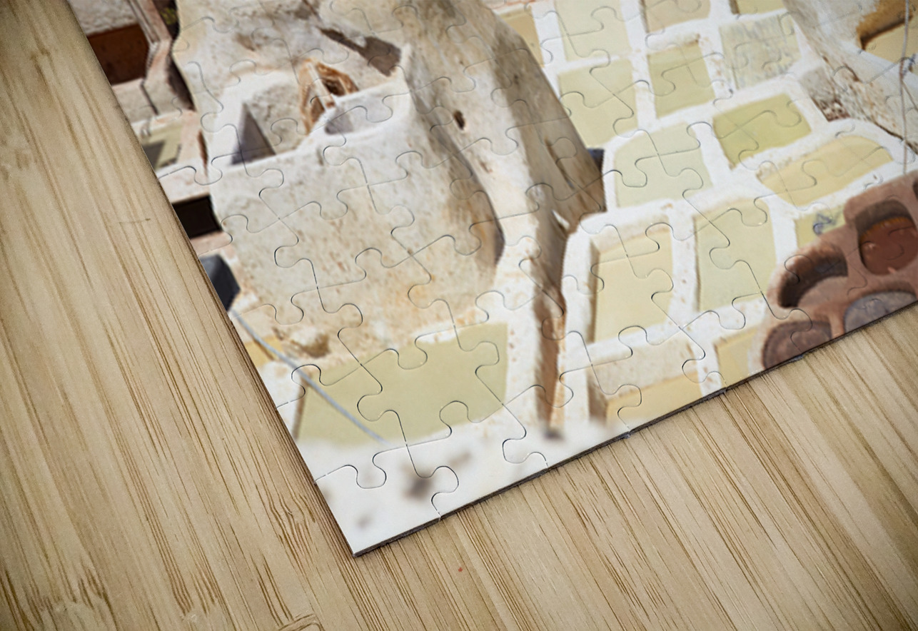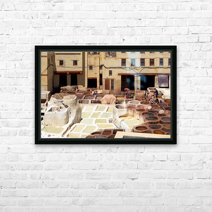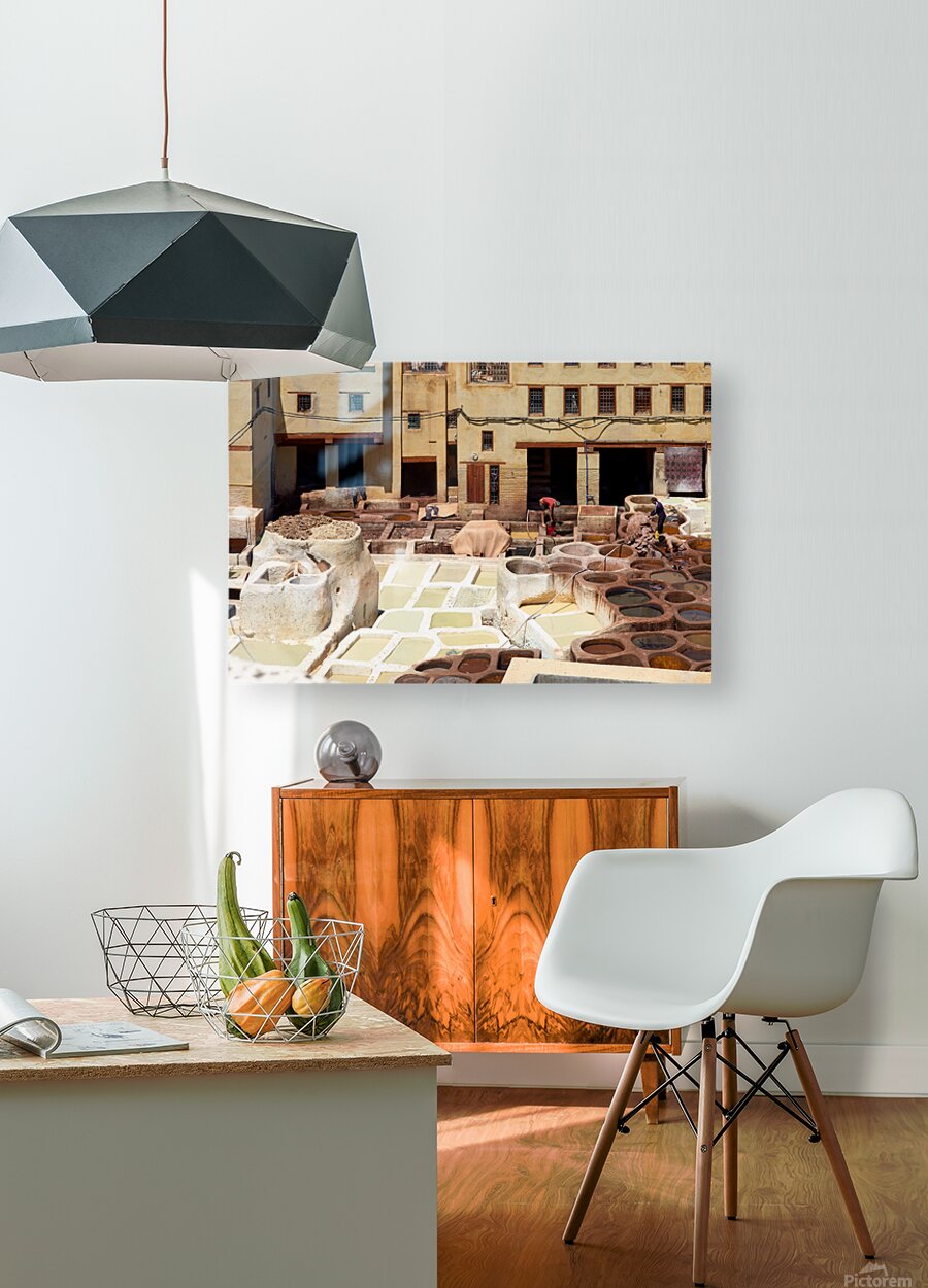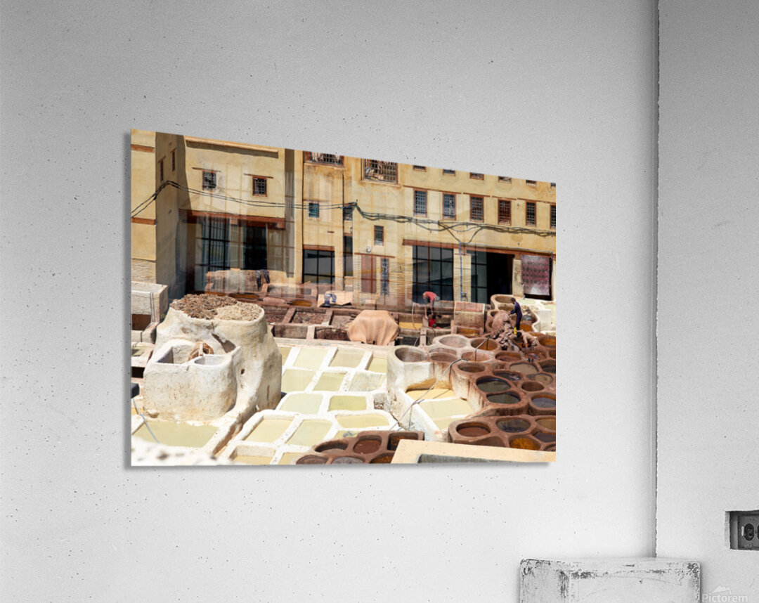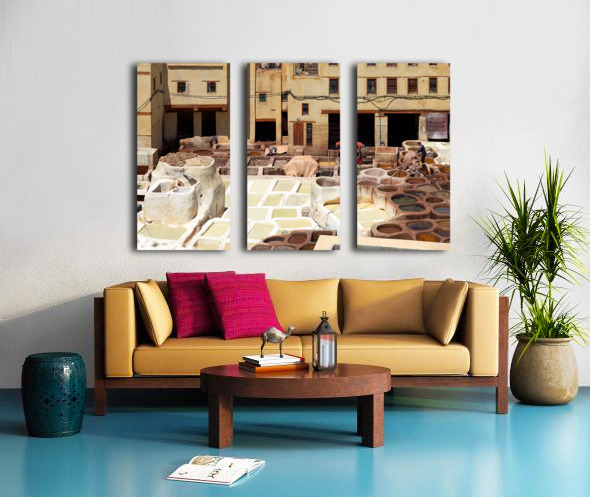 Workers process leather at Tannery Sidi Moussa in the Medina of Fez Morocco. The scene shows various tanning pits and drying hides.