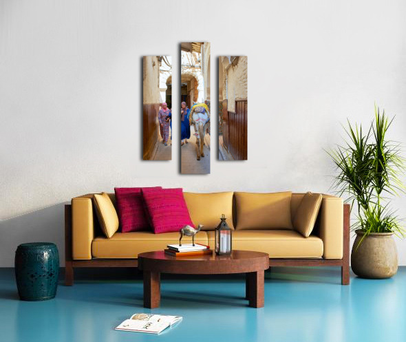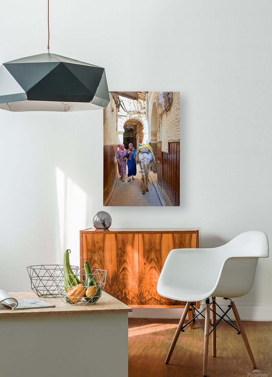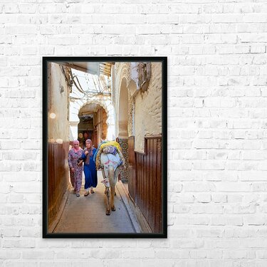 Get this artwork "Women walking with donkey in narrow alley of Fez Medina" in a framed print.