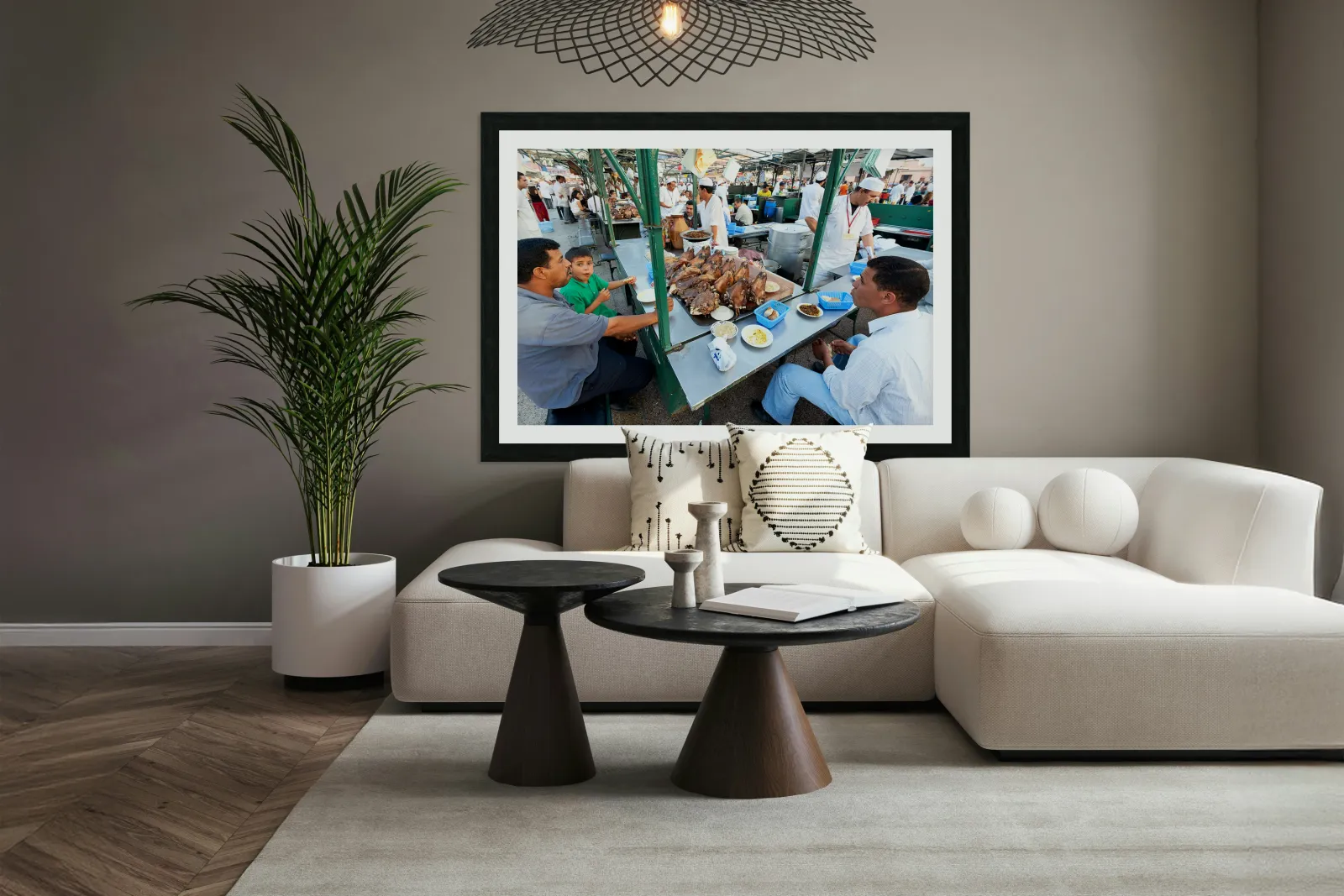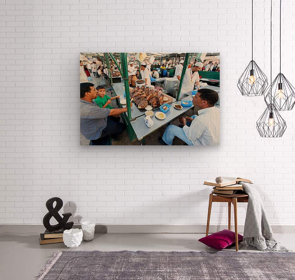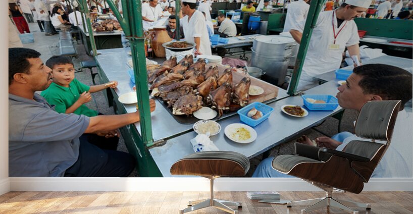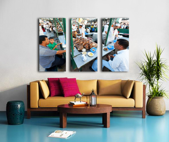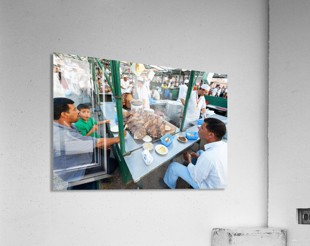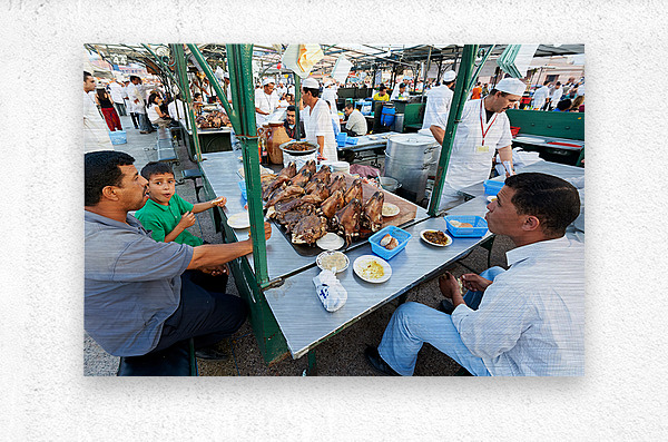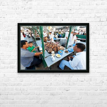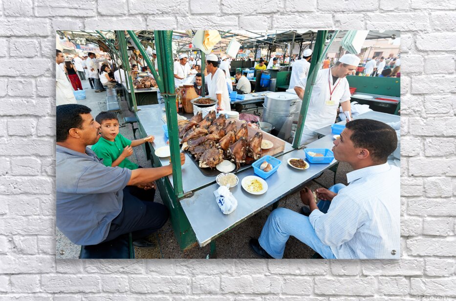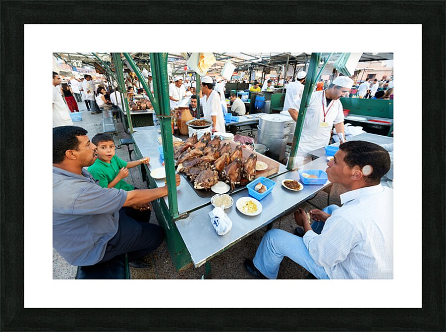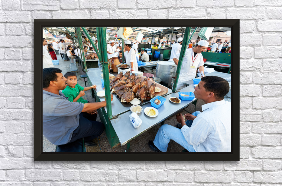 "Goat heads ready to eat in Marrakesh at Djema el Fna square" in a framed print.
