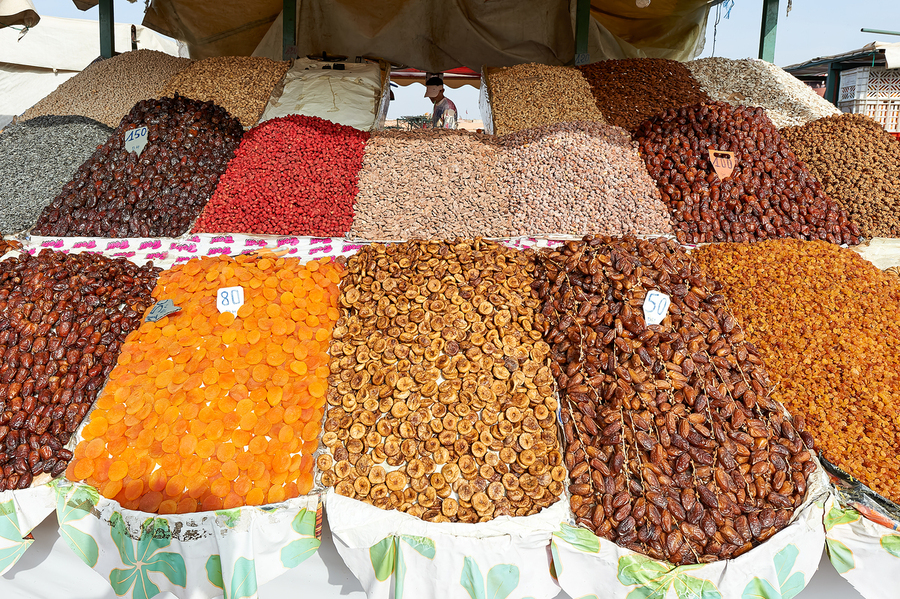Vendors display a variety of dried fruits for sale at a market in Marrakesh Morocco. Customers explore the colorful fruit offerings.