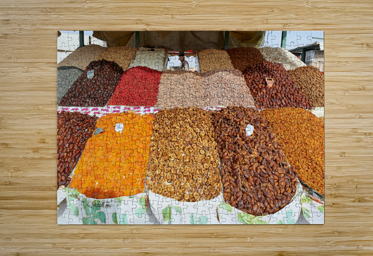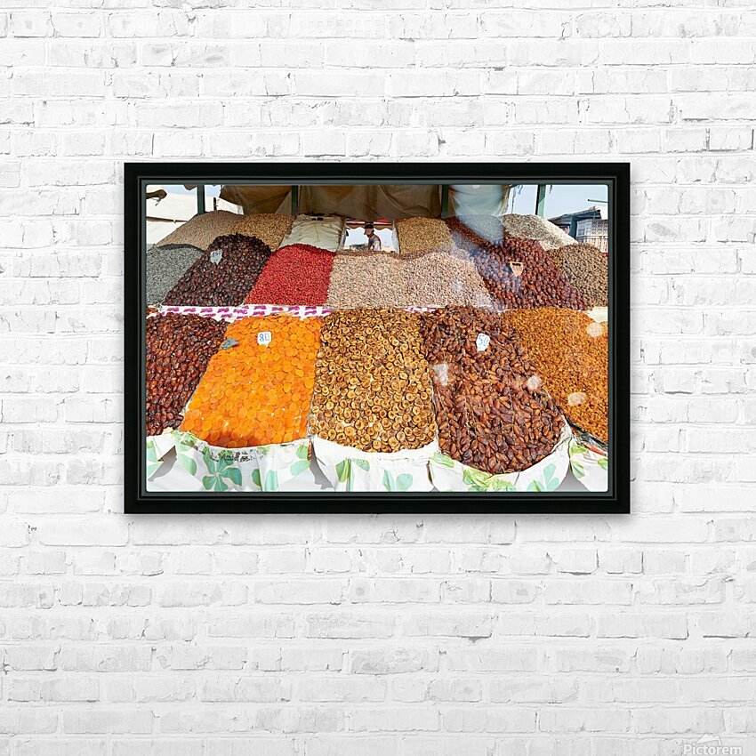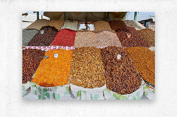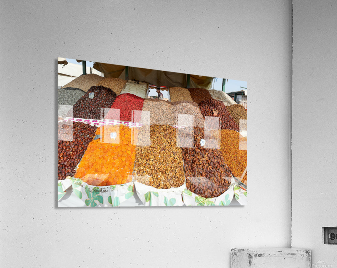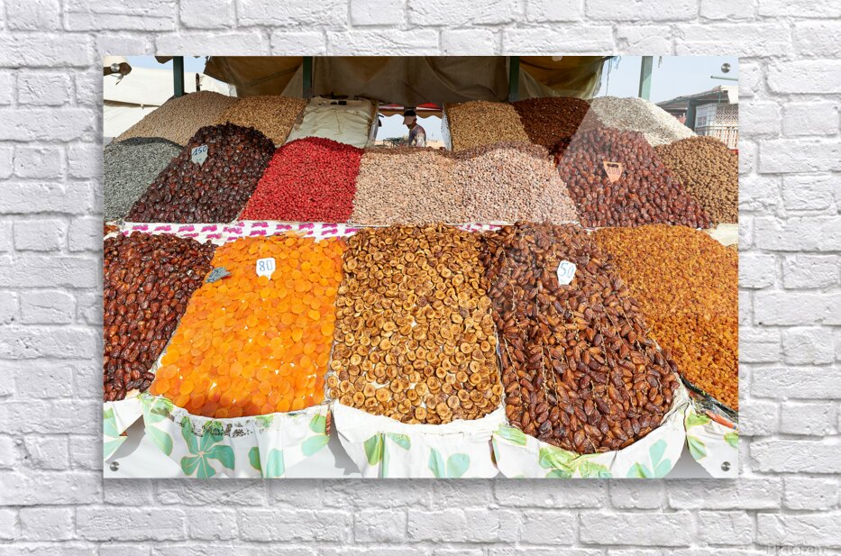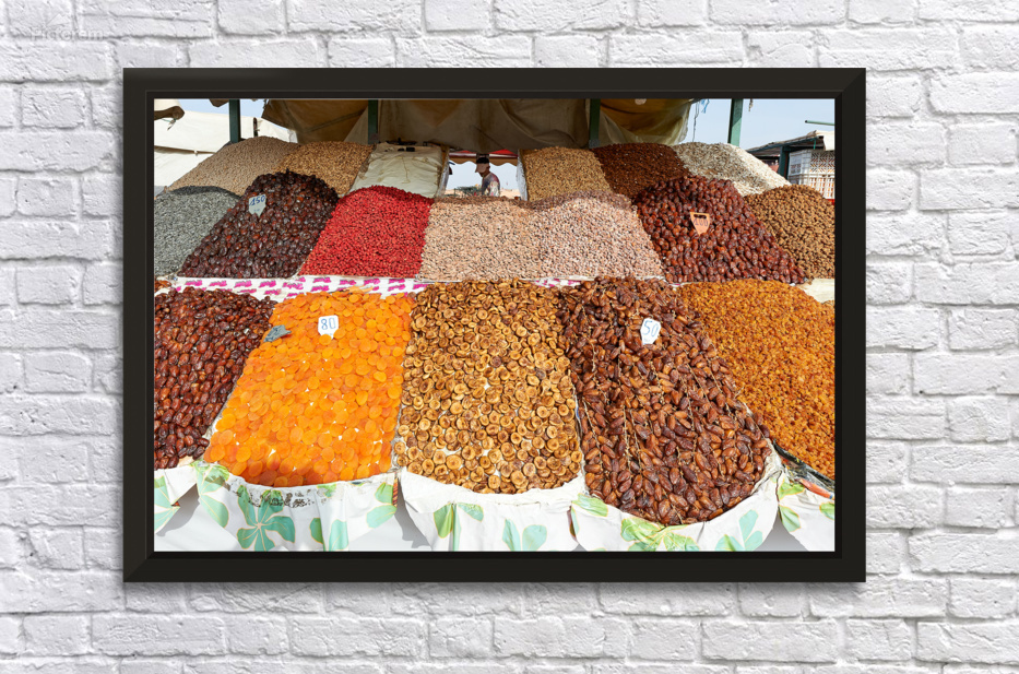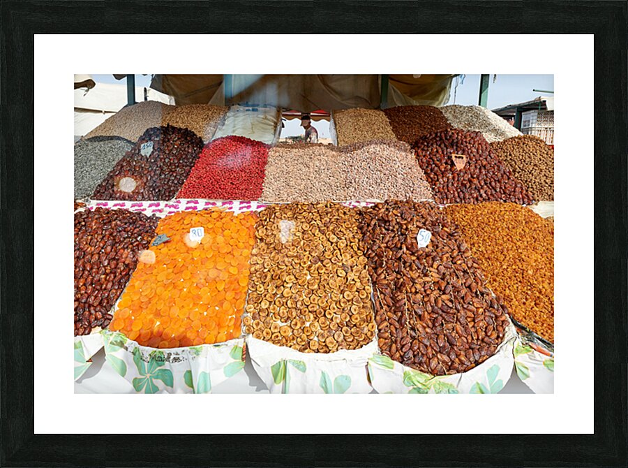 "Fruit vendors sell dried fruit in Marrakesh Morocco" in a framed print.