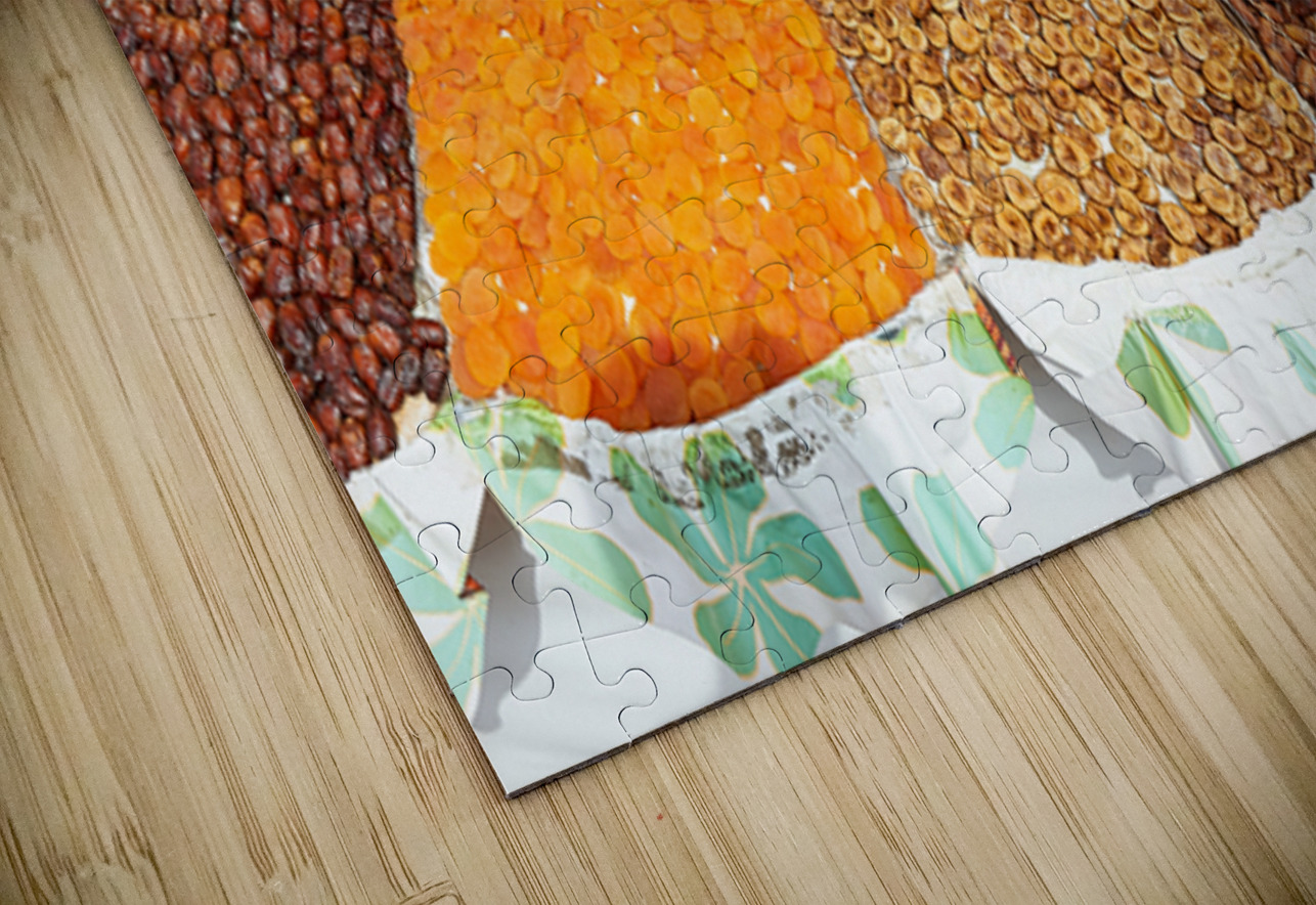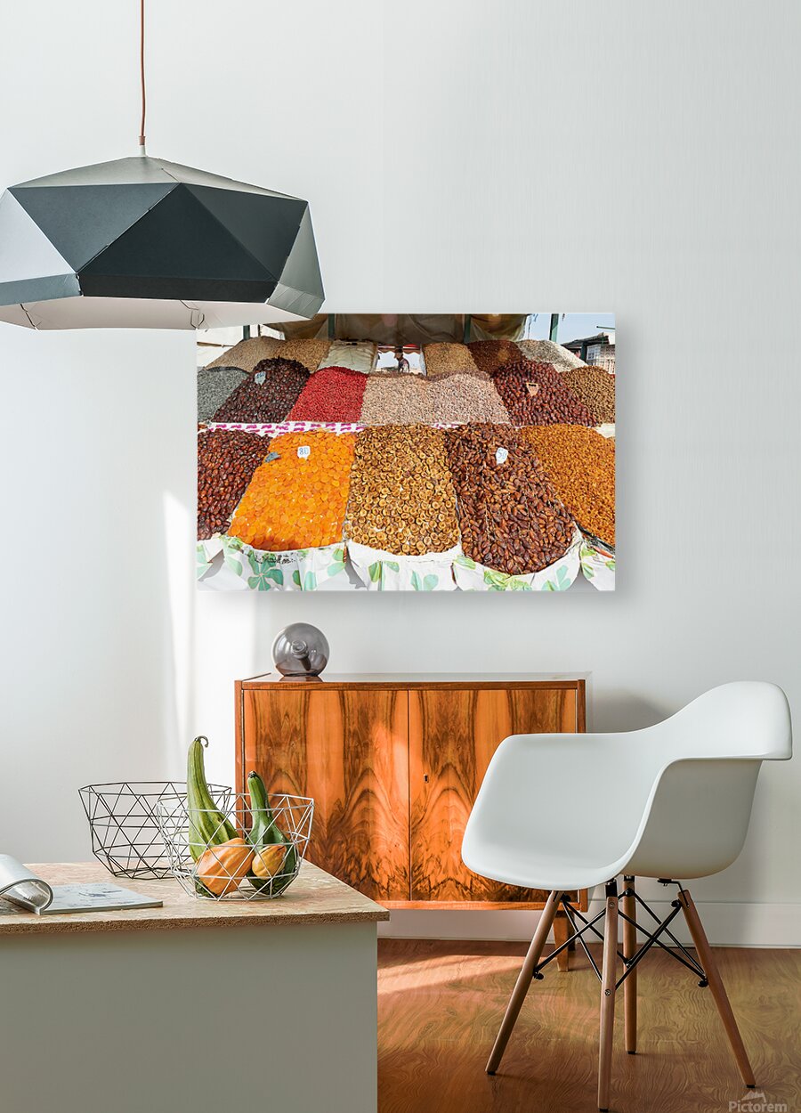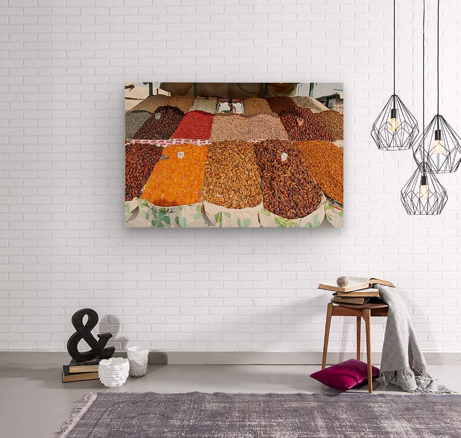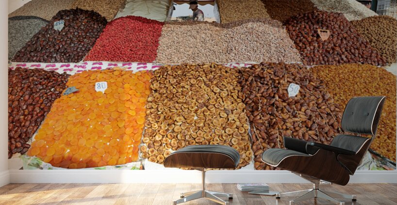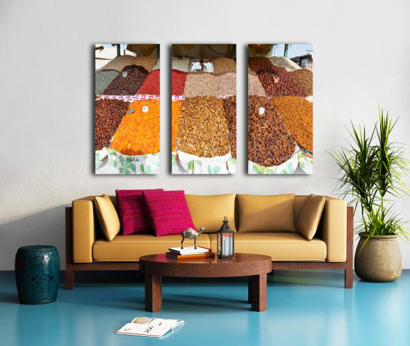 "Fruit vendors sell dried fruit in Marrakesh Morocco" in a framed print.