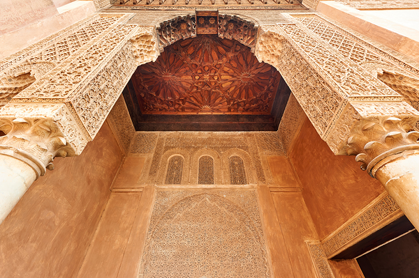 People explore Saadian tombs in Marrakesh Morocco. The site features intricate designs and historical architecture.