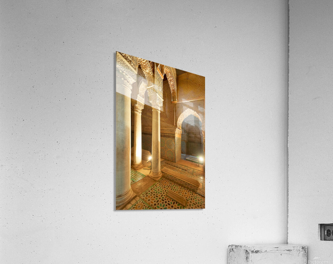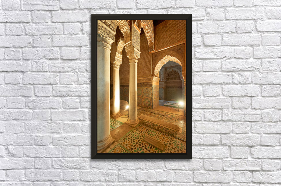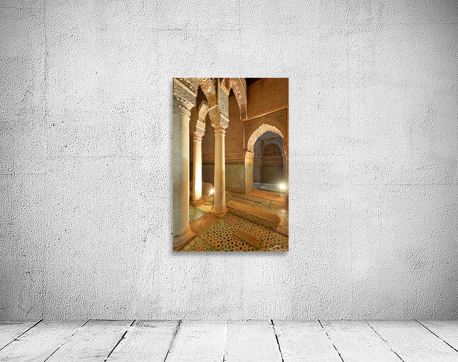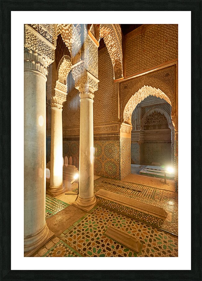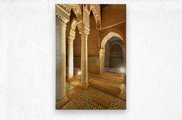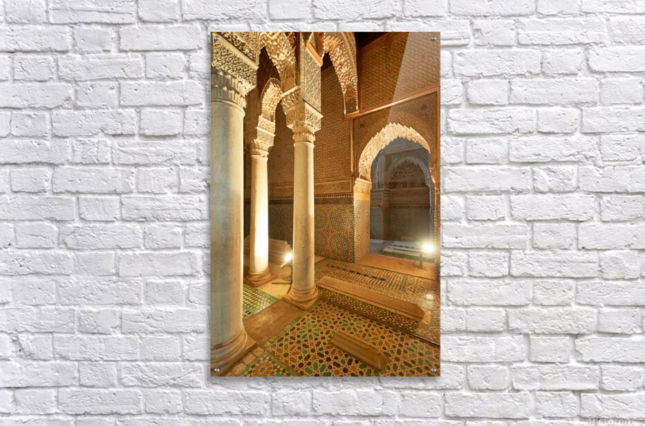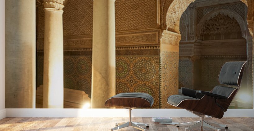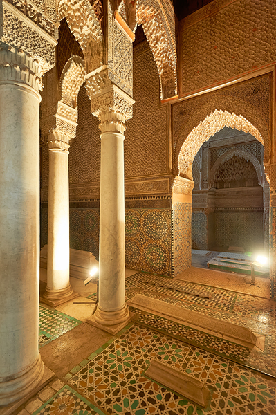 Visitors view the intricate details of the Saadian tombs in Marrakesh. The royal necropolis showcases intricate tile work and architecture.