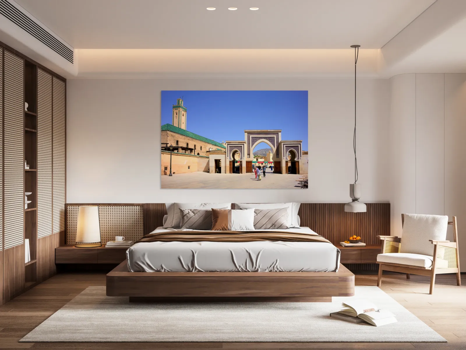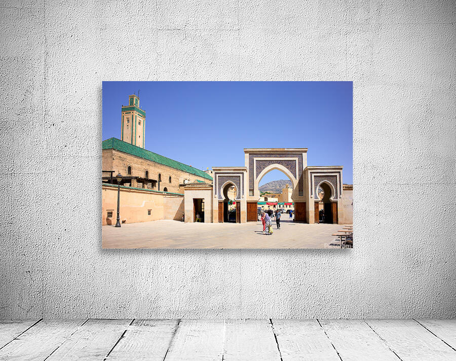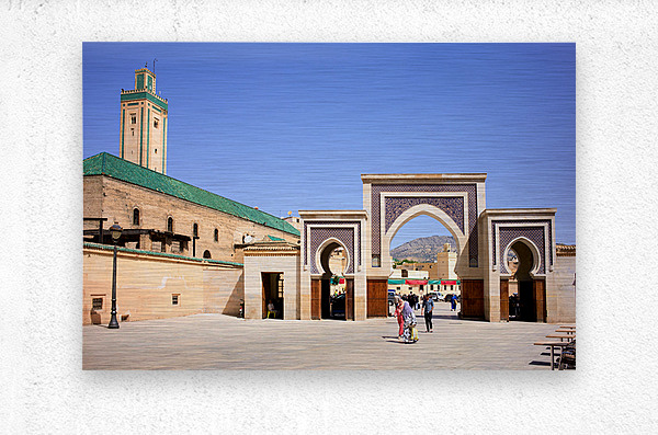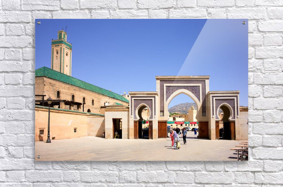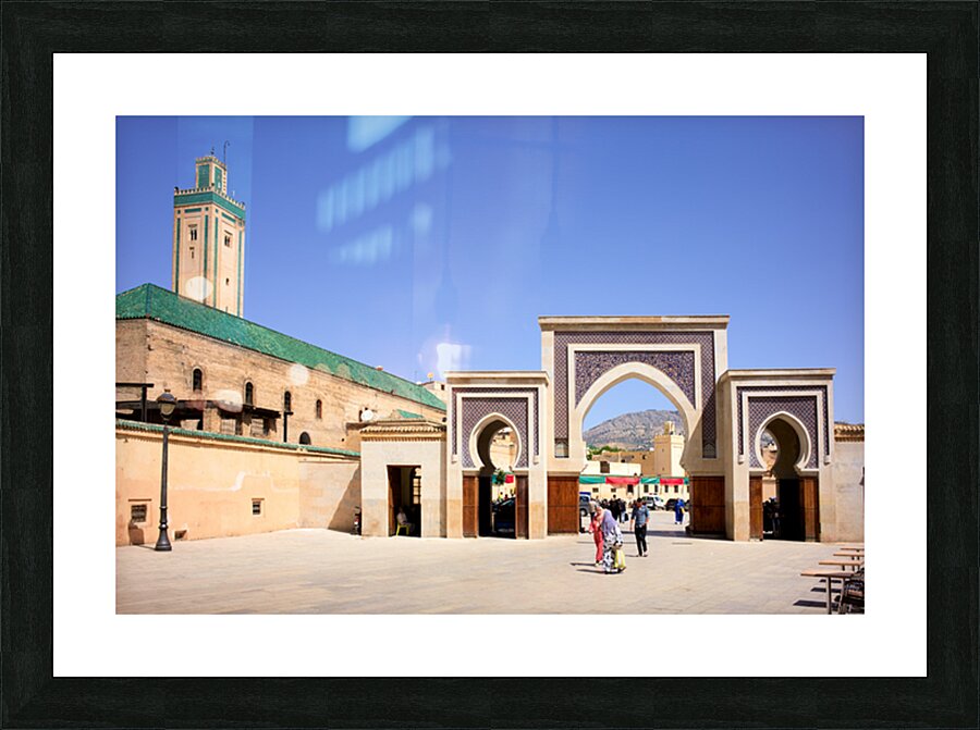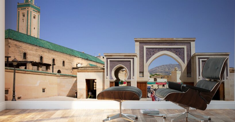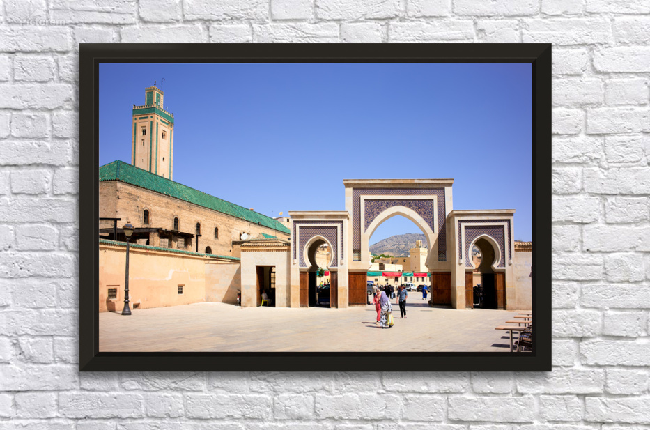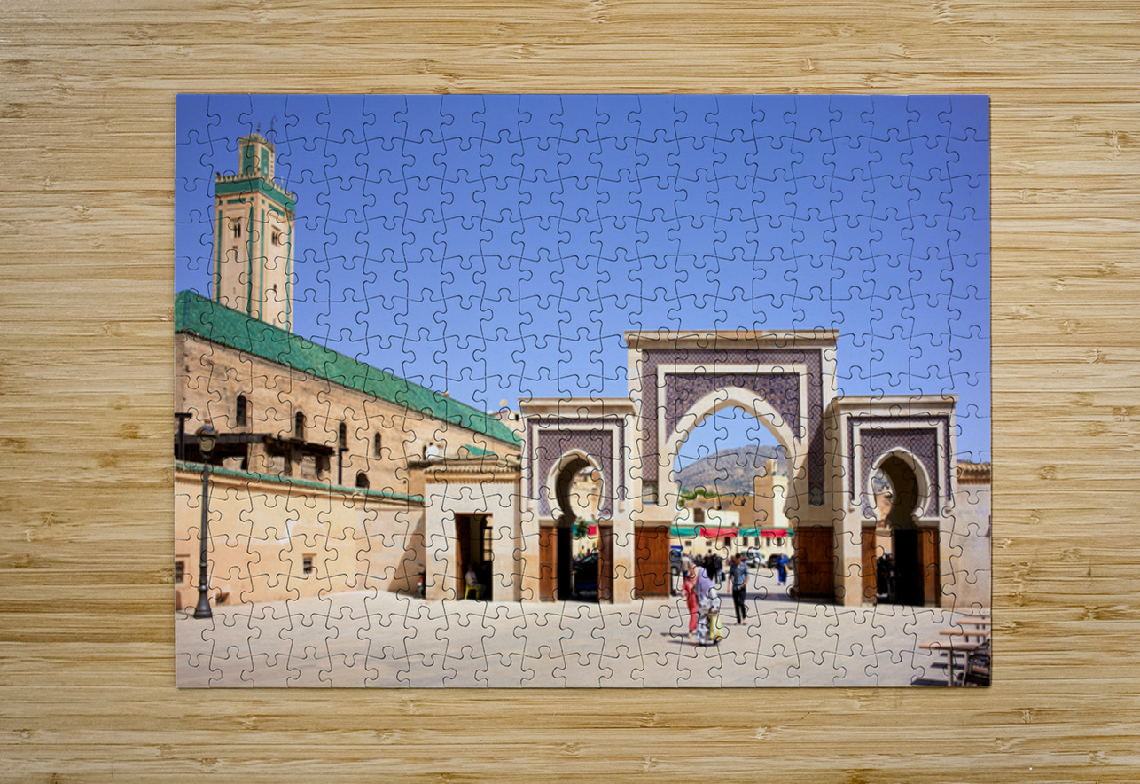 People explore the Bab Rcif gate leading into the Medina in Fez Morocco under clear blue skies. The scene shows local architecture.