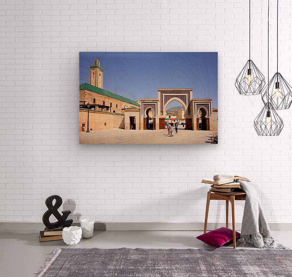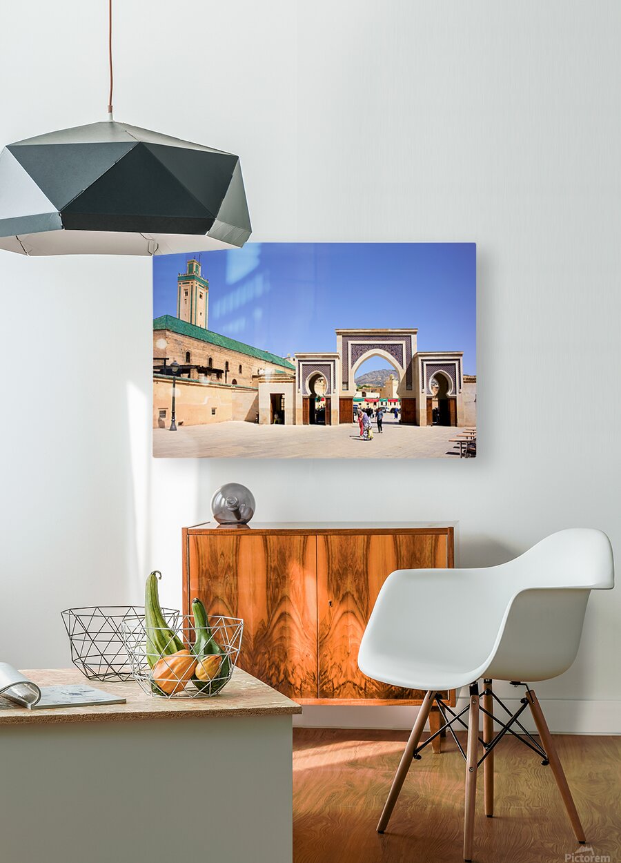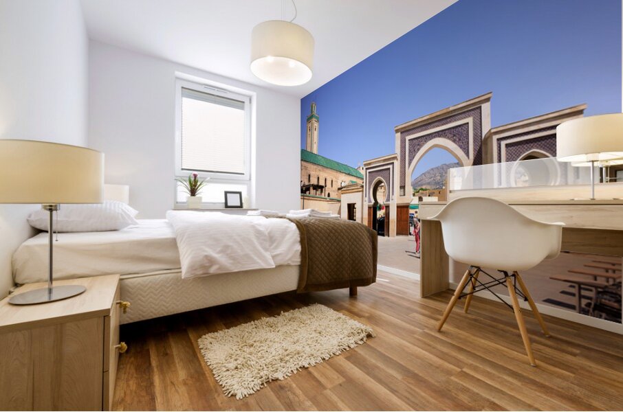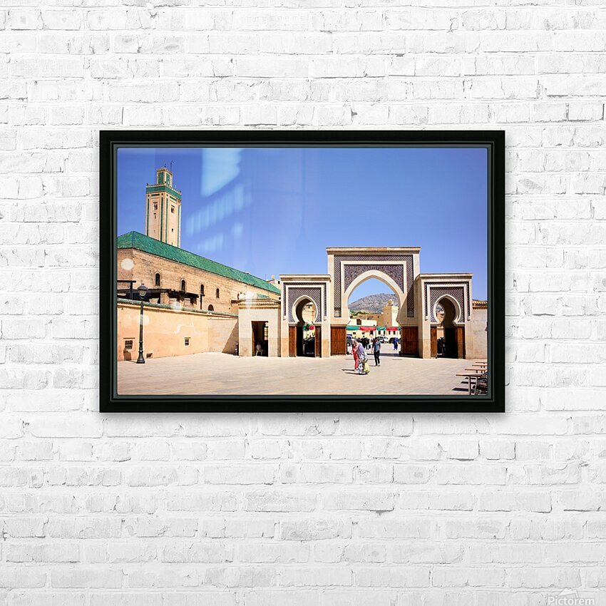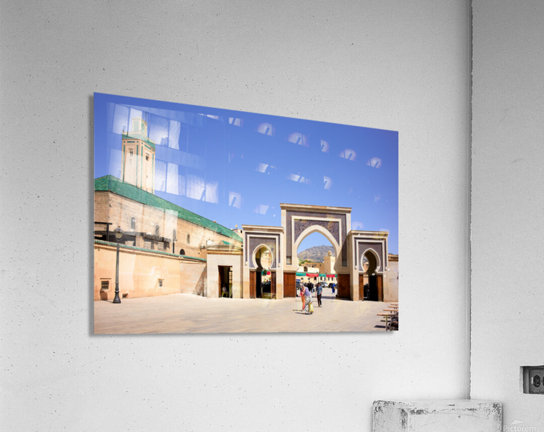 People explore the Bab Rcif gate leading into the Medina in Fez Morocco under clear blue skies. The scene shows local architecture.