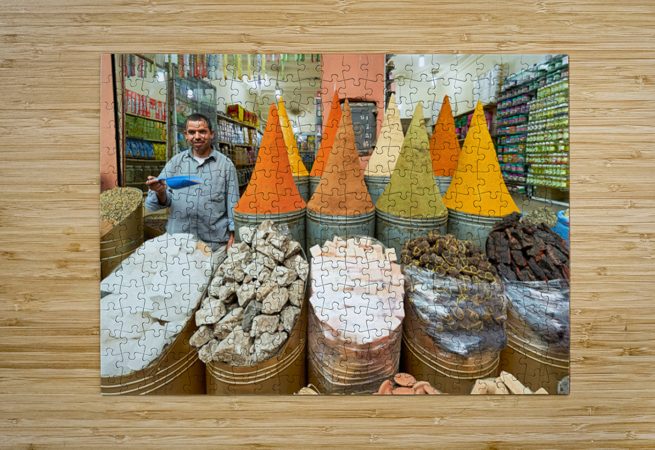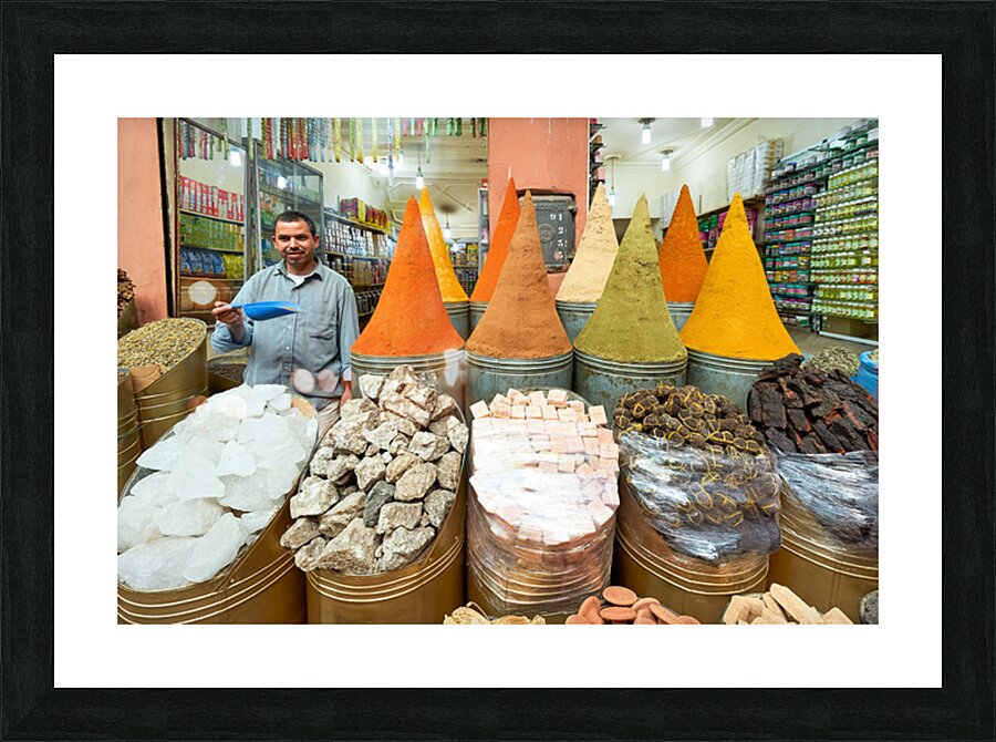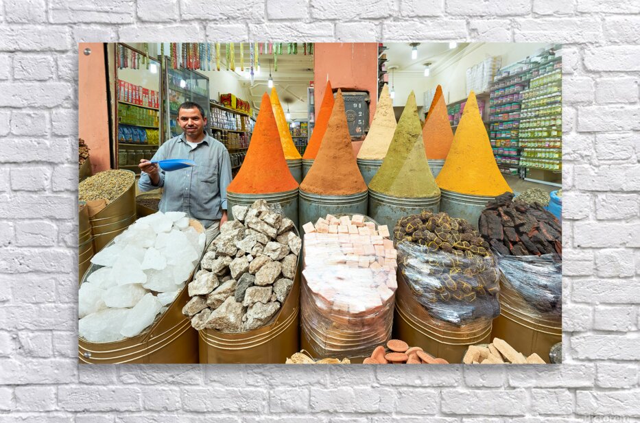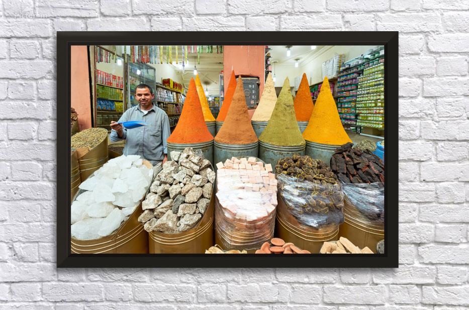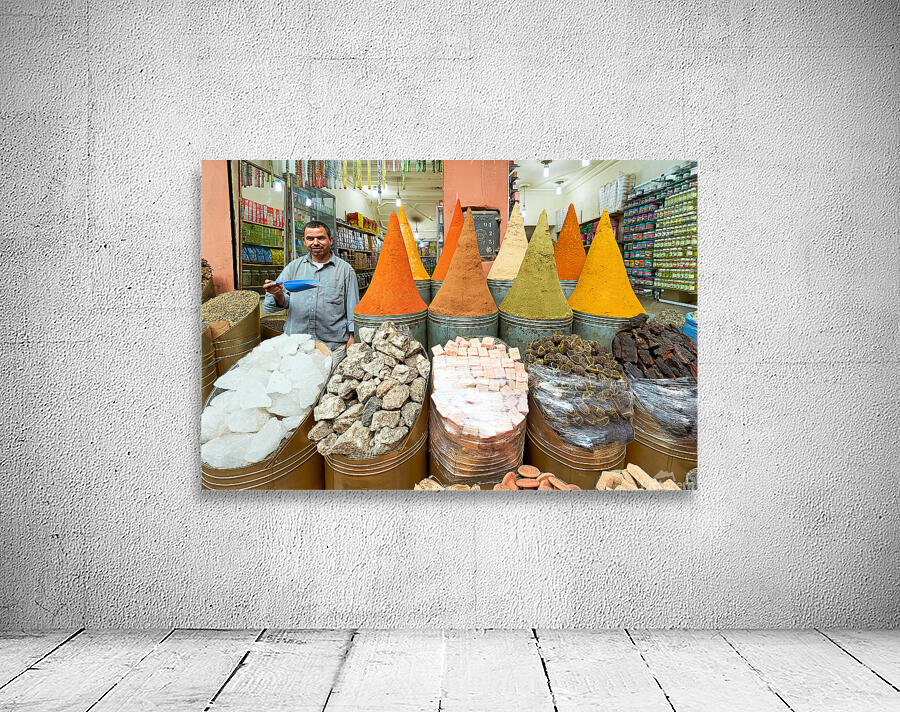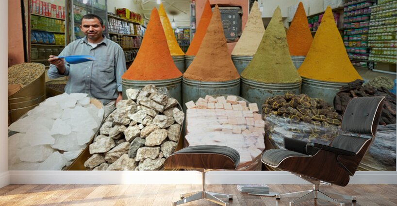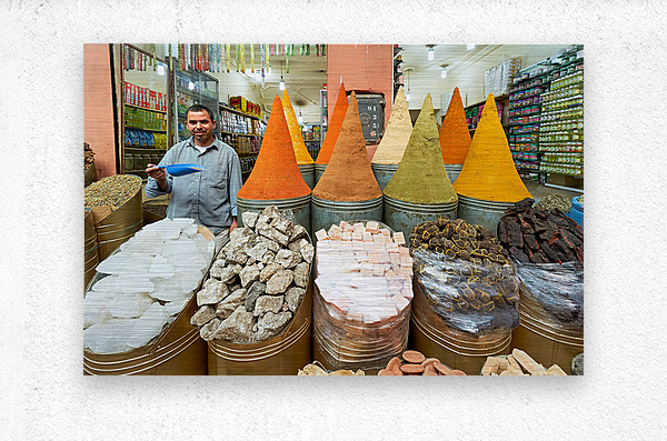 A seller stands in the busy souk of Marrakesh with colorful spices displayed. Customers browse various spices and goods for sale.