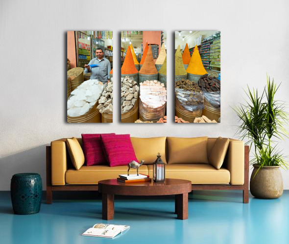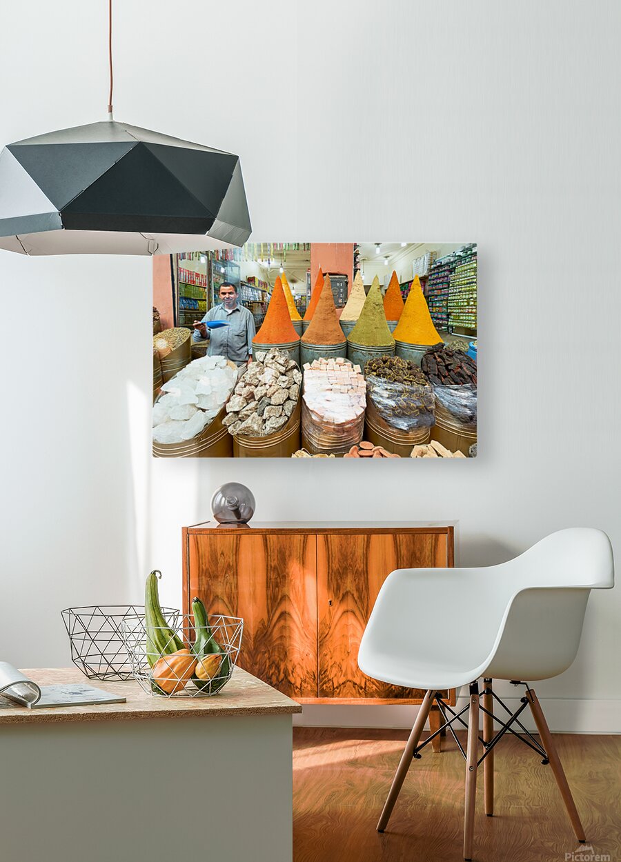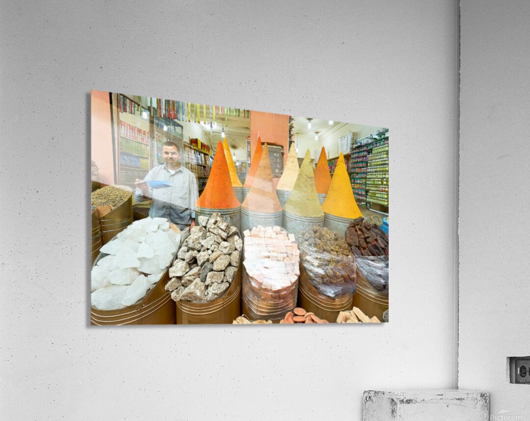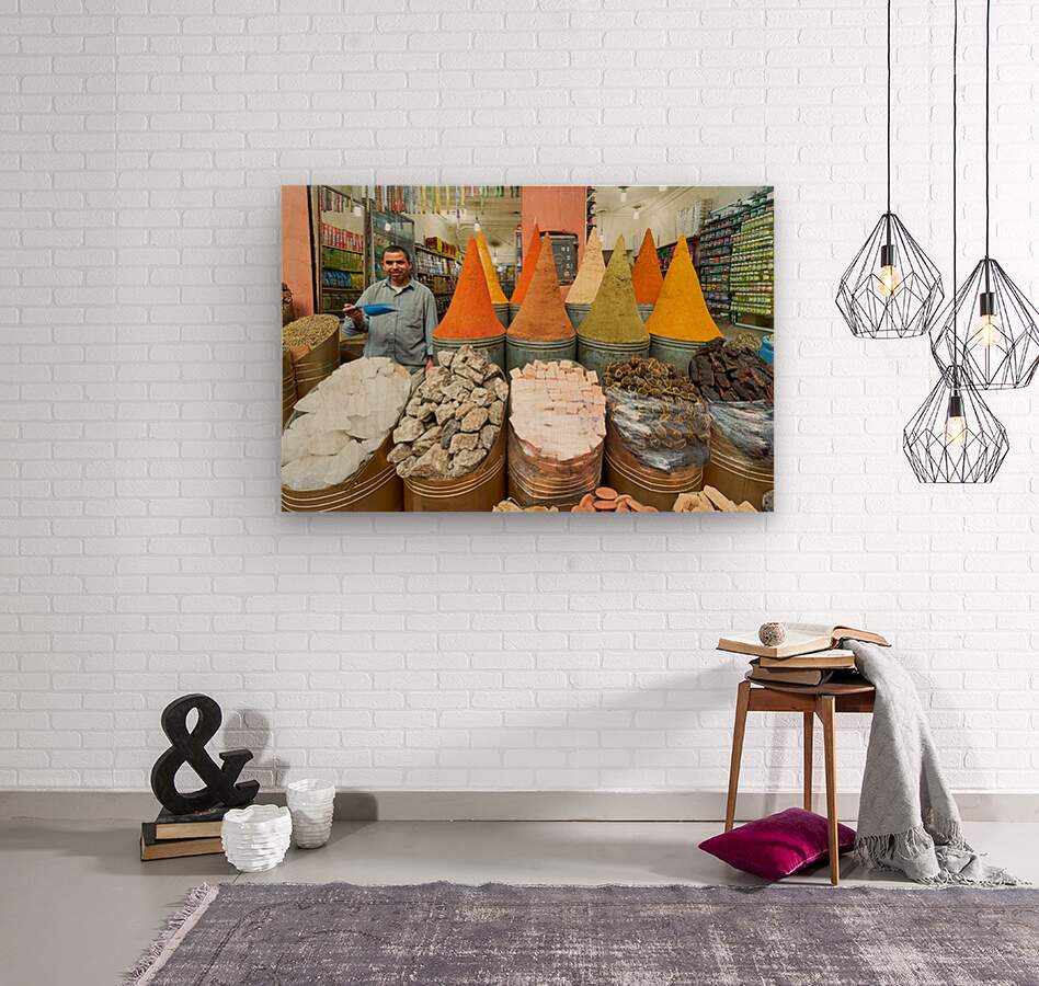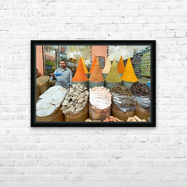 A seller stands in the busy souk of Marrakesh with colorful spices displayed. Customers browse various spices and goods for sale.