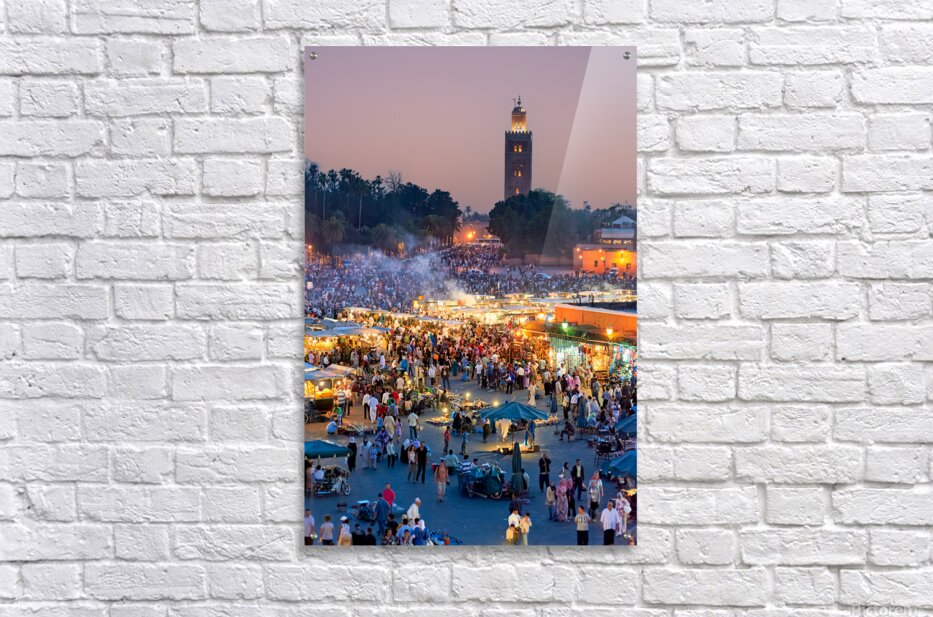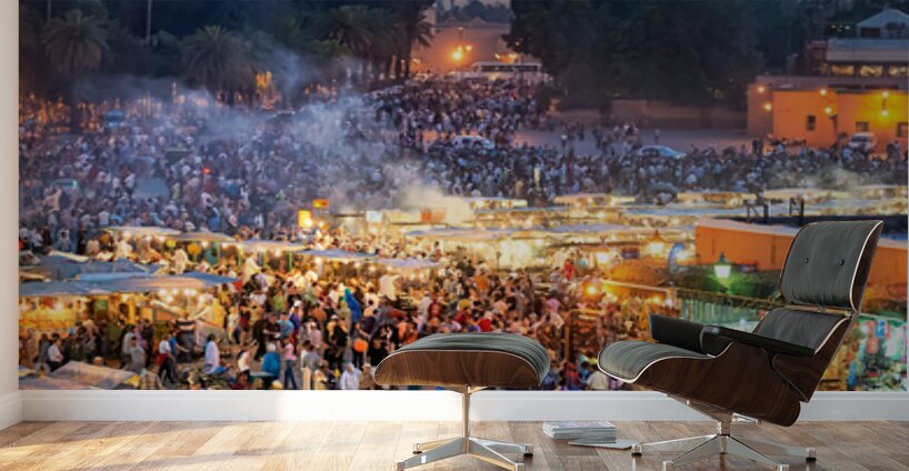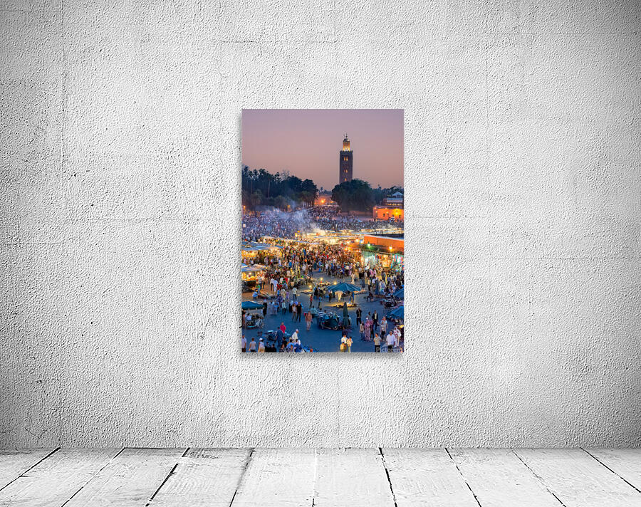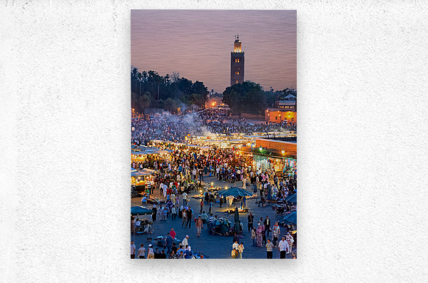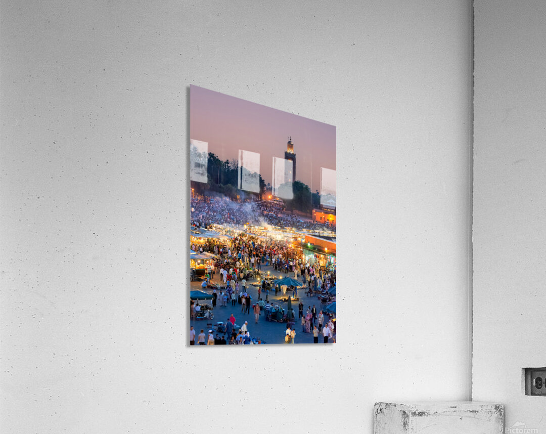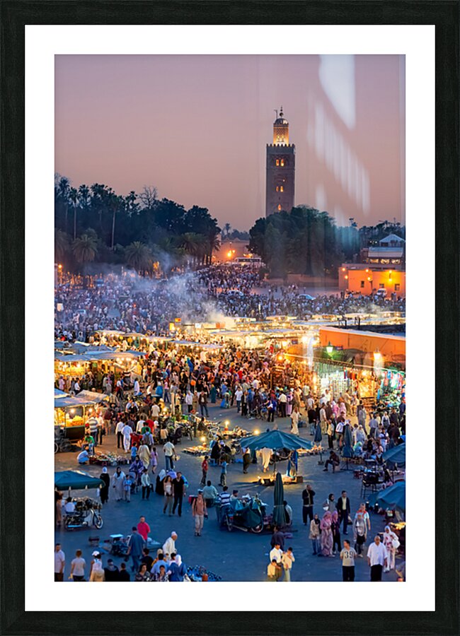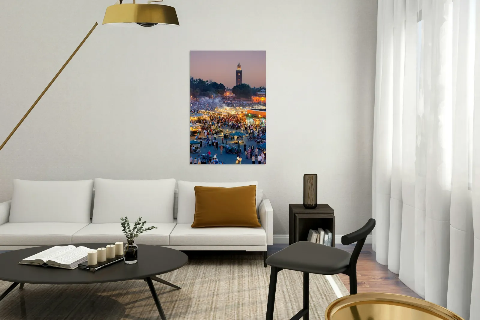 People gather in Djema el Fna square for food and activities at sunset. The market is busy with vendors and visitors enjoying the evening.