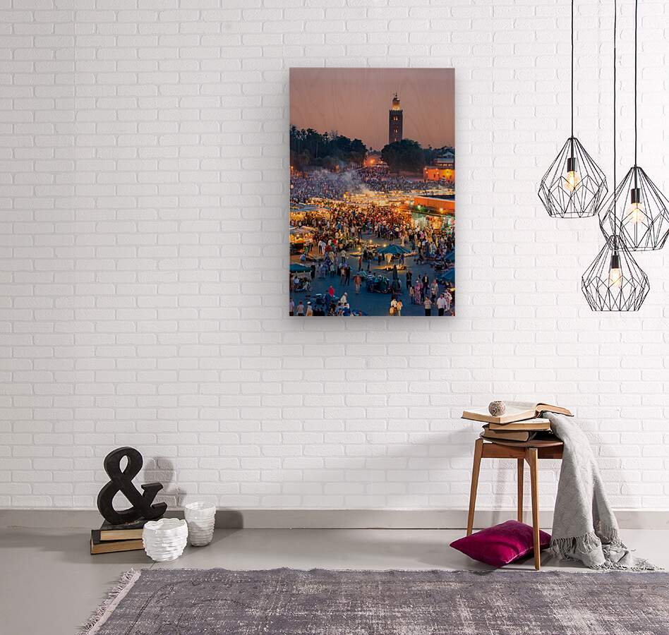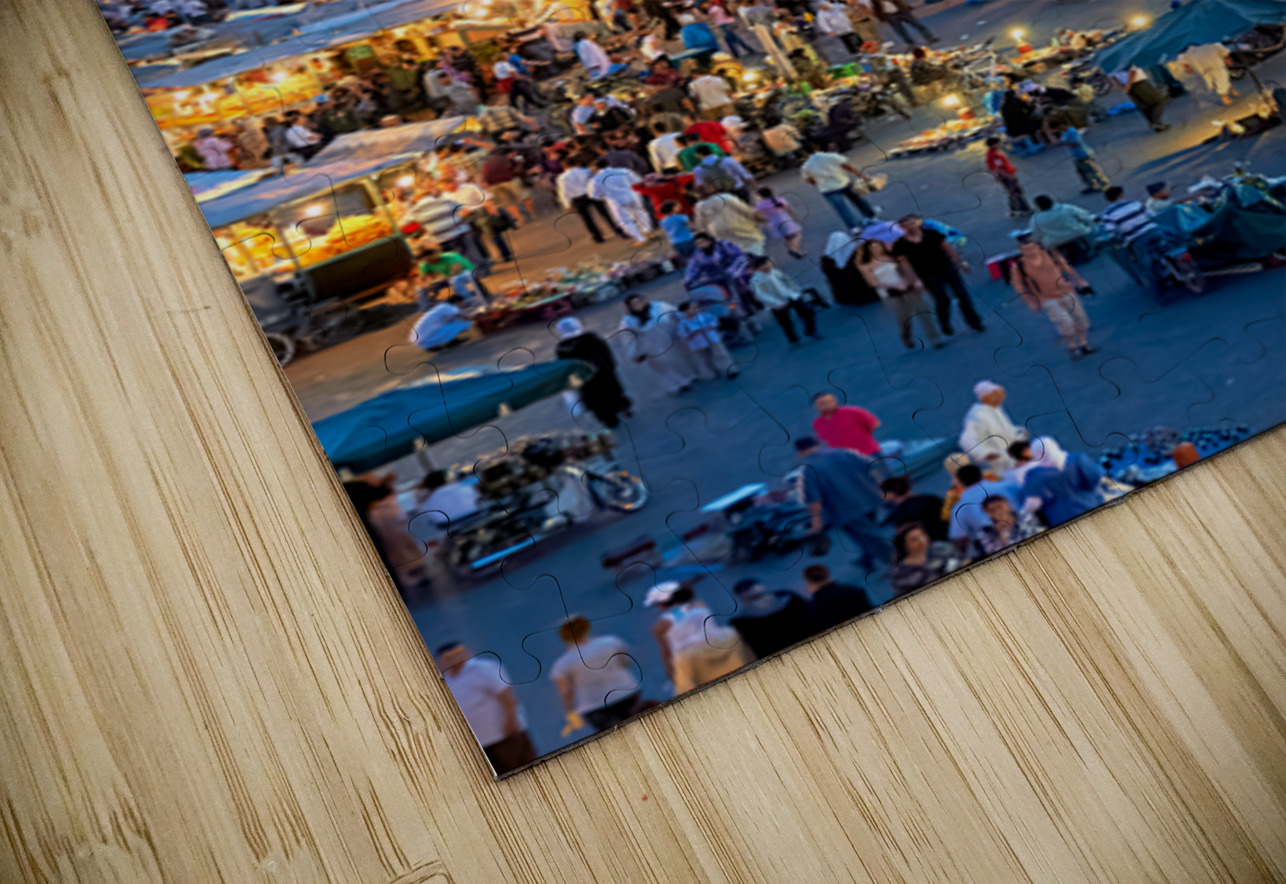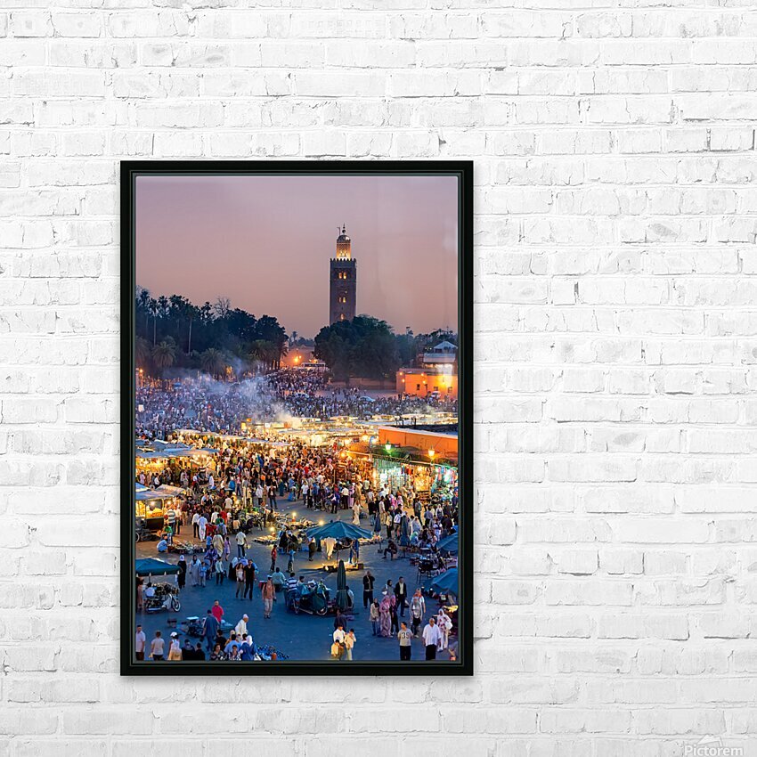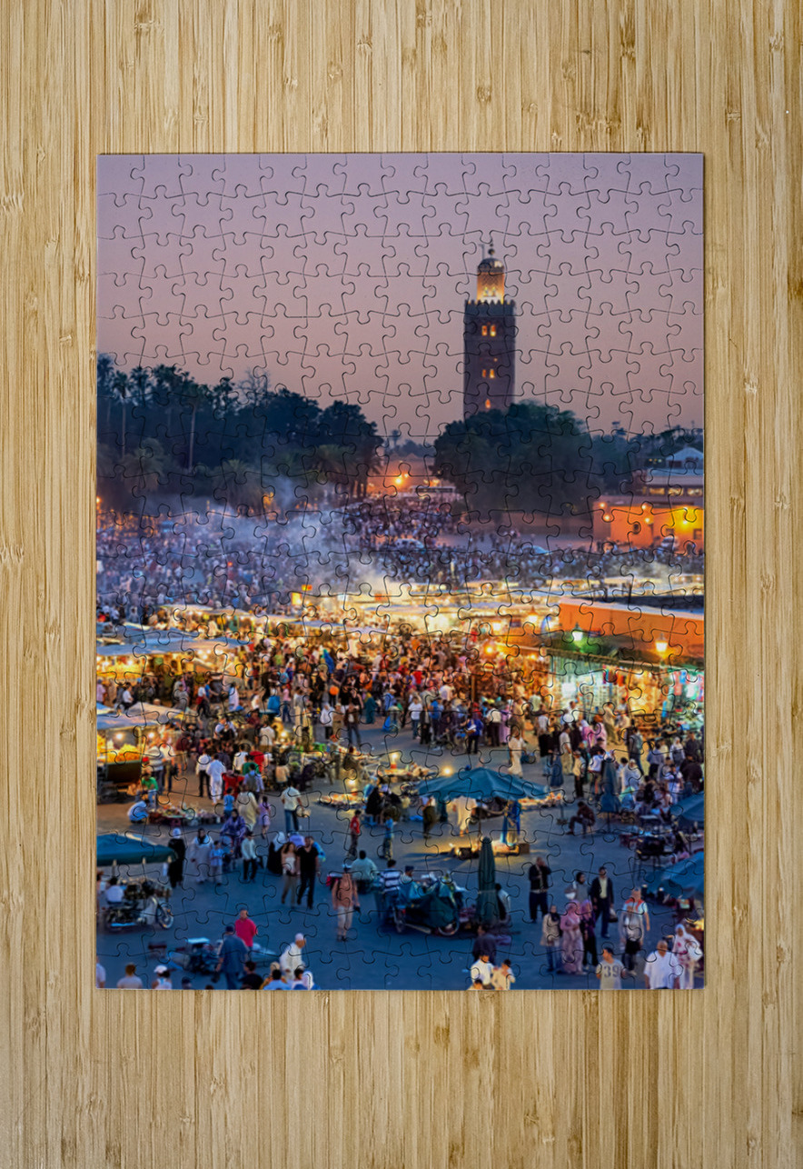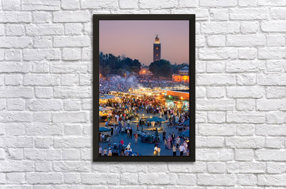 People gather in Djema el Fna square for food and activities at sunset. The market is busy with vendors and visitors enjoying the evening.