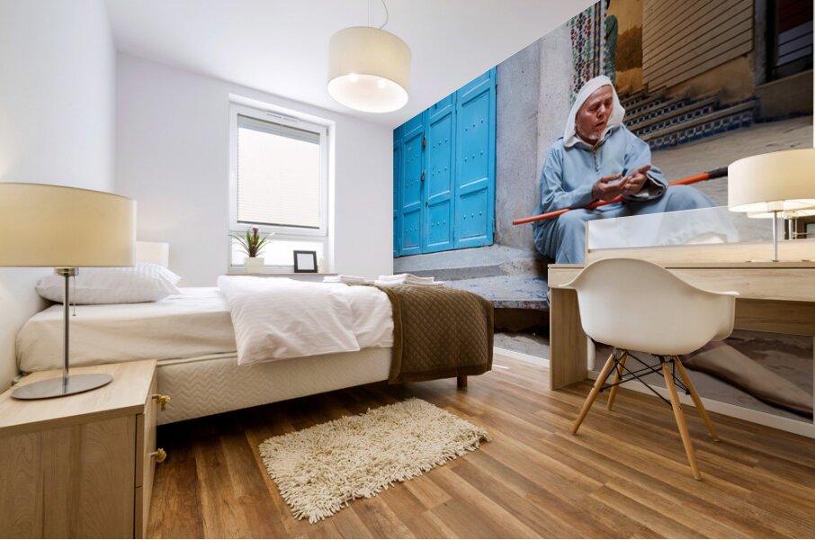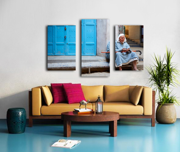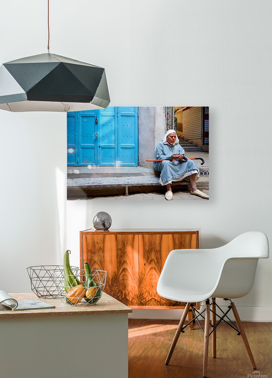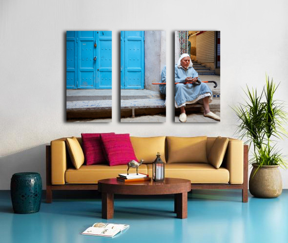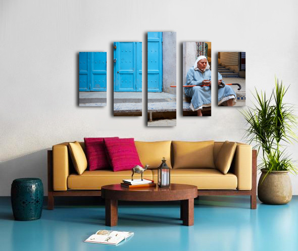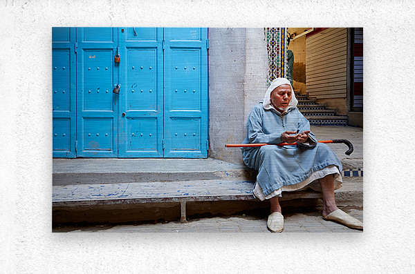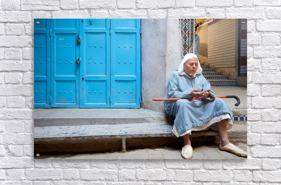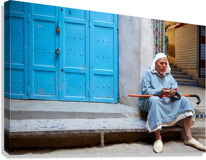 Get this artwork "Portrait of a beggar sitting by a blue door in Fez Morocco" in a framed print.