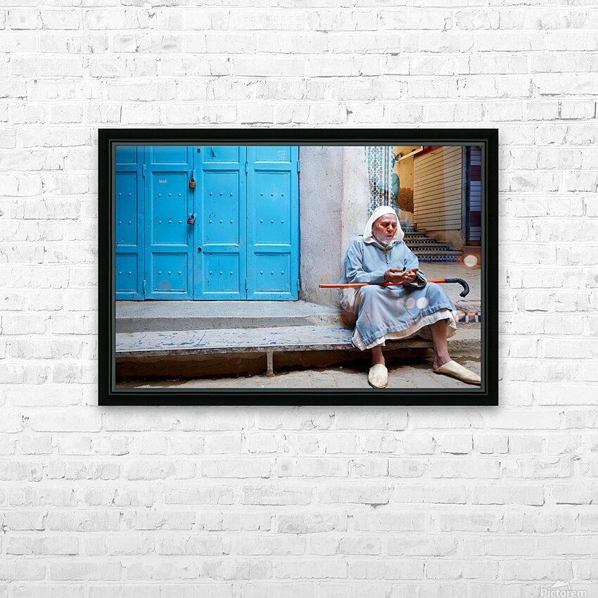 Portrait of a beggar sitting by a blue door in Fez Morocco Picture Frame Printing