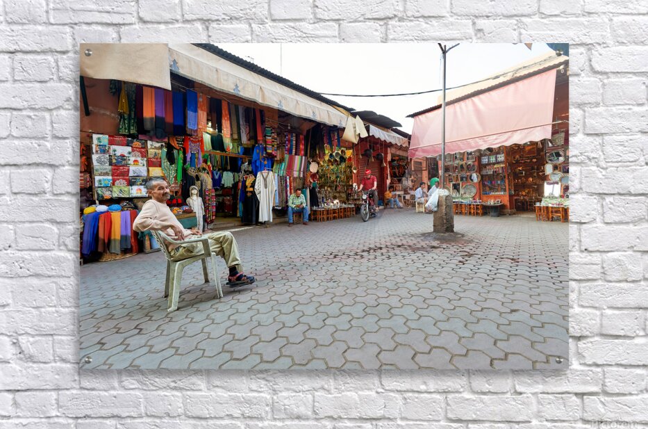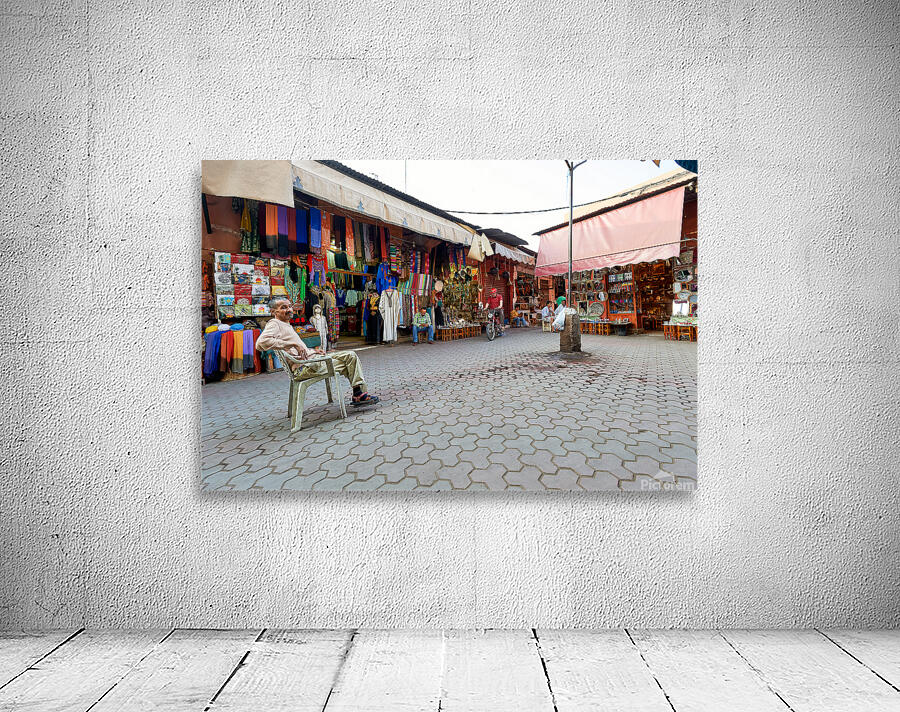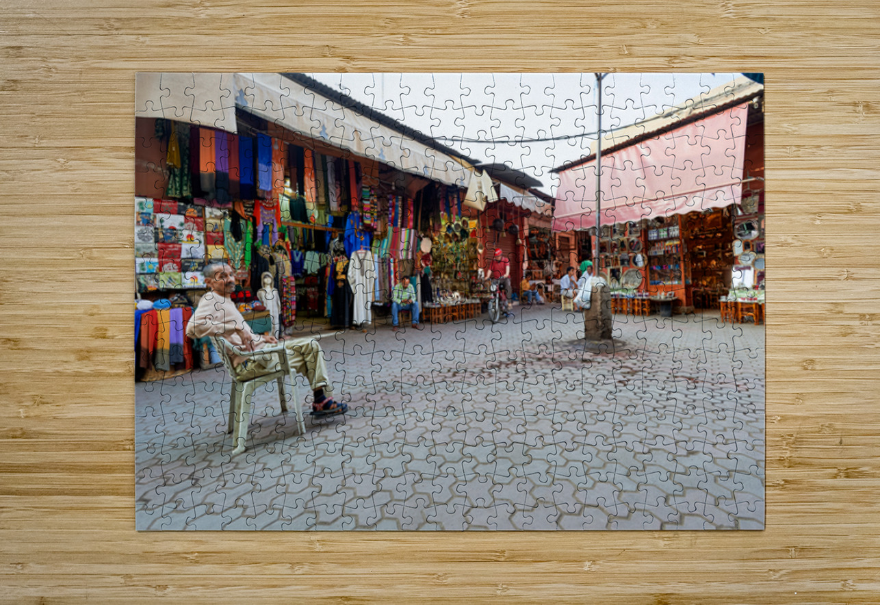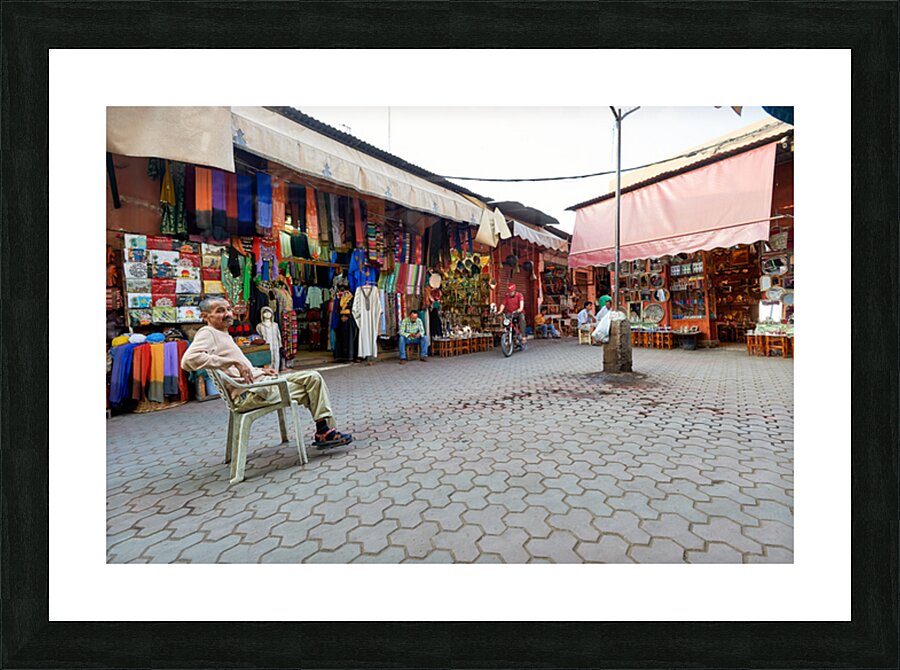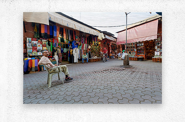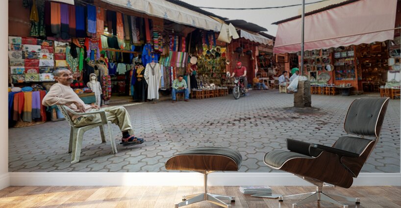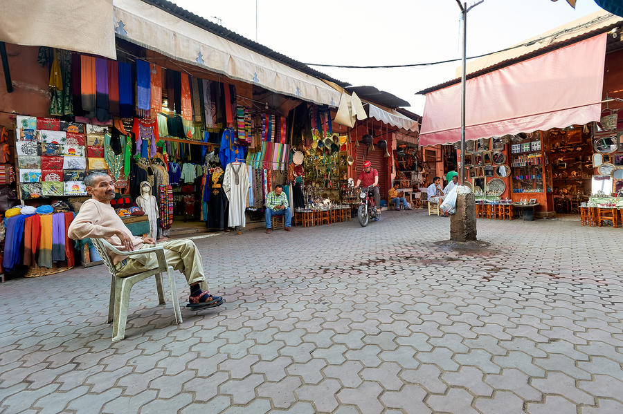 In the Medina of Marrakesh people sit and shop among colorful displays of goods in a lively market setting.