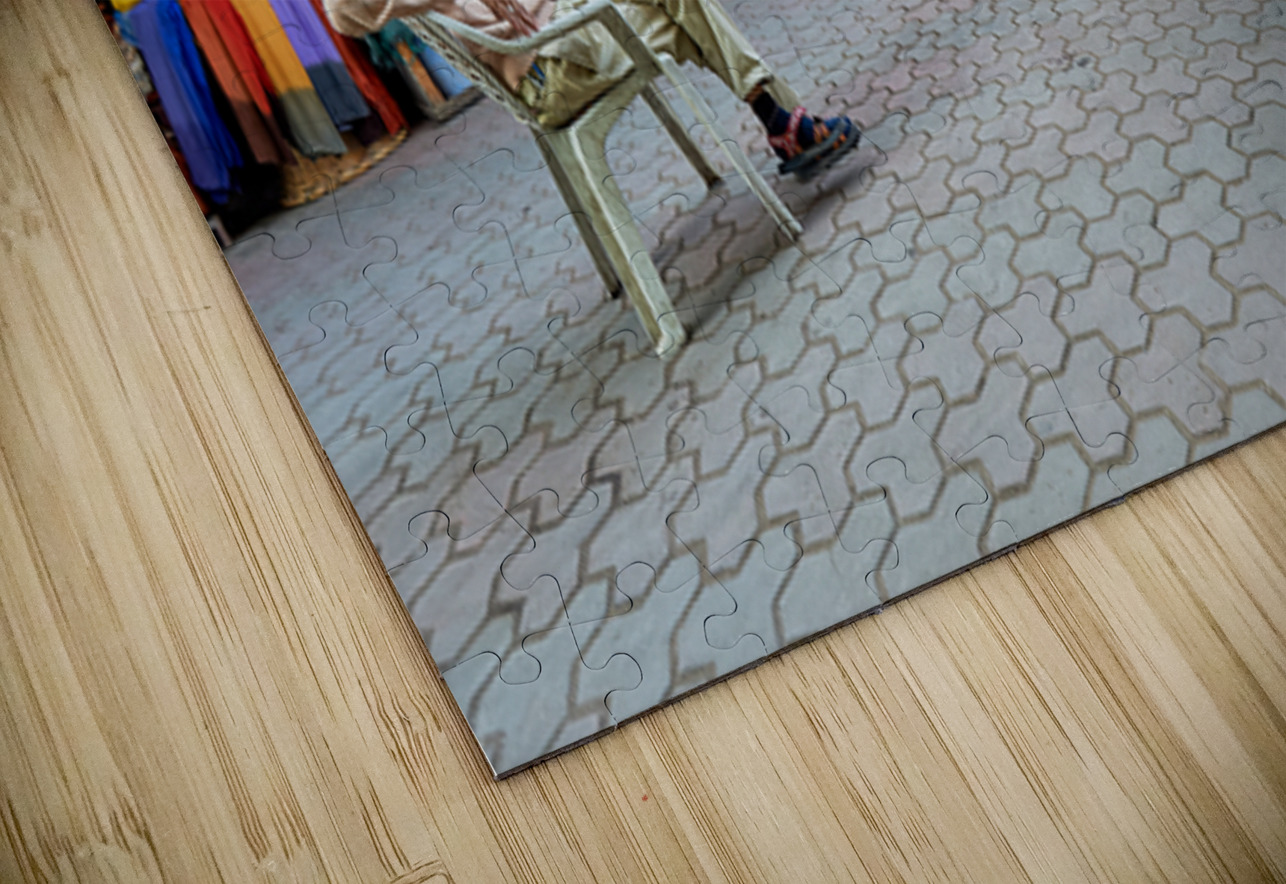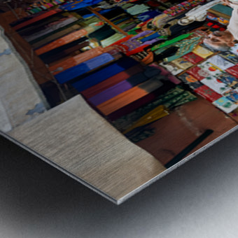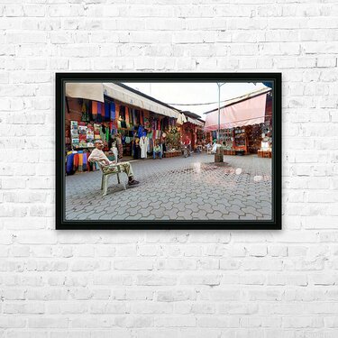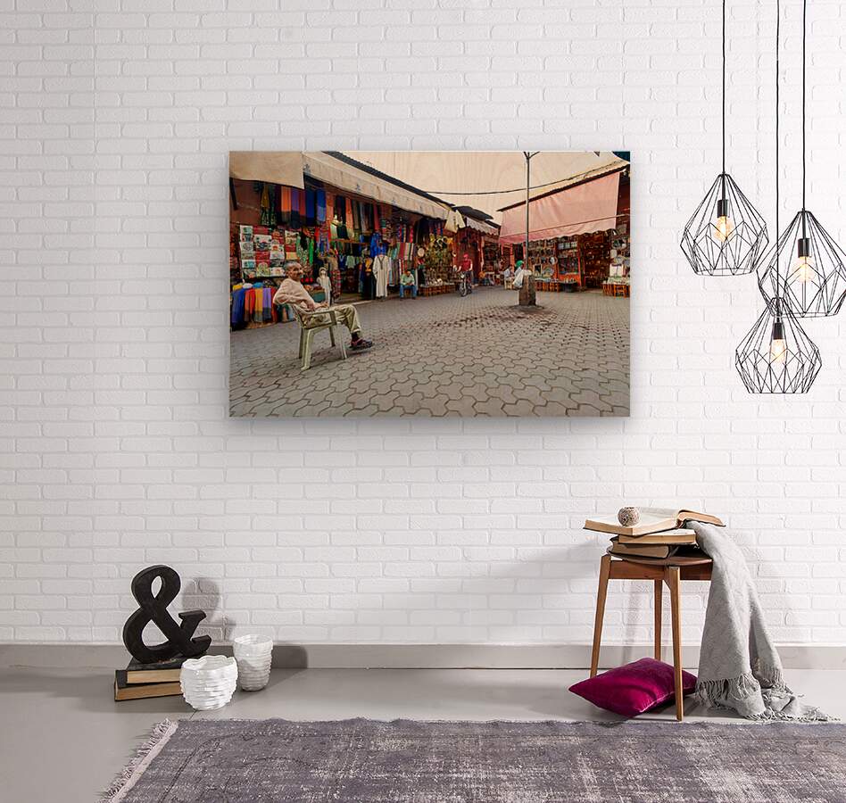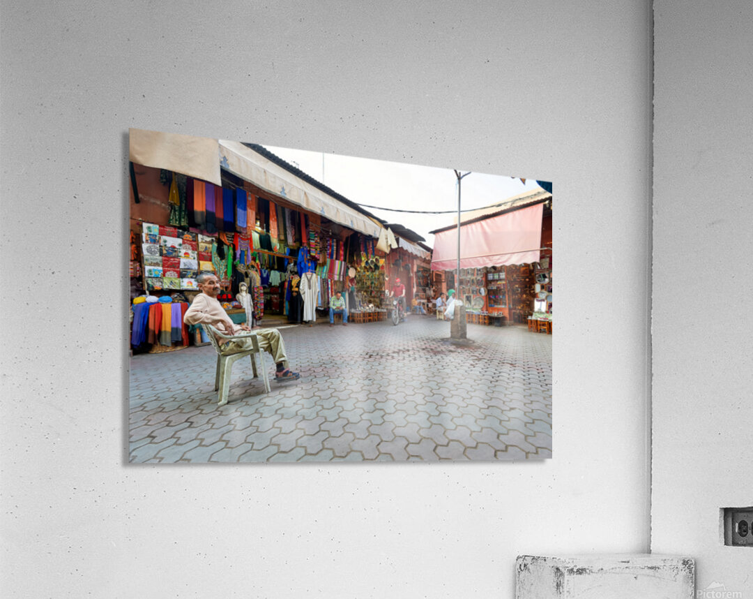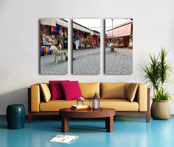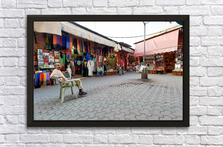 In the Medina of Marrakesh people sit and shop among colorful displays of goods in a lively market setting.