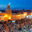 People gather in Djema el Fna square in Marrakesh as the sun sets enjoying the warm colors and vibrant atmosphere of the marketplace.