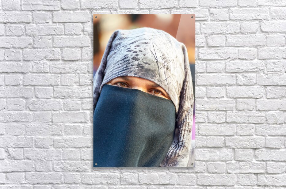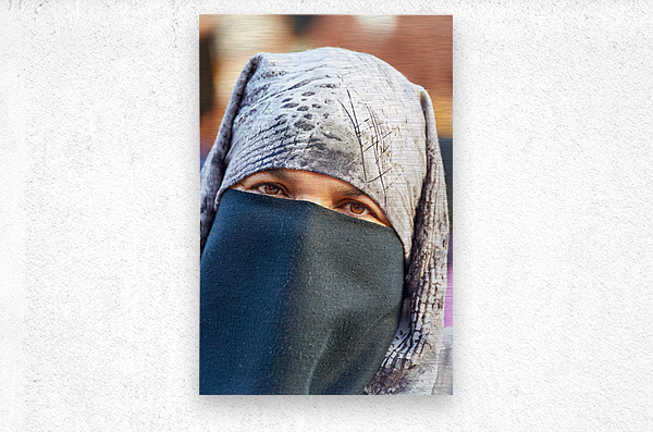 ABOUT THIS ARTWORK: VEILED MOROCCAN WOMAN IN MARRAKESH MARKET ON A SUNNY DAY