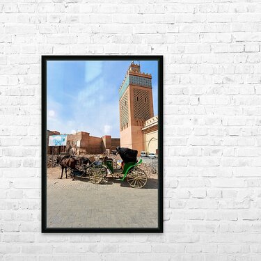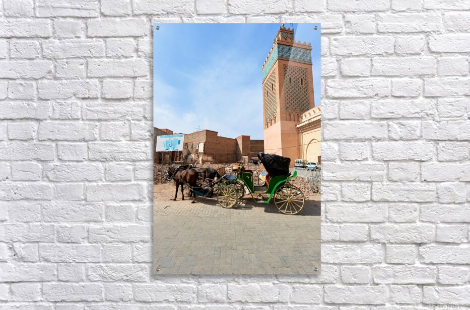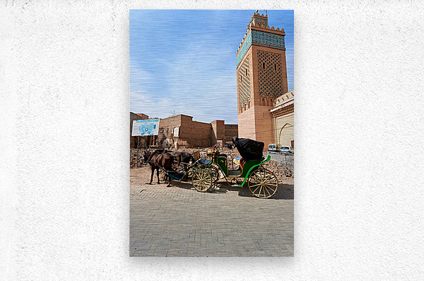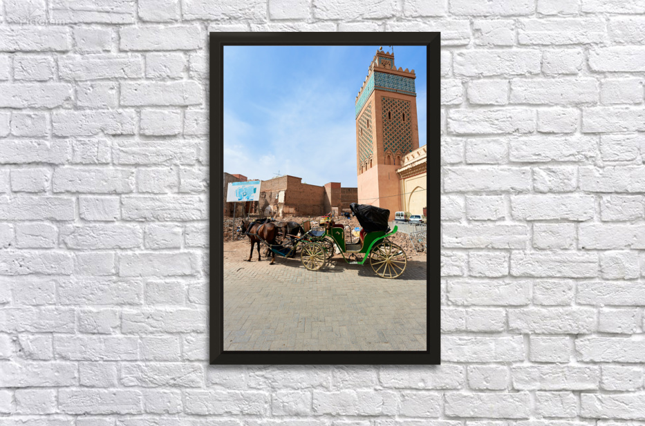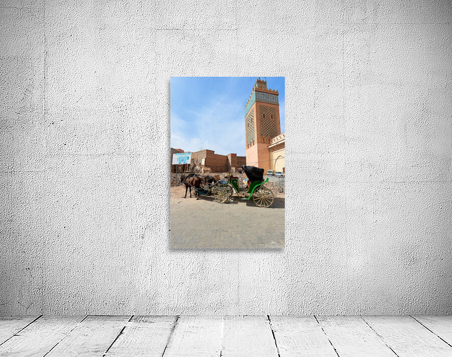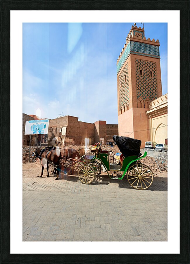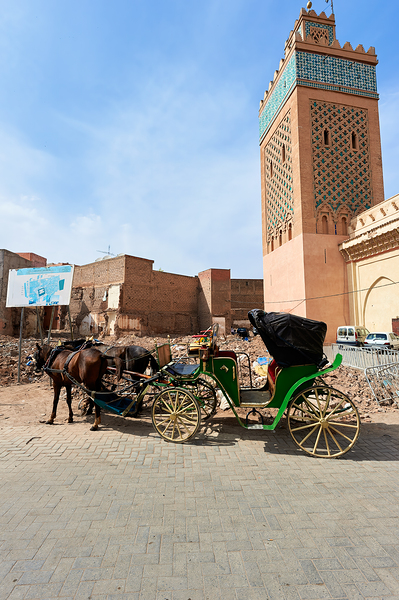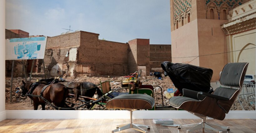 A horse carriage stands next to a tall building in old Marrakesh as the sun shines. The area shows signs of wear and activity.