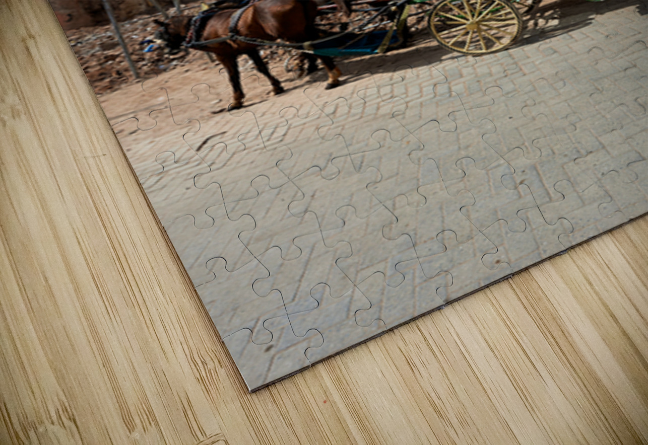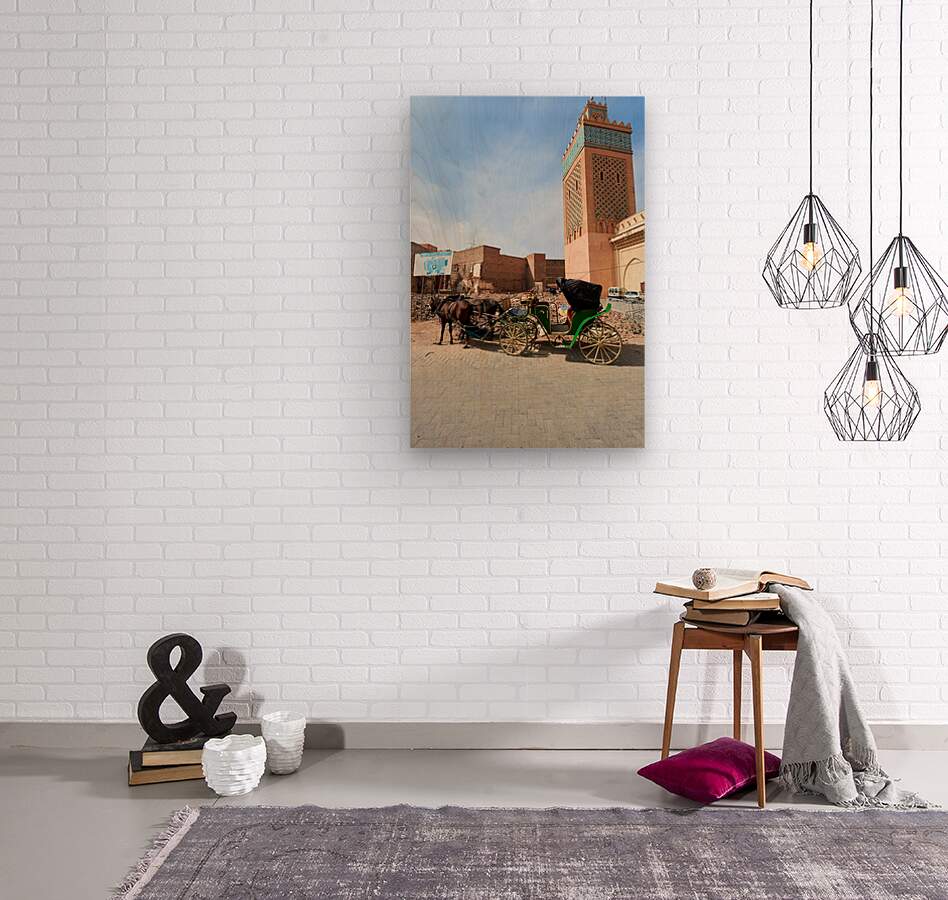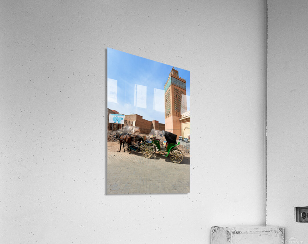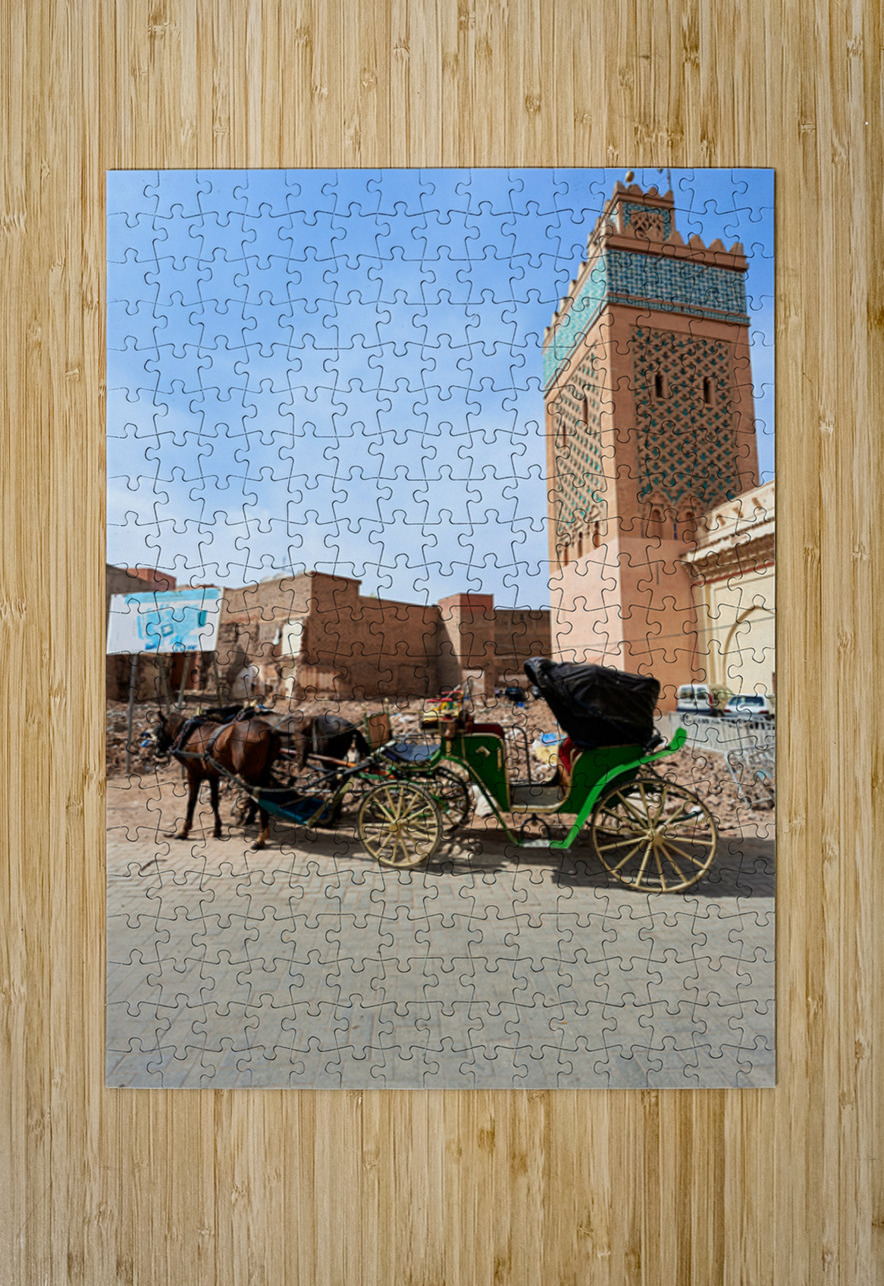 A horse carriage stands next to a tall building in old Marrakesh as the sun shines. The area shows signs of wear and activity.