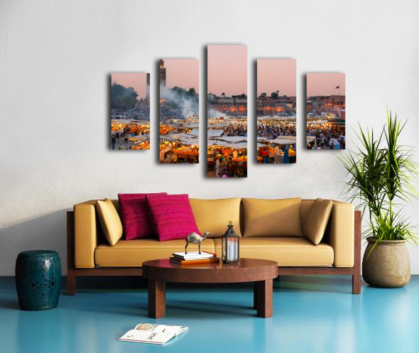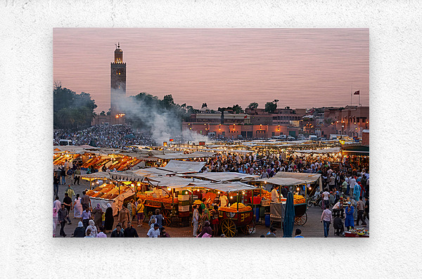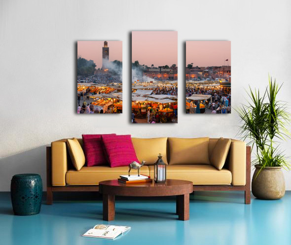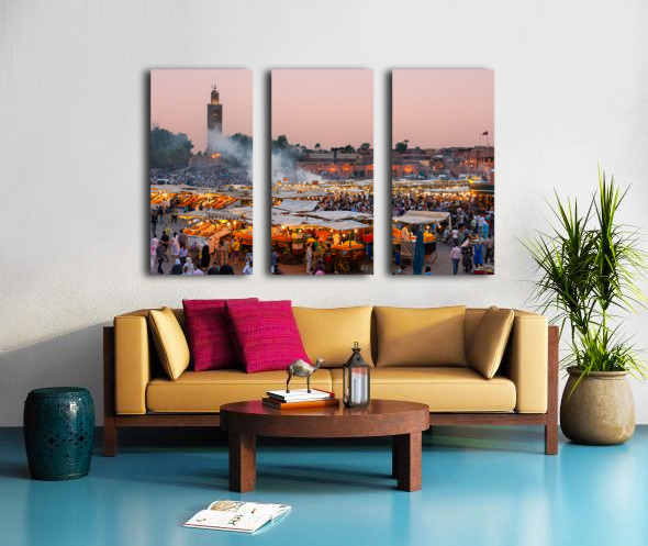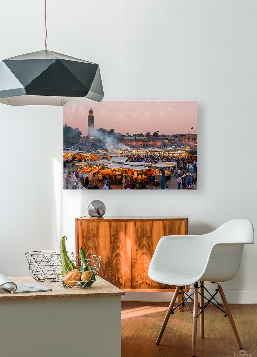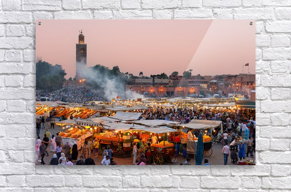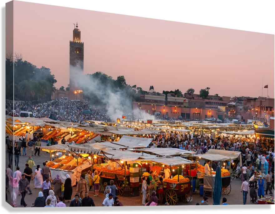 Get this artwork "Sunset at Djema el Fna square in Marrakesh Morocco" in a framed print.