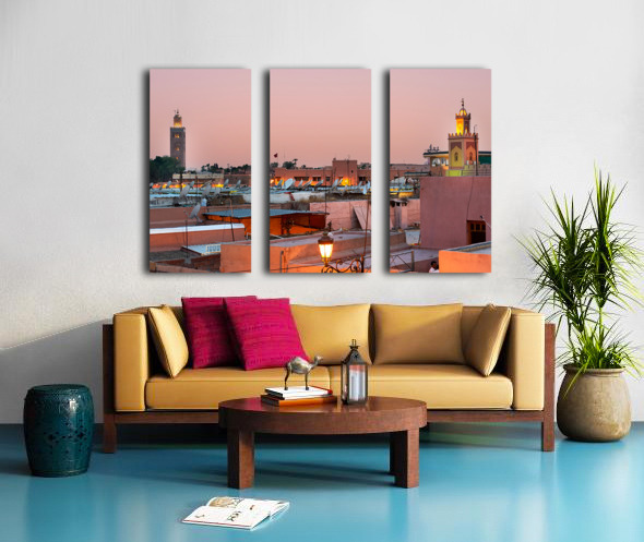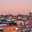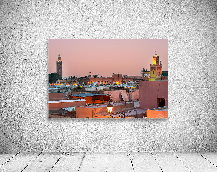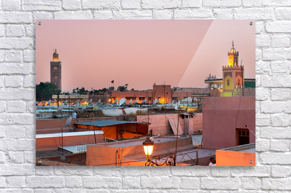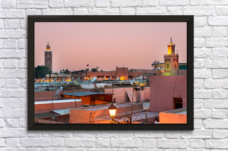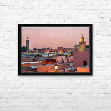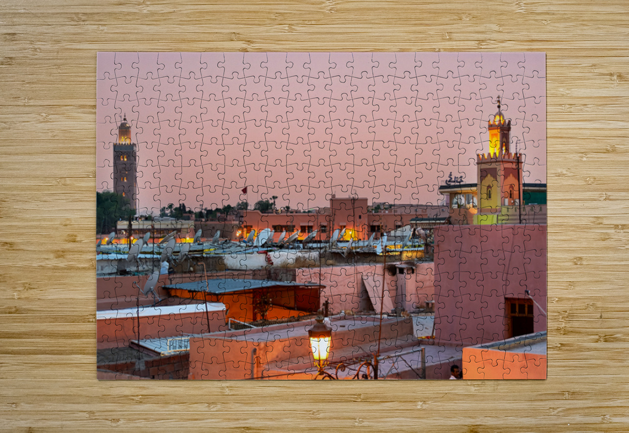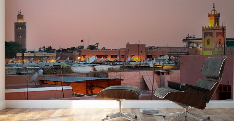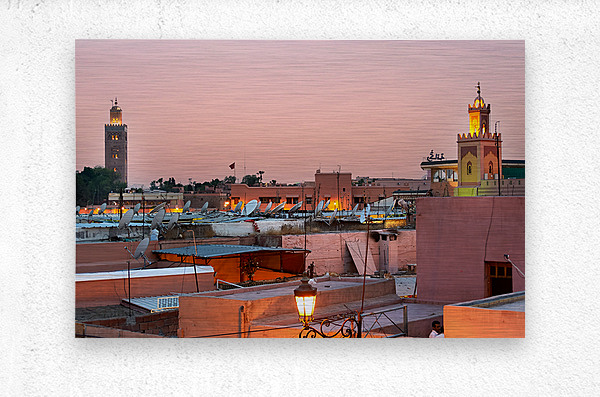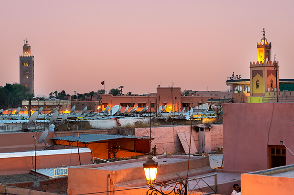 Marrakesh displays a cityscape at sunset. Buildings and minarets stand against the evening sky. Lights begin to glow in the distance.