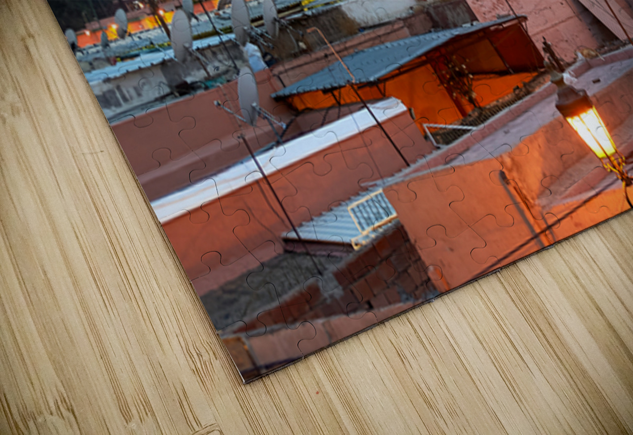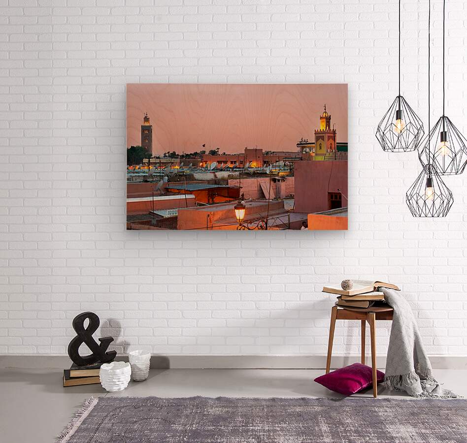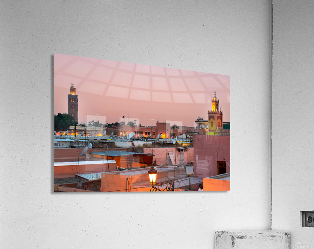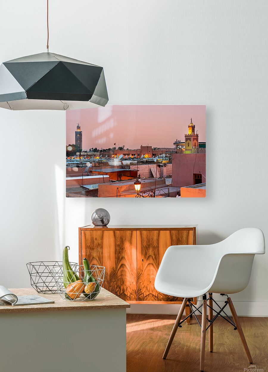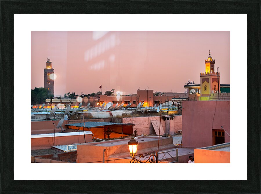 Marrakesh displays a cityscape at sunset. Buildings and minarets stand against the evening sky. Lights begin to glow in the distance.