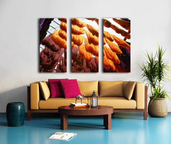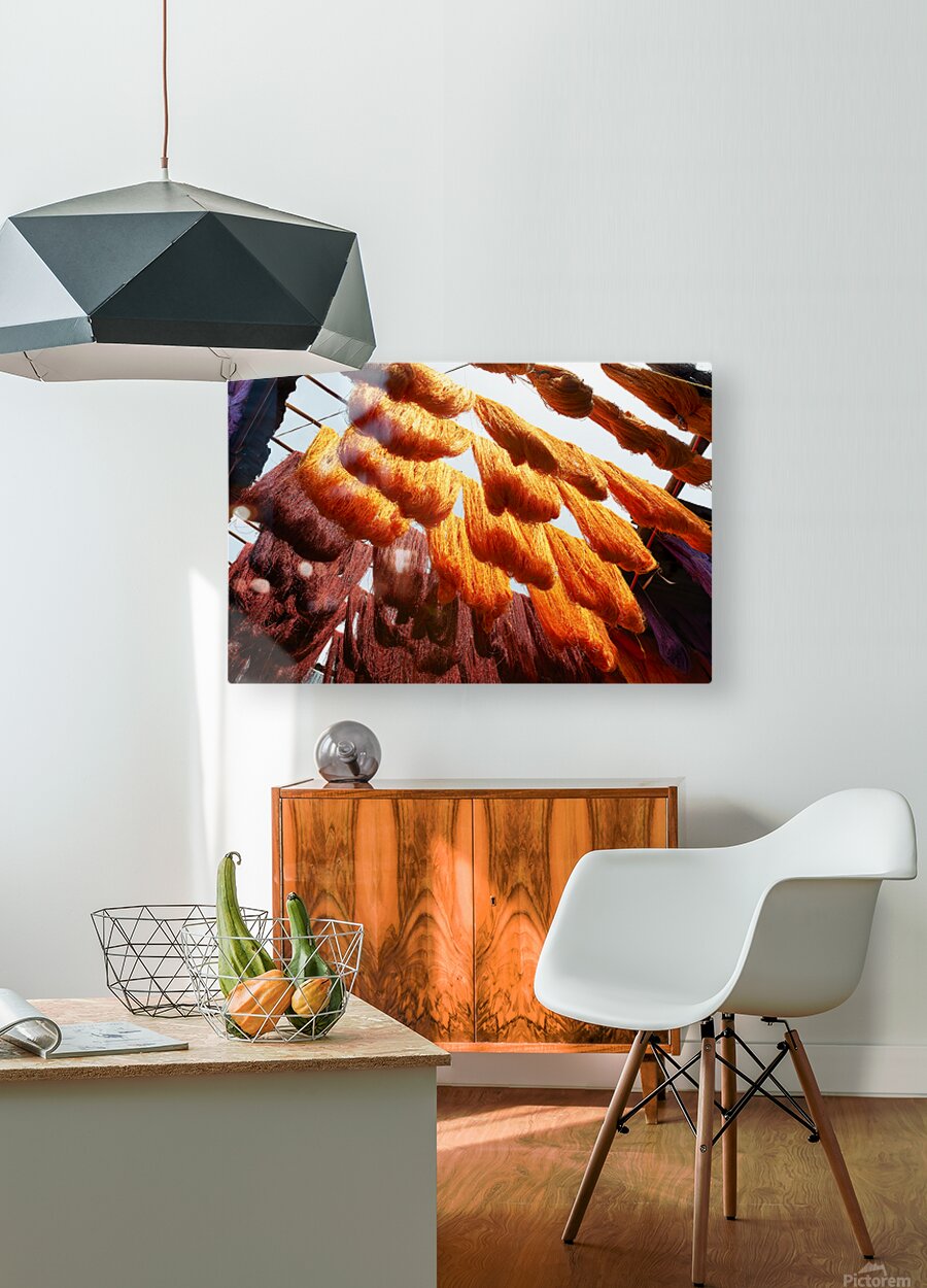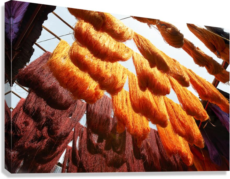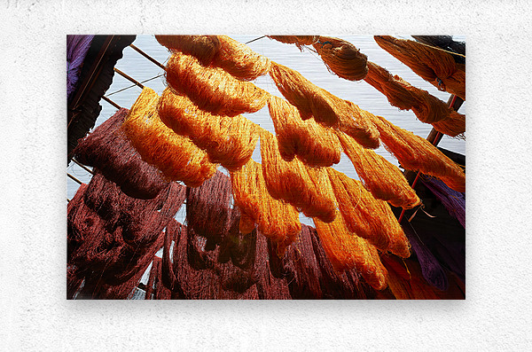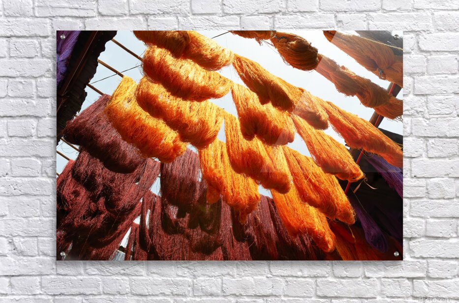 ABOUT THIS ARTWORK: COLORFUL THREADS HANGING IN THE DYERS SOUK OF MARRAKESH MOROCCO