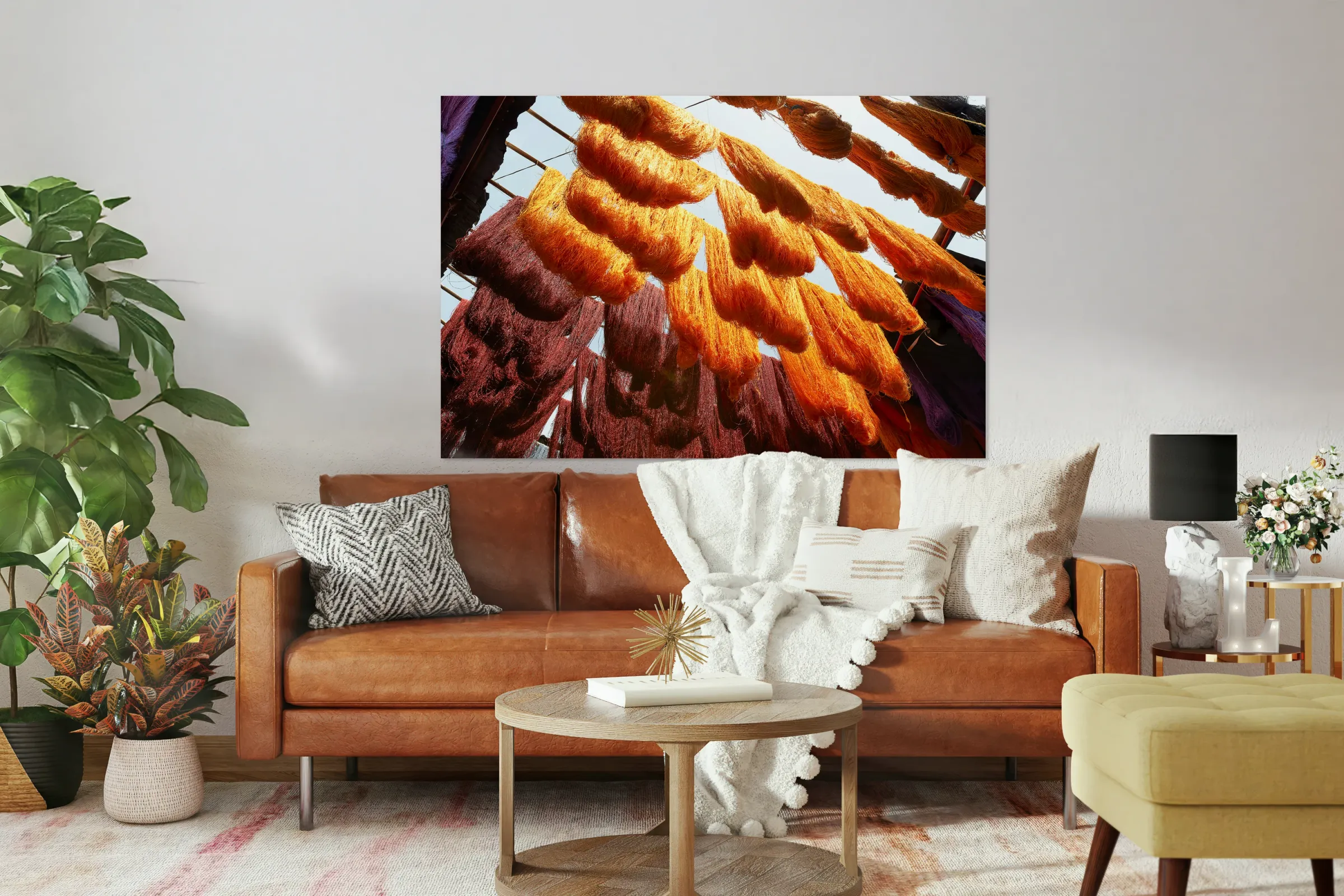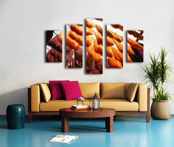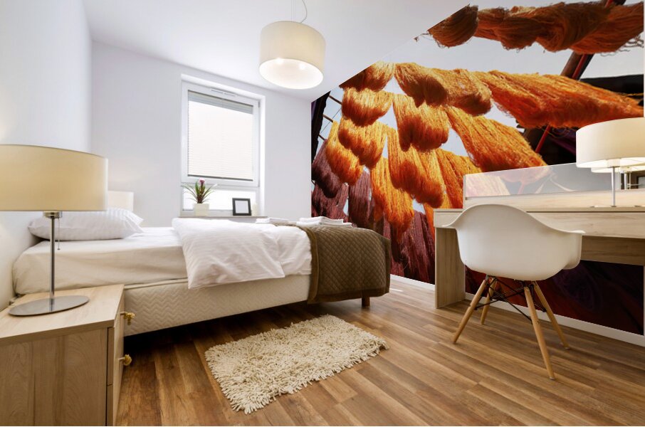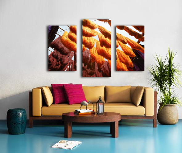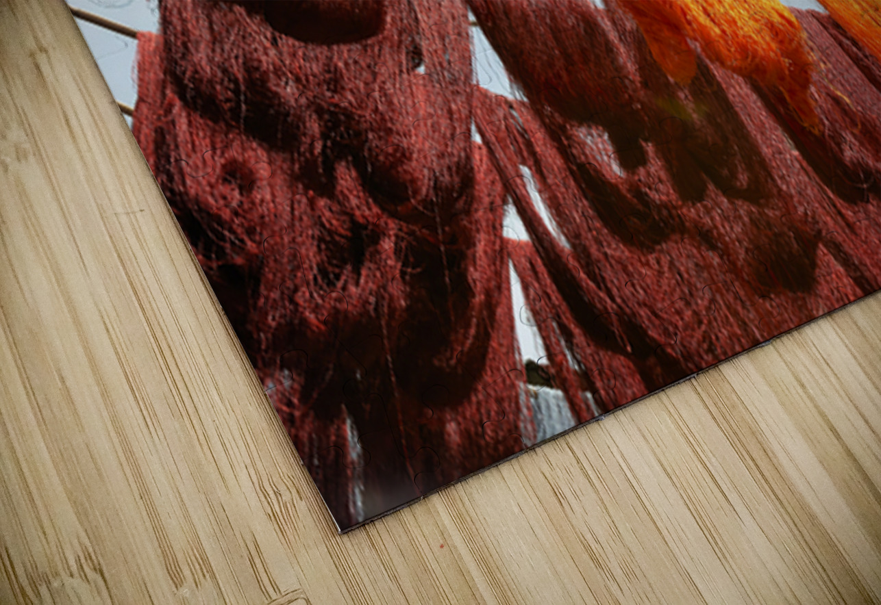 ABOUT THIS ARTWORK: COLORFUL THREADS HANGING IN THE DYERS SOUK OF MARRAKESH MOROCCO