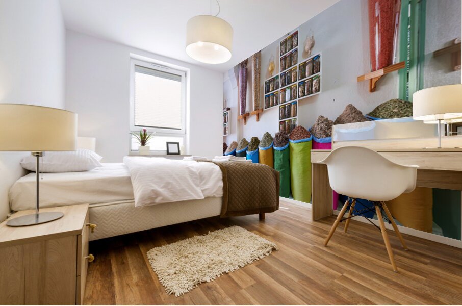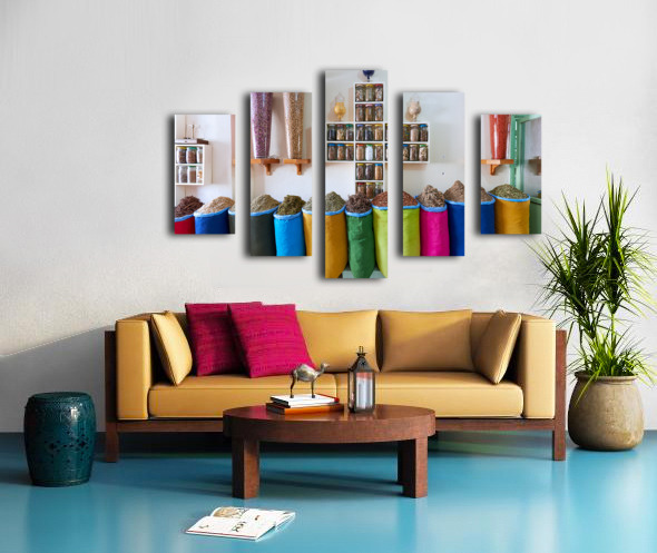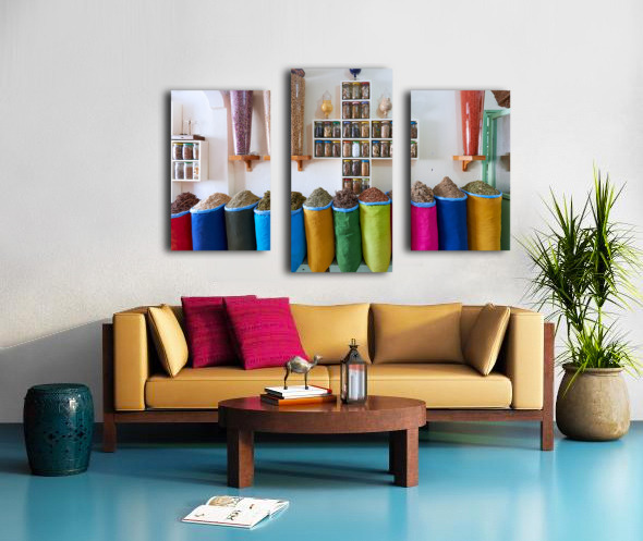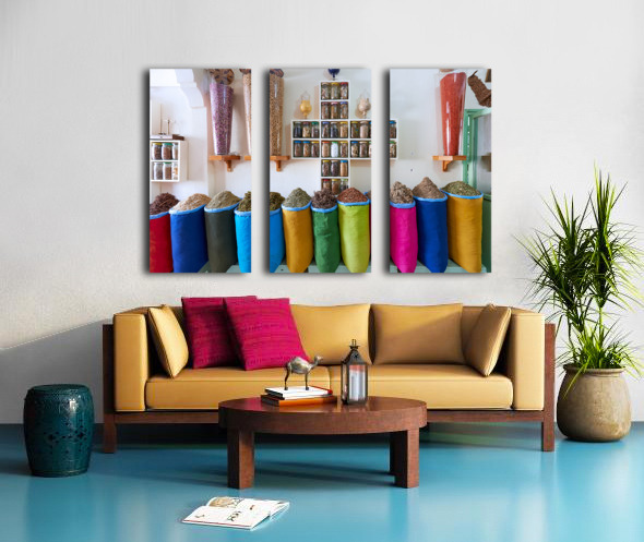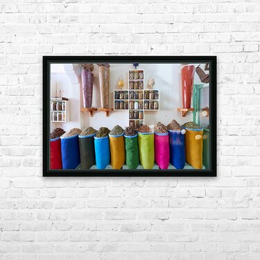 Get this artwork "Herbal remedy shop in Marrakesh showing colorful bags of herbs" in a framed print.