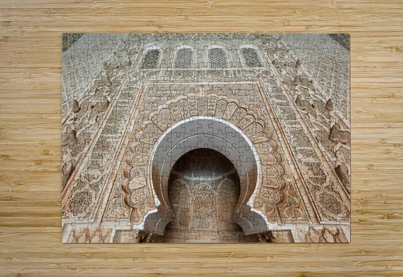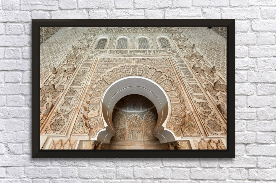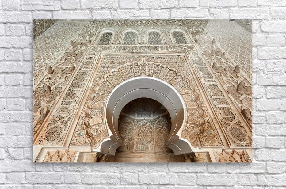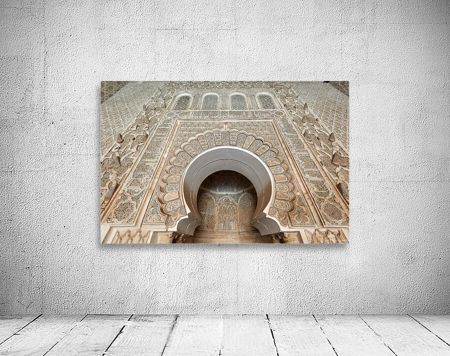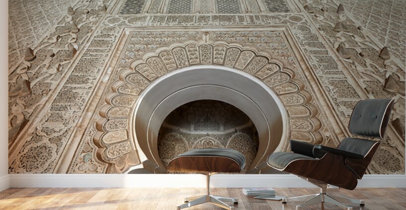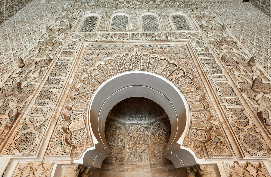 Visitors explore the detailed carvings and patterns in Madrasa Ben Youssef in Marrakesh Morocco highlighting the historical Islamic design.