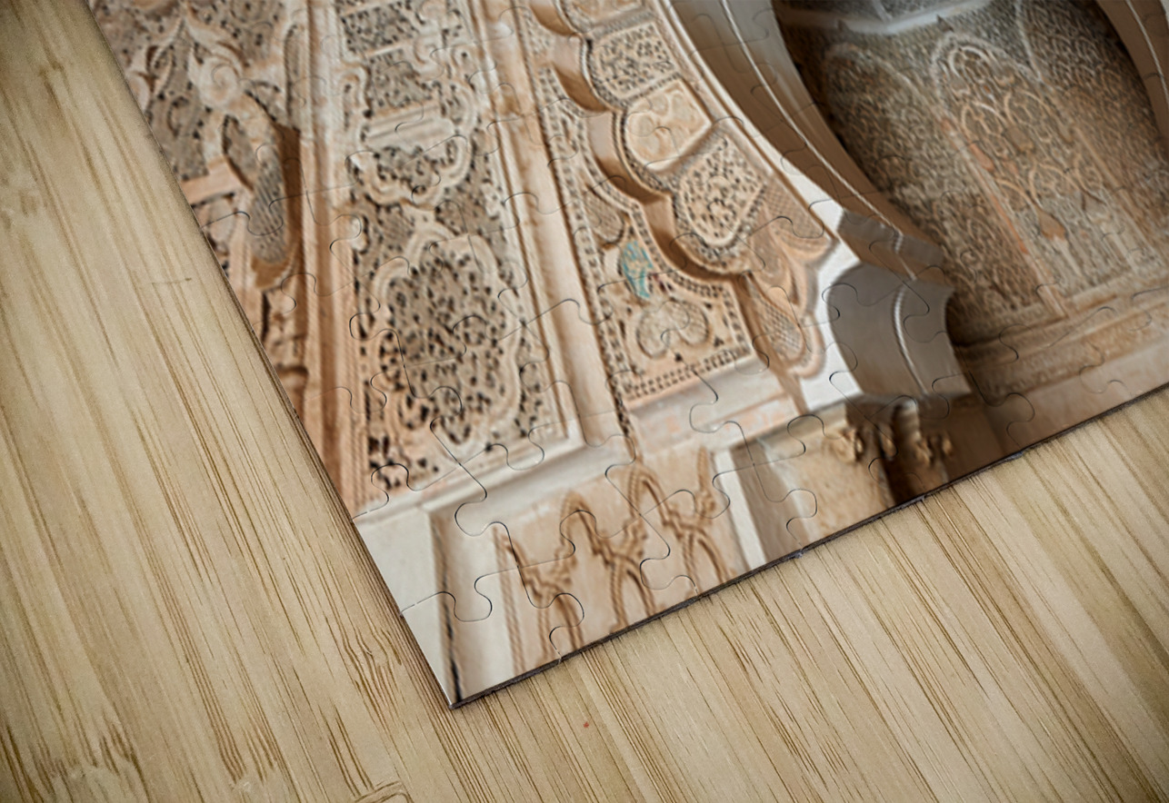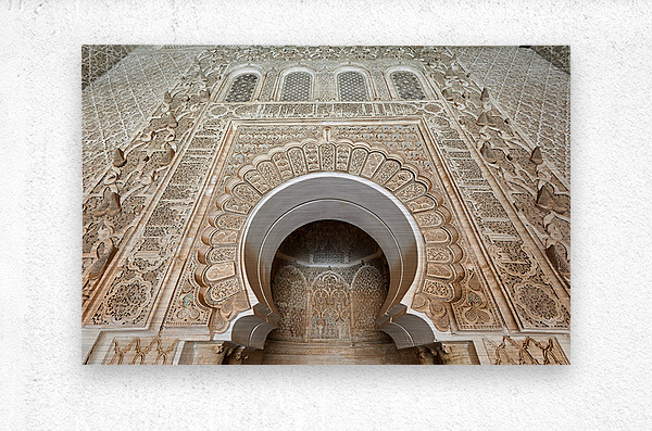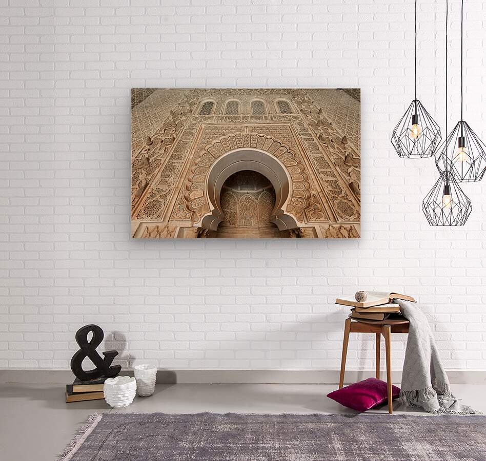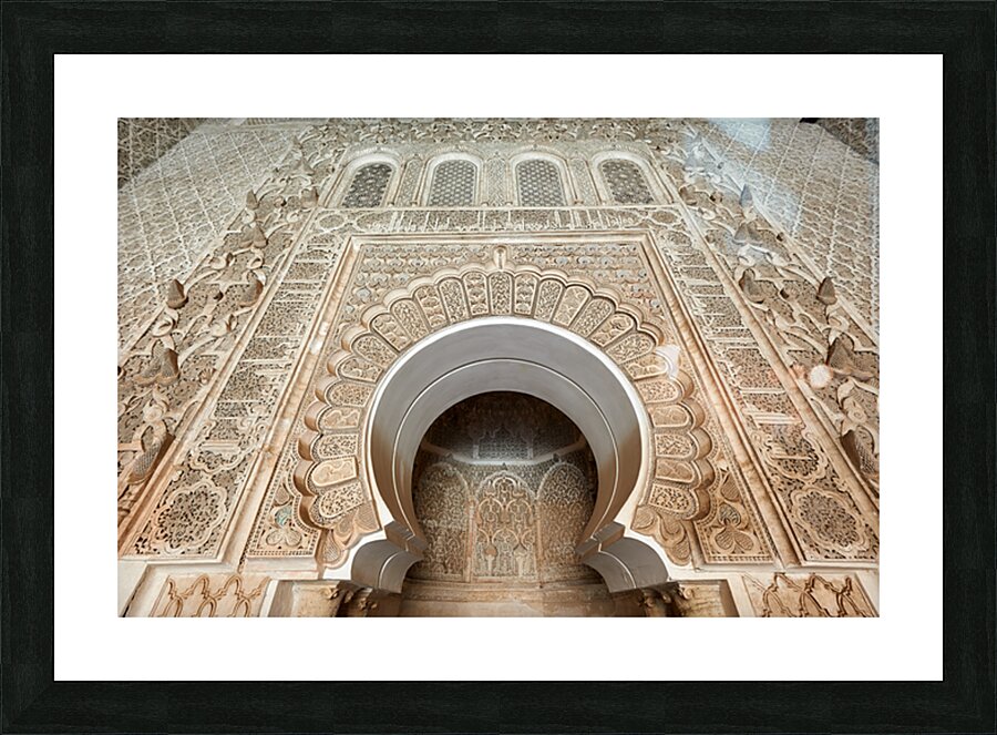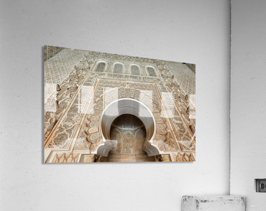 Visitors explore the detailed carvings and patterns in Madrasa Ben Youssef in Marrakesh Morocco highlighting the historical Islamic design.
