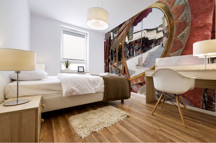 People walk in the busy souk of Marrakesh. Shops display traditional items like mirrors and textiles. The atmosphere is lively and vibrant.