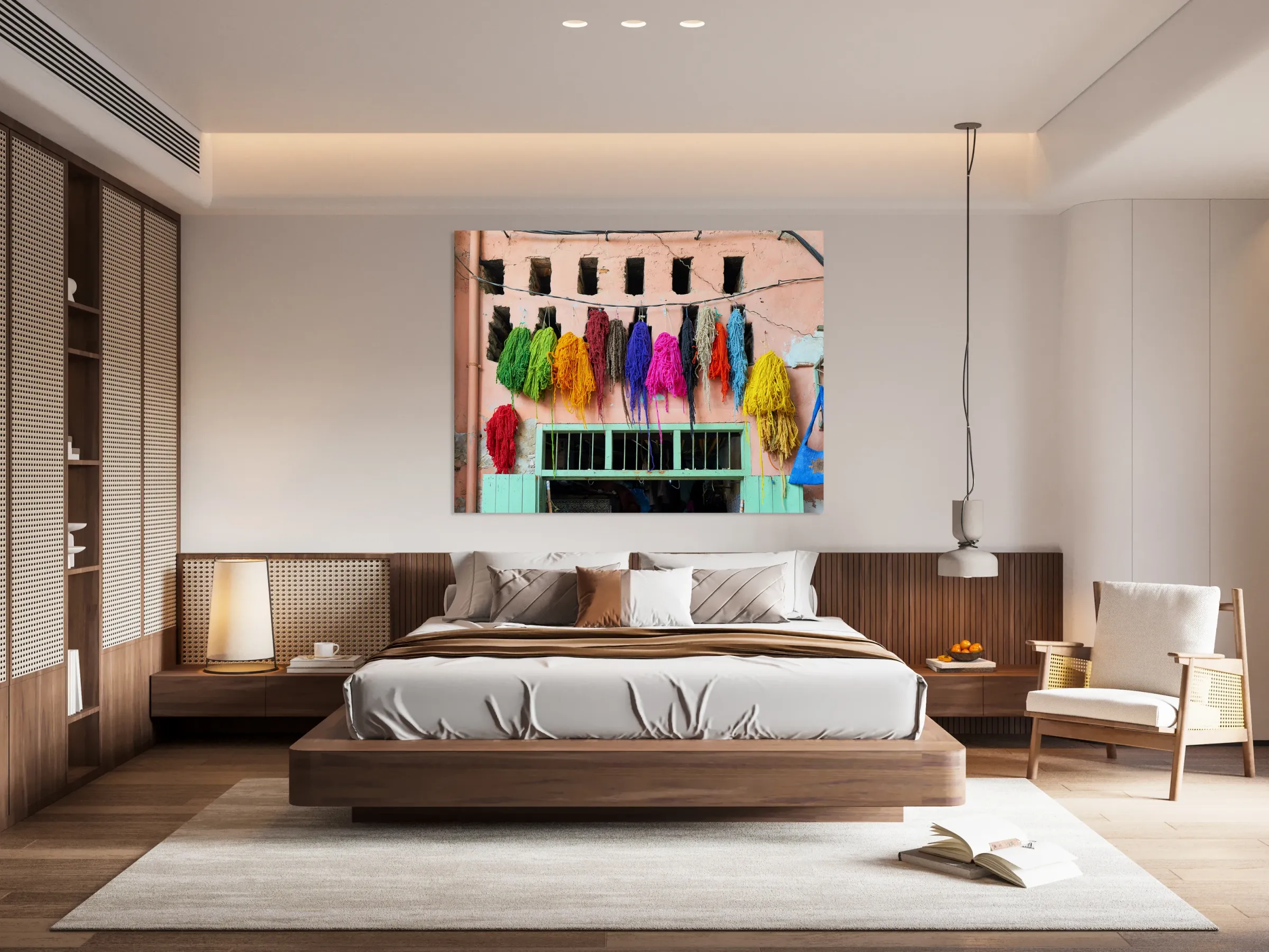ABOUT THIS ARTWORK: HANGING DYED THREADS IN THE DYERS SOUK OF MARRAKESH MOROCCO