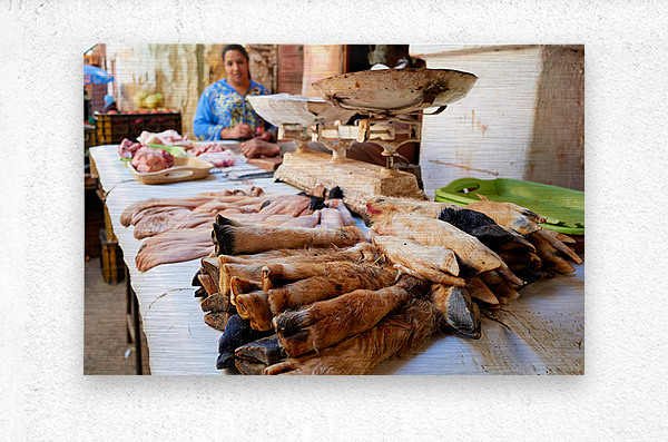 ABOUT THIS ARTWORK: BUTCHER WORKING IN MEKNES SOUK WITH VARIOUS CUTS OF MEAT