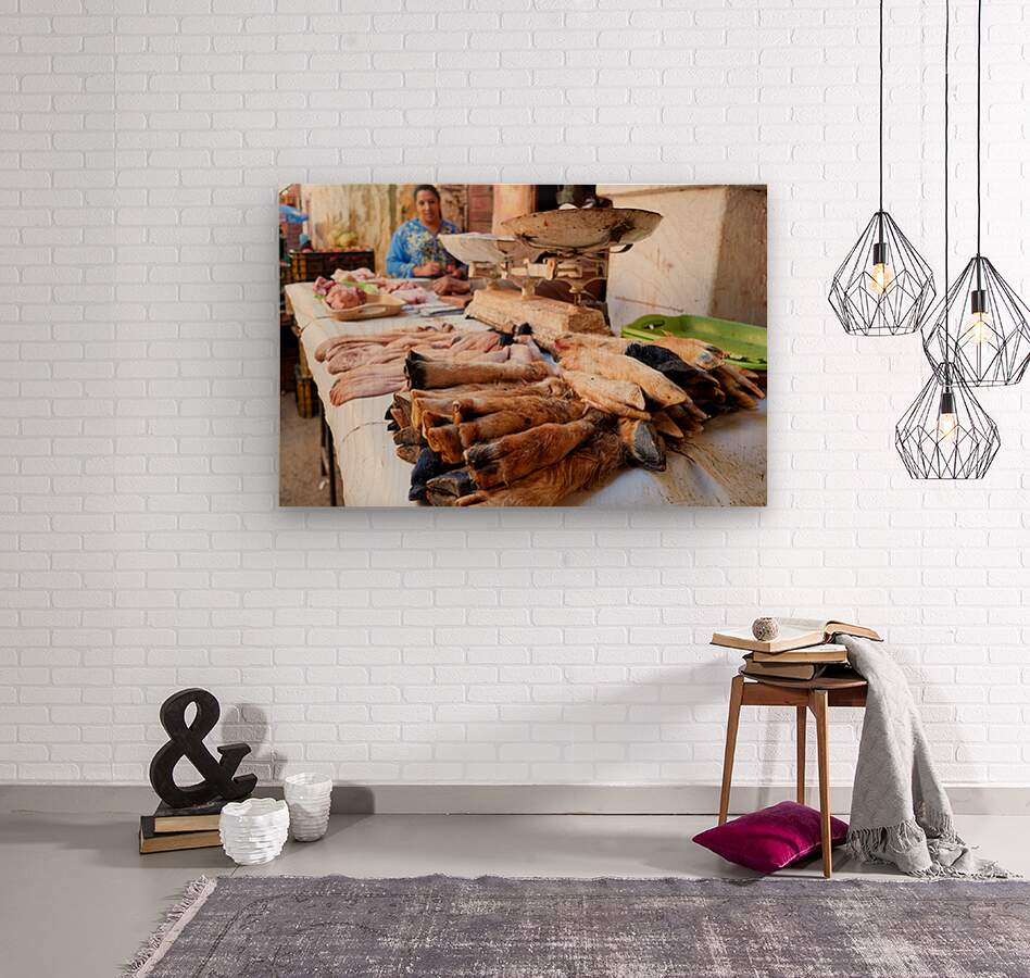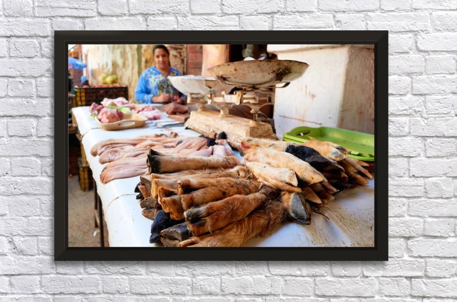 A butcher prepares different cuts of meat in the busy souk of Meknes Morocco. The local market is full of fresh products and activities.