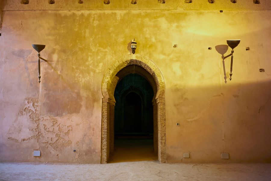 Visitors walk through the entrance of the Royal Stables in Meknes. The architectural details stand out in the light.