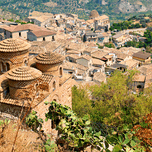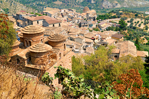 Cattolica di Stilo stands atop a hill in Calabria Italy with village homes stretching below. The sun brightens the historic area.