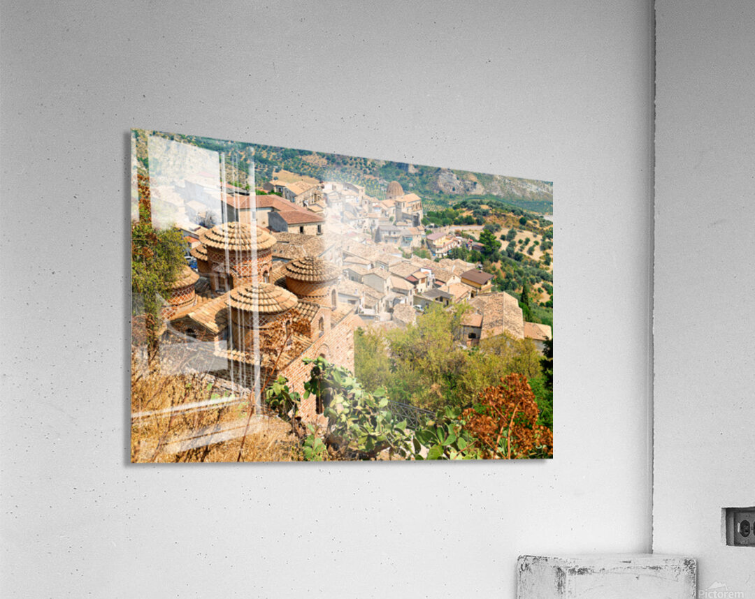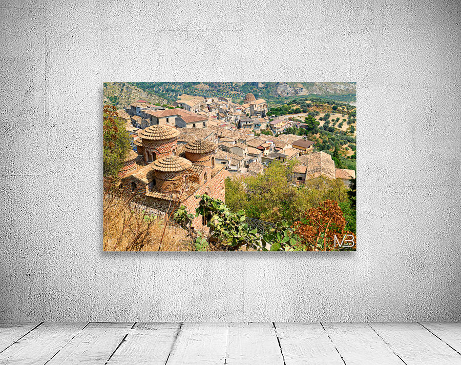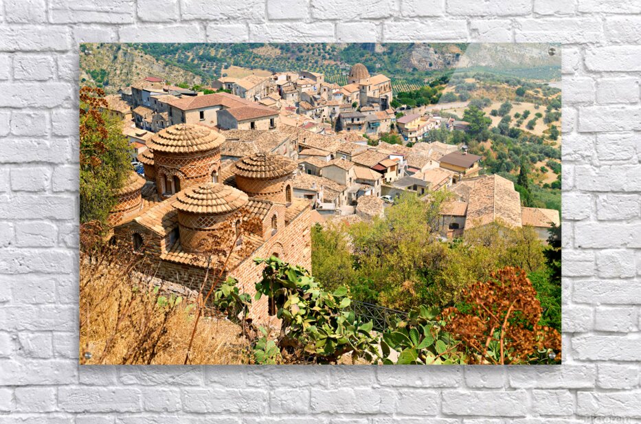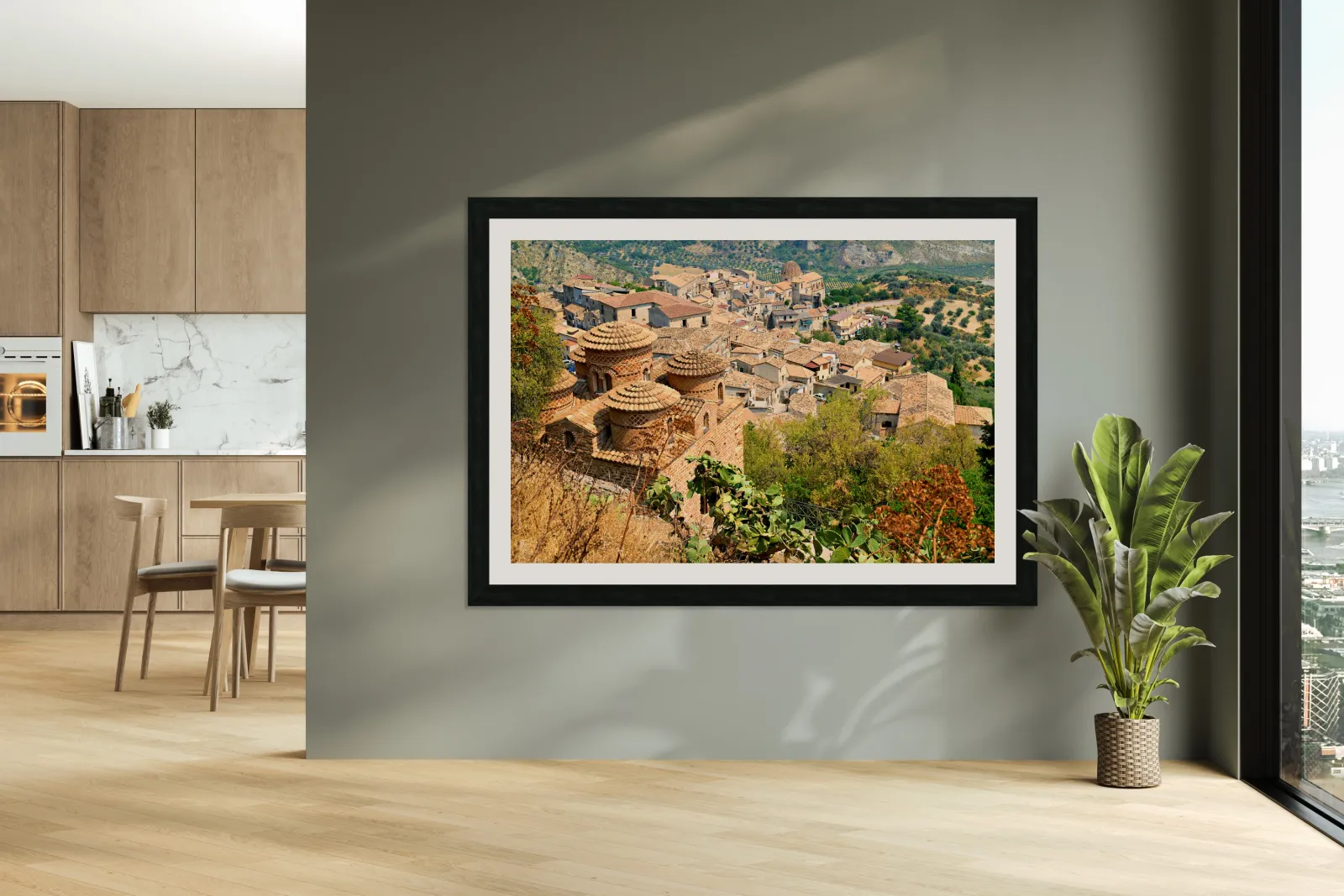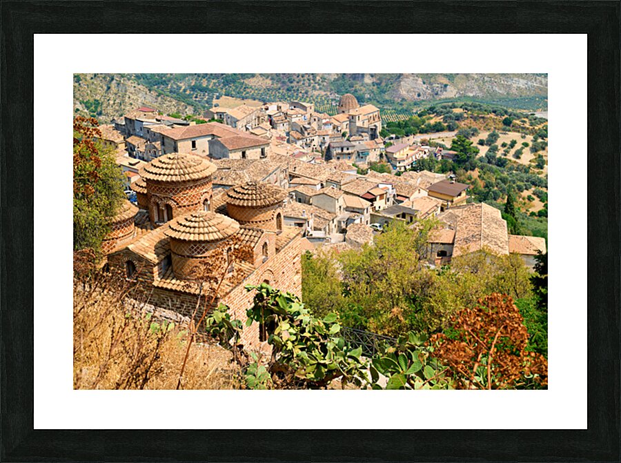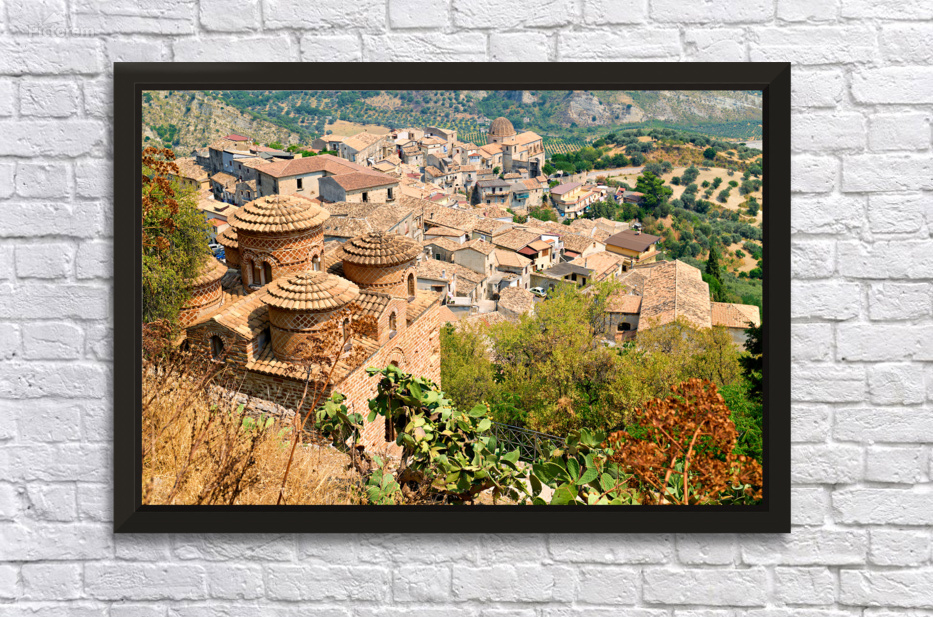 "Cattolica di Stilo church and surrounding village in Calabria I" in a framed print.